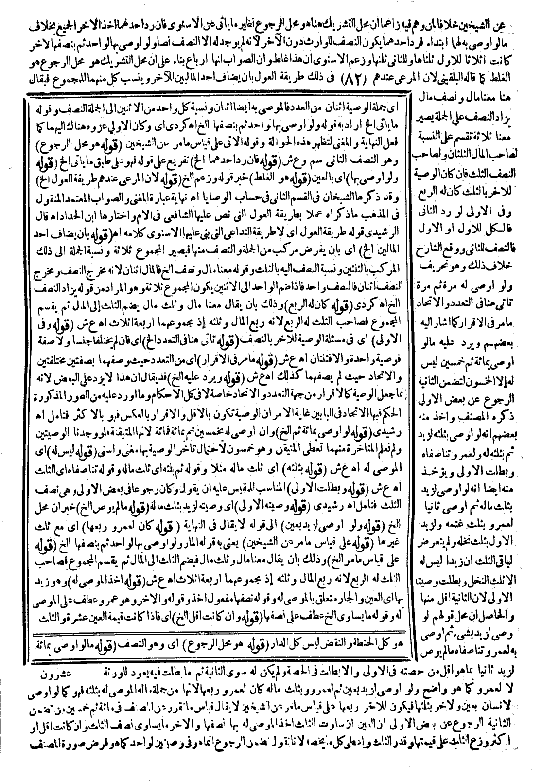 عَنْ الشَّيْخَيْنِ خِلَافًا لِمَنْ وَهِمَ فِيهِ زَاعِمًا أَنَّ مَحَلَّ التَّشْرِيكِ هُنَا هُوَ مَحَلُّ الرُّجُوعِ نَظِيرُ مَا يَأْتِي عَنْ الْإِسْنَوِيِّ فَإِنْ رَدَّ أَحَدُهُمَا أَخَذَ الْآخَرُ الْجَمِيعَ بِخِلَافِ مَا لَوْ أَوْصَى بِهِ لَهُمَا ابْتِدَاءً فَرَدَّ أَحَدُهُمَا يَكُونُ النِّصْفُ لِلْوَارِثِ دُونَ الْآخَرِ؛ لِأَنَّهُ لَمْ يُوجَدْ لَهُ إلَّا النِّصْفُ نَصًّا، وَلَوْ أَوْصَى بِهَا لِوَاحِدٍ ثُمَّ بِنِصْفِهَا لِآخَرَ كَانَتْ أَثْلَاثًا لِلْأَوَّلِ ثُلُثَاهَا وَلِلثَّانِي ثُلُثُهَا، وَزَعَمَ الْإِسْنَوِيُّ أَنَّ هَذَا غَلَطٌ، وَأَنَّ الصَّوَابَ أَنَّهَا أَرْبَاعٌ بِنَاءً عَلَى أَنَّ مَحَلَّ التَّشْرِيكِ هُوَ مَحَلُّ الرُّجُوعِ هُوَ الْغَلَطُ كَمَا قَالَهُ الْبُلْقِينِيُّ؛ لِأَنَّ الْمَرْعِيَّ عِنْدَهُمْ فِي ذَلِكَ طَرِيقَةُ الْعَوْلِ بِأَنْ يُضَافَ أَحَدُ الْمَالَيْنِ لِلْآخَرِ، وَيُنْسَبُ كُلٌّ مِنْهُمَا لِلْمَجْمُوعِ فَيُقَالُ هُنَا مَعَنَا مَالٌ وَنِصْفُ مَالٍ يُزَادُ النِّصْفُ عَلَى الْجُمْلَةِ يَصِيرُ مَعَنَا ثَلَاثَةٌ تُقْسَمُ عَلَى النِّسْبَةِ لِصَاحِبِ الْمَالِ الثُّلُثَانِ وَلِصَاحِبِ النِّصْفِ الثُّلُثُ فَإِنْ كَانَ الْوَصِيَّةُ لِلْآخَرِ بِالثُّلُثِ كَانَ لَهُ الرُّبُعُ وَفِي الْأَوَّلِ لَوْ رَدَّ الثَّانِيَ فَالْكُلُّ لِلْأَوَّلِ أَوْ الْأَوَّلَ فَالنِّصْفُ لِلثَّانِي، وَوَقَعَ لِشَارِحٍ خِلَافُ ذَلِكَ وَهُوَ تَحْرِيفٌ.