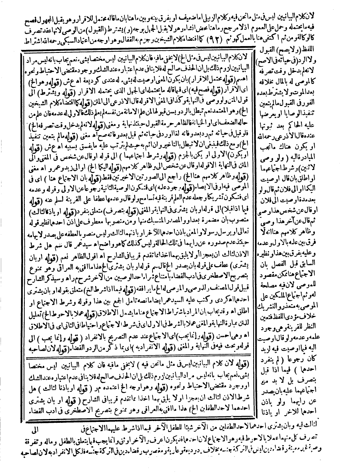 ؛ لِأَنَّ كَلَامَ الْبَيَانِيِّينَ لَيْسَ فِي مِثْلِ مَا نَحْنُ فِيهِ وَكَلَامُ الزَّبِيلِيَّ إمَّا ضَعِيفٌ أَوْ يُفَرَّقُ بَيْنَهُ وَبَيْنَ مَا هُنَا بِأَنَّ مَا قَالَهُ مُحْتَمِلٌ لِلْإِقْرَارِ وَهُوَ يَقْبَلُ الْمَجْهُولَ فَصَحَّ فِيهِ مَا يَحْتَمِلُهُ وَحُمِلَ عَلَى الْعُمُومِ إذْ لَا مُرَجِّحَ وَمَا هُنَا مَحْضُ إنْشَاءٍ وَهُوَ لَا يَقْبَلُ الْجَهْلَ بِوَجْهٍ (وَ) يُشْتَرَطُ (الْقَبُولُ) مِنْ الْوَصِيِّ؛ لِأَنَّهَا عَقْدُ تَصَرُّفٍ كَالْوَكَالَةِ وَمِنْ ثَمَّ اُكْتُفِيَ هُنَا بِالْعَمَلِ كَهُوَ ثَمَّ كَمَا اقْتَضَاهُ كَلَامُ الشَّيْخَيْنِ وَجَزَمَ بِهِ الْقَفَّالُ وَهُوَ أَوْجَهُ مِنْ اعْتِمَادِ السُّبْكِيّ - رَحِمَهُ اللَّهُ - اشْتِرَاطَ اللَّفْظِ (وَلَا يَصِحُّ) الْقَبُولُ وَلَا الرَّدُّ (فِي حَيَاتِهِ فِي الْأَصَحِّ) ؛ لِأَنَّهُ لَمْ يَدْخُلْ وَقْتَ تَصَرُّفِهِ كَالْمُوصَى لَهُ بِالْمَالِ بِخِلَافِهِ بَعْدَ الْمَوْتِ وَلَا يُشْتَرَطُ بَعْدَهُ الْفَوْرُ فِي الْقَبُولِ مَا لَمْ يَتَعَيَّنْ تَنْفِيذُ الْوَصَايَا أَوْ يَعْرِضَهَا عَلَيْهِ الْحَاكِمُ بَعْدَ ثُبُوتِهَا عِنْدَهُ قَالَ الْأَذْرَعِيُّ - رَحِمَهُ اللَّهُ - أَوْ يَكُونُ هُنَاكَ مَا تَجِبُ الْمُبَادَرَةُ إلَيْهِ