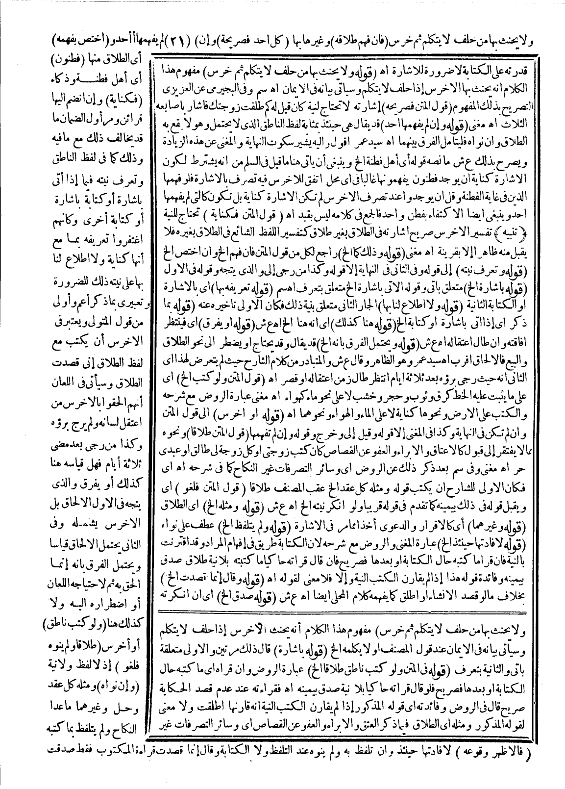(قَوْلُهُ: وَلَا يَحْنَثُ بِهَا مَنْ حَلَفَ لَا يَتَكَلَّمُ ثُمَّ خَرِسَ) مَفْهُومُ هَذَا الْكَلَامِ أَنَّهُ يَحْنَثُ بِهَا الْأَخْرَسُ إذَا حَلَفَ لَا يَتَكَلَّمُ وَسَيَأْتِي بَيَانُهُ فِي الْأَيْمَانِ. اهـ. سم وَفِي الْبُجَيْرَمِيِّ عَنْ الْعَزِيزِيِّ التَّصْرِيحُ بِذَلِكَ الْمَفْهُومِ (قَوْلُ الْمَتْنِ فَصَرِيحَةٌ) إشَارَتُهُ لَا تَحْتَاجُ لِنِيَّةٍ كَإِنْ قِيلَ لَهُ كَمْ طَلَّقْت زَوْجَتَك فَأَشَارَ بِأَصَابِعِهِ الثَّلَاثِ. اهـ. مُغْنِي (قَوْلُهُ: وَإِنْ لَمْ يَفْهَمْهَا أَحَدٌ) قَدْ يُقَالُ هِيَ حِينَئِذٍ بِمَثَابَةِ لَفْظِ النَّاطِقِ الَّذِي لَا يَحْتَمِلُ الطَّلَاقَ، وَهُوَ لَا يَقَعُ بِهِ الطَّلَاقُ، وَإِنْ نَوَاهُ فَلْيُتَأَمَّلْ الْفَرْقُ بَيْنَهُمَا. اهـ. سَيِّدُ عُمَرَ أَقُولُ، وَإِلَيْهِ يُشِيرُ سُكُوتُ النِّهَايَةِ وَالْمُغْنِي عَنْ هَذِهِ الزِّيَادَةِ، وَيُصَرِّحُ بِذَلِكَ قَوْلُ ع ش مَا نَصُّهُ قَوْلُهُ: أَيْ أَهْلُ فِطْنَةٍ إلَخْ، وَيَنْبَغِي أَنْ يَأْتِيَ هُنَا مَا قِيلَ فِي السَّلَمِ مِنْ أَنَّهُ يُشْتَرَطُ لِكَوْنِ الْإِشَارَةِ كِنَايَةً أَنْ يُوجَدَ فَطِنُونِ يَفْهَمُونَهَا غَالِبًا فِي أَيِّ مَحَلٍّ اتَّفَقَ لِلْأَخْرَسِ فِيهِ تَصَرُّفٌ بِالْإِشَارَةِ فَلَوْ فَهِمَهَا الَّذِينَ فِي غَايَةِ الْفِطْنَةِ وَقَلَّ أَنْ يُوجَدُوا عِنْدَ تَصَرُّفِ الْأَخْرَسِ لَمْ تَكُنْ الْإِشَارَةُ كِنَايَةً بَلْ تَكُونُ كَاَلَّتِي لَمْ يَفْهَمْهَا أَحَدٌ، وَيَنْبَغِي أَيْضًا الِاكْتِفَاءُ بِفَطِنٍ وَاحِدٍ فَالْجَمْعُ فِي كَلَامِهِ لَيْسَ بِقَيْدٍ. اهـ.