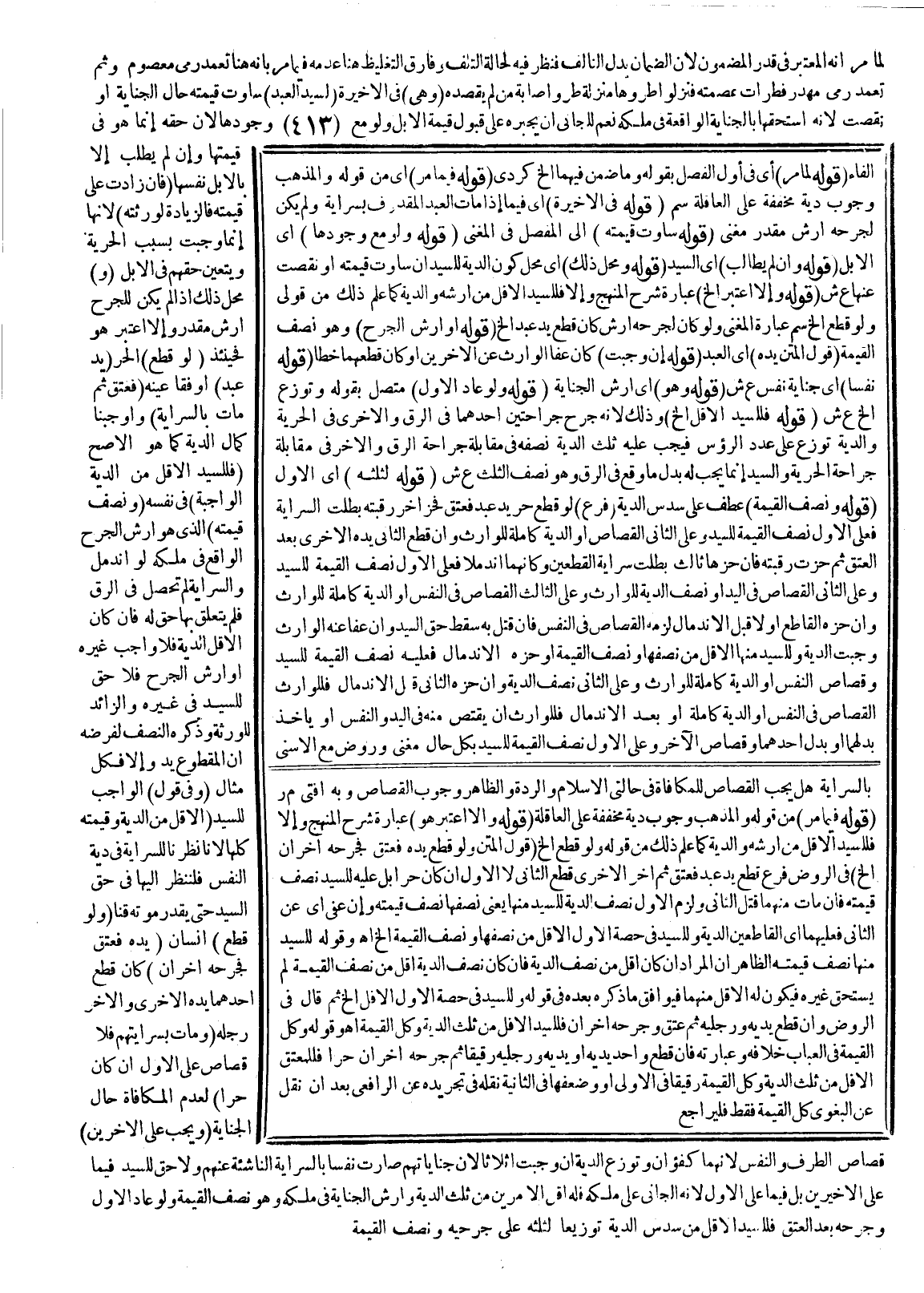 وَقَوْلُهُ وَكُلِّ الْقِيمَةِ فِي الْعُبَابِ خِلَافُهُ وَعِبَارَتُهُ فَإِنْ قَطَعَ وَاحِدٌ يَدَيْهِ أَوْ يَدَيْهِ وَرِجْلَيْهِ رَقِيقًا ثُمَّ جَرَحَهُ آخَرَانِ حُرًّا فَلِلْمُعْتِقِ الْأَقَلُّ مِنْ ثُلُثِ الدِّيَةِ وَكُلُّ الْقِيمَةِ رَقِيقًا فِي الْأُولَى أَوْ وَضِعْفُهَا فِي الثَّانِيَةِ نَقَلَهُ فِي تَجْرِيدِهِ عَنْ الرَّافِعِيِّ بَعْدَ أَنْ نَقَلَ عَنْ الْبَغَوِيّ كُلَّ الْقِيمَةِ فَقَطْ فَلْيُرَاجَعْ