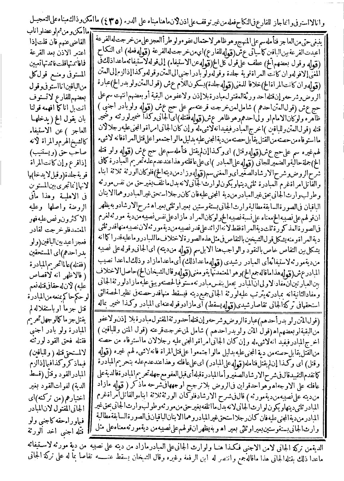 (قَوْلُ الْمَتْنِ وَلَوْ بَدَرَ أَحَدُهُمْ) شَامِلٌ لِمَنْ خَرَجَتْ قُرْعَتُهُ (قَوْلُ الْمَتْنِ وَلِلْبَاقِينَ) أَخْرَجَ الْمُبَادِرَ فَيُفِيدُ أَنَّهُ لَا شَيْءَ لَهُ، وَإِنْ كَانَ الْجَانِي امْرَأَةً وَالْمَجْنِيُّ عَلَيْهِ رَجُلًا؛ لِأَنَّ مَا اسْتَوْفَاهُ مِنْ حِصَّتِهِ مِنْ الْقَتْلِ يُقَابِلُ حِصَّتَهُ مِنْ دِيَةِ الْمَجْنِيِّ عَلَيْهِ بِدَلِيلِ مَا لَوْ اجْتَمَعُوا عَلَى قَتْلِ الْمَرْأَةِ فَإِنَّهُ لَا شَيْءَ لَهُمْ غَيْرُهُ (قَوْلُهُ وَقَتَلَ) أَيْ وَكَذَا إنْ لَمْ يَقْتُلْ فَتَأَمَّلْهُ.