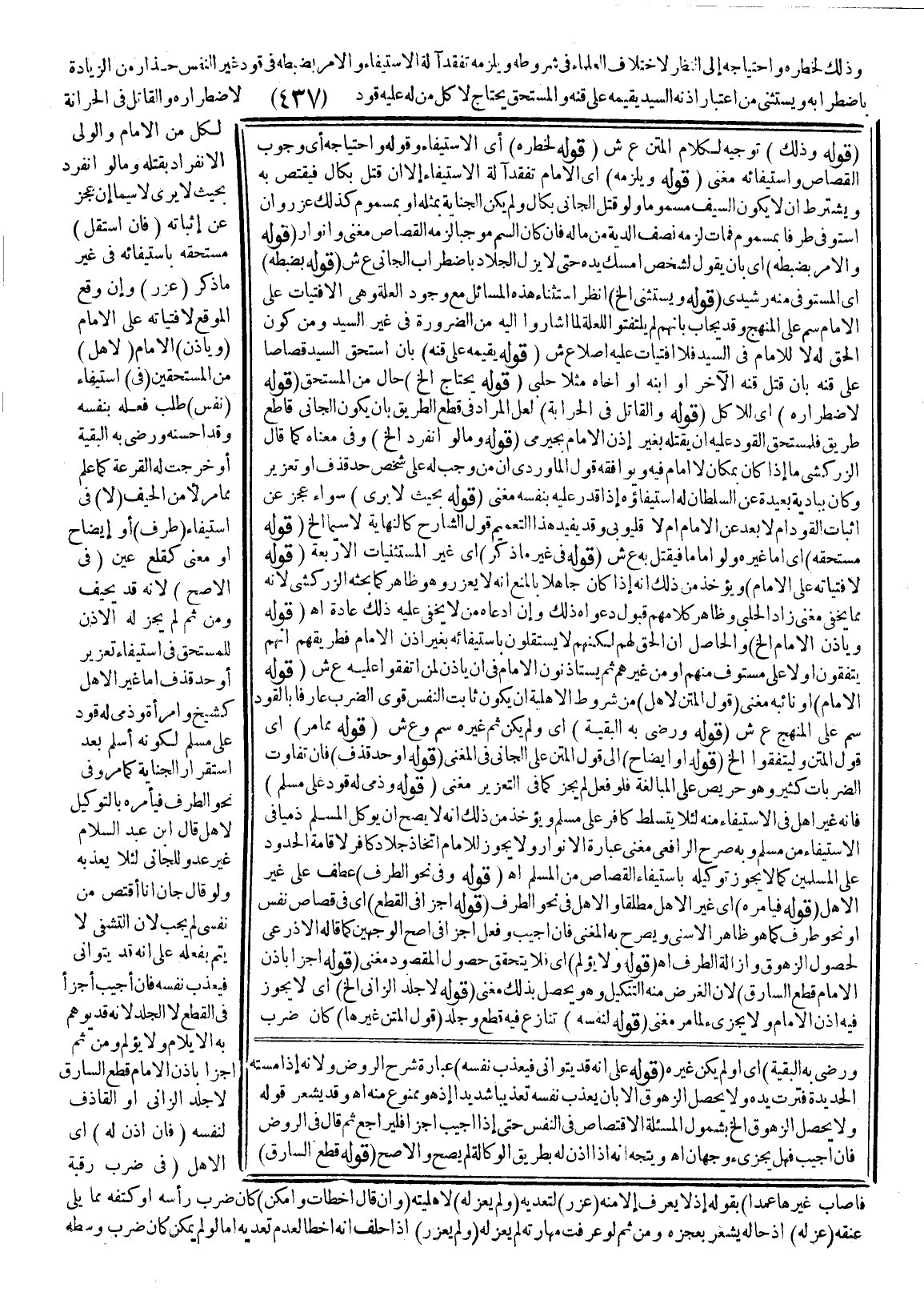 وَذَلِكَ لِخَطَرِهِ وَاحْتِيَاجِهِ إلَى النَّظَرِ لِاخْتِلَافِ الْعُلَمَاءِ فِي شُرُوطِهِ وَيَلْزَمُهُ تَفَقُّدُ آلَةِ الِاسْتِيفَاءِ وَالْأَمْرُ بِضَبْطِهِ فِي قَوَدِ غَيْرِ النَّفْسِ حَذَرًا مِنْ الزِّيَادَةِ بِاضْطِرَابِهِ وَيُسْتَثْنَى مِنْ اعْتِبَارِ إذْنِهِ السَّيِّدُ بِقَيِّمِهِ عَلَى قِنِّهِ وَالْمُسْتَحِقُّ يَحْتَاجُ لَا كُلُّ مَنْ لَهُ عَلَيْهِ قَوَدٌ لِاضْطِرَارِهِ وَالْقَاتِلُ فِي الْحِرَابَةِ لِكُلٍّ مِنْ الْإِمَامِ وَالْوَلِيِّ الِانْفِرَادُ بِقَتْلِهِ وَمَا لَوْ انْفَرَدَ بِحَيْثُ لَا يُرَى لَا سِيَّمَا إنْ عَجَزَ عَنْ إثْبَاتِهِ