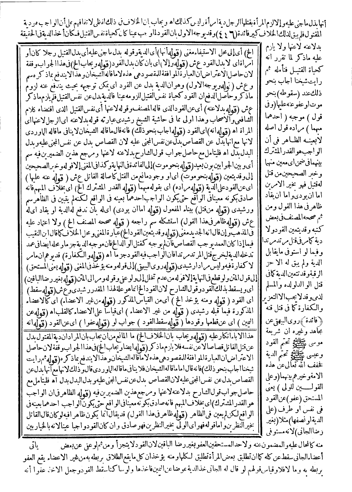فَائِدَةٌ رَوَى الْبَيْهَقِيُّ عَنْ مُجَاهِدٍ وَغَيْرِهِ أَنَّ شَرِيعَةَ مُوسَى - صَلَّى اللَّهُ عَلَيْهِ وَسَلَّمَ - تُحَتِّمُ الْقَوَدَ وَعِيسَى - صَلَّى اللَّهُ عَلَيْهِ وَسَلَّمَ - تُحَتِّمُ الدِّيَةَ فَخَفَّفَ اللَّهُ تَعَالَى عَنْ هَذِهِ الْأُمَّةِ وَخَيَّرَهُمْ بَيْنَهُمَا (وَعَلَى الْقَوْلَيْنِ لِلْوَلِيِّ) يَعْنِي الْمُسْتَحِقَّ (عَفْوٌ) عَنْ الْقَوَدِ فِي نَفْسٍ، أَوْ طَرَفٍ (عَلَى الدِّيَةِ) ، أَوْ نِصْفِهَا مَثَلًا (بِغَيْرِ رِضَا الْجَانِي) ؛ لِأَنَّهُ مُسْتَوْفَى مِنْهُ كَالْمُحَالِ عَلَيْهِ وَالْمَضْمُونِ عَنْهُ وَلِأَحَدِ الْمُسْتَحَقِّينَ الْعَفْوُ بِغَيْرِ رِضَا الْبَاقِينَ؛ لِأَنَّ الْقَوَدَ لَا يَتَجَزَّأُ وَمِنْ ثَمَّ لَوْ عُفِيَ عَنْ بَعْضِ أَعْضَاءِ الْجَانِي سَقَطَ عَنْ كُلِّهِ كَمَا أَنَّ تَطْلِيقَ بَعْضِ الْمَرْأَةِ تَطْلِيقٌ لِكُلِّهَا وَمِنْهُ يُؤْخَذُ أَنَّ كُلَّ مَا يَقَعُ الطَّلَاقُ بِرَبْطِهِ بِهِ مِنْ غَيْرِ الْأَعْضَاءِ يَقَعُ الْعَفْوُ بِرَبْطِهِ بِهِ وَمَا لَا فَلَا وَقِيَاسُ قَوْلِهِمْ لَوْ قَالَ لَهُ الْجَانِي خُذْ الدِّيَةَ عِوَضًا عَنْ الْيَمِينِ فَأَخَذَهَا، وَلَوْ سَاكِتًا سَقَطَ الْقَوَدُ وَجُعِلَ الْأَخْذُ عَفْوًا أَنَّهُ