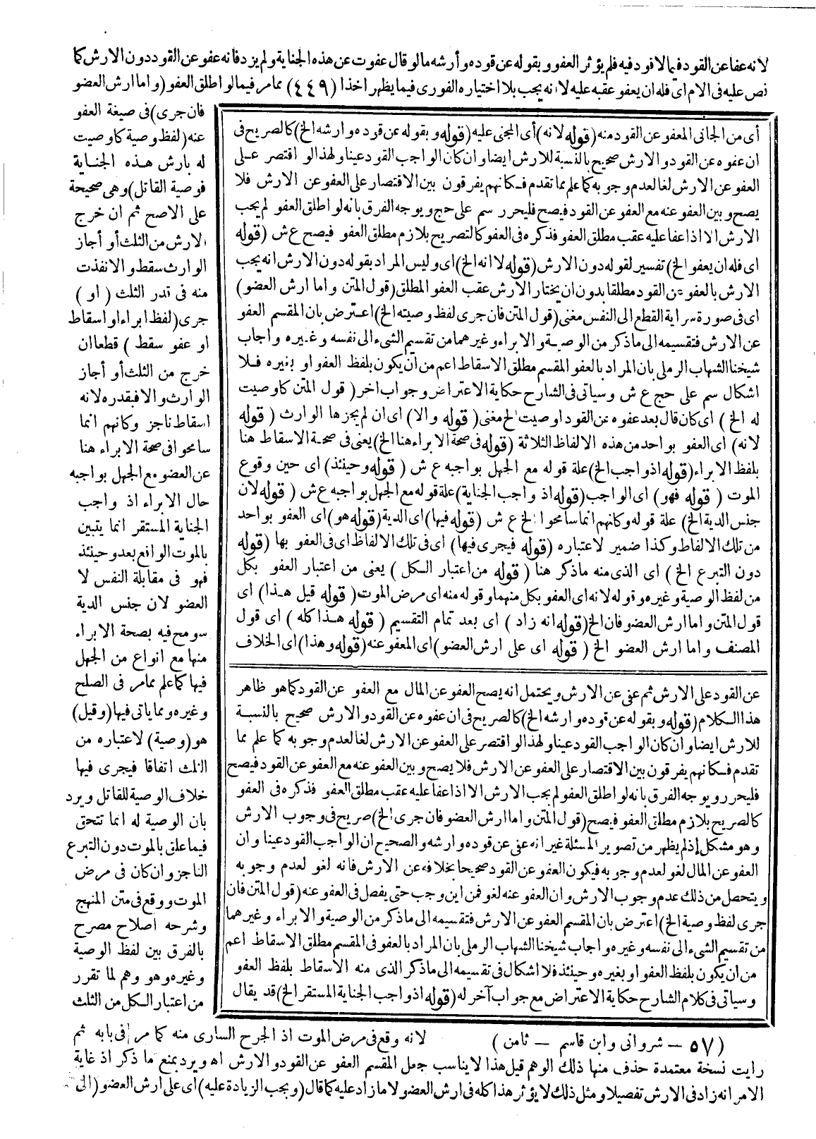 (قَوْلُهُ وَبِقَوْلِهِ عَنْ قَوَدِهِ وَأَرْشِهِ إلَخْ) كَالصَّرِيحِ فِي أَنَّ عَفْوَهُ عَنْ الْقَوَدِ وَالْأَرْشِ صَحِيحٌ بِالنِّسْبَةِ لِلْأَرْشِ أَيْضًا، وَإِنْ كَانَ الْوَاجِبُ الْقَوَدُ عَيْنًا، وَلِهَذَا لَوْ اقْتَصَرَ عَلَى الْعَفْوِ عَنْ الْأَرْشِ لَغَا لِعَدَمِ وُجُوبِهِ كَمَا عُلِمَ مِمَّا تَقَدَّمَ فَكَأَنَّهُمْ يُفَرِّقُونَ بَيْنَ الِاقْتِصَارِ عَلَى الْعَفْوِ عَنْ الْأَرْشِ فَلَا يَصِحُّ وَبَيْنَ الْعَفْوِ عَنْهُ مَعَ الْعَفْوِ عَنْ الْقَوَدِ فَيَصِحُّ فَلْيُحَرَّرْ وَيُوَجَّهُ الْفَرْقُ بِأَنَّهُ لَوْ أَطْلَقَ الْعَفْوَ لَمْ يَجِبْ الْأَرْشُ إلَّا إذَا عَفَا عَلَيْهِ عَقِبَ مُطْلَقِ الْعَفْوِ فَذَكَرَهُ فِي الْعَفْوِ كَالصَّرِيحِ بِلَازِمِ مُطْلَقِ الْعَفْوِ فَيَصِحُّ (قَوْلُ الْمَتْنِ وَأَمَّا أَرْشُ الْعُضْوِ فَإِنْ جَرَى إلَخْ) صَرِيحٌ فِي وُجُوبِ الْأَرْشِ، وَهُوَ مُشْكِلٌ إذْ لَمْ يَظْهَرْ مِنْ تَصْوِيرِ الْمَسْأَلَةِ غَيْرَ أَنَّهُ عُفِيَ عَنْ قَوَدِهِ وَأَرْشِهِ وَالصَّحِيحُ أَنَّ الْوَاجِبَ الْقَوَدُ عَيْنًا وَأَنَّ الْعَفْوَ عَنْ الْمَالِ لَغْوٌ لِعَدَمِ وُجُوبِهِ فَيَكُونُ الْعَفْوُ عَنْ الْقَوَدِ صَحِيحًا بِخِلَافِهِ عَنْ الْأَرْشِ فَإِنَّهُ لَغْوٌ لِعَدَمِ وُجُوبِهِ وَيَتَحَصَّلُ مِنْ ذَلِكَ عَدَمُ وُجُوبِ الْأَرْشِ وَأَنَّ الْعَفْوَ عَنْهُ لَغْوٌ فَمِنْ أَيْنَ وَجَبَ حَتَّى يُفَصَّلَ فِي الْعَفْوِ عَنْهُ؟ ، (قَوْلُ الْمَتْنِ فَإِنْ جَرَى لَفْظُ وَصِيَّةٍ إلَخْ) اعْتَرَضَ بِأَنَّ الْمُقَسَّمَ الْعَفْوُ عَنْ الْأَرْشِ فَتَقْسِيمُهُ إلَى مَا ذُكِرَ مِنْ الْوَصِيَّةِ وَالْإِبْرَاءِ وَغَيْرِهِمَا مِنْ تَقْسِيمِ الشَّيْءِ إلَى نَفْسِهِ وَغَيْرِهِ. وَأَجَابَ شَيْخُنَا الشِّهَابُ الرَّمْلِيُّ بِأَنَّ الْمُرَادَ بِالْعَفْوِ فِي الْمُقَسَّمِ مُطْلَقُ الْإِسْقَاطِ أَعَمُّ مِنْ أَنْ يَكُونَ بِلَفْظِ الْعَفْوِ، أَوْ بِغَيْرِهِ وَحِينَئِذٍ فَلَا إشْكَالَ فِي تَقْسِيمِهِ إلَى مَا ذُكِرَ الَّذِي مِنْهُ السِّقَاطُ بِلَفْظِ الْعَفْوِ وَسَيَأْتِي فِي كَلَامِ الشَّارِحِ حِكَايَةُ الِاعْتِرَاضِ مَعَ جَوَابٍ آخَرَ لَهُ (قَوْله إذْ وَاجِبُ الْجِنَايَةِ الْمُسْتَقِرُّ إلَخْ) قَدْ يُقَالُ