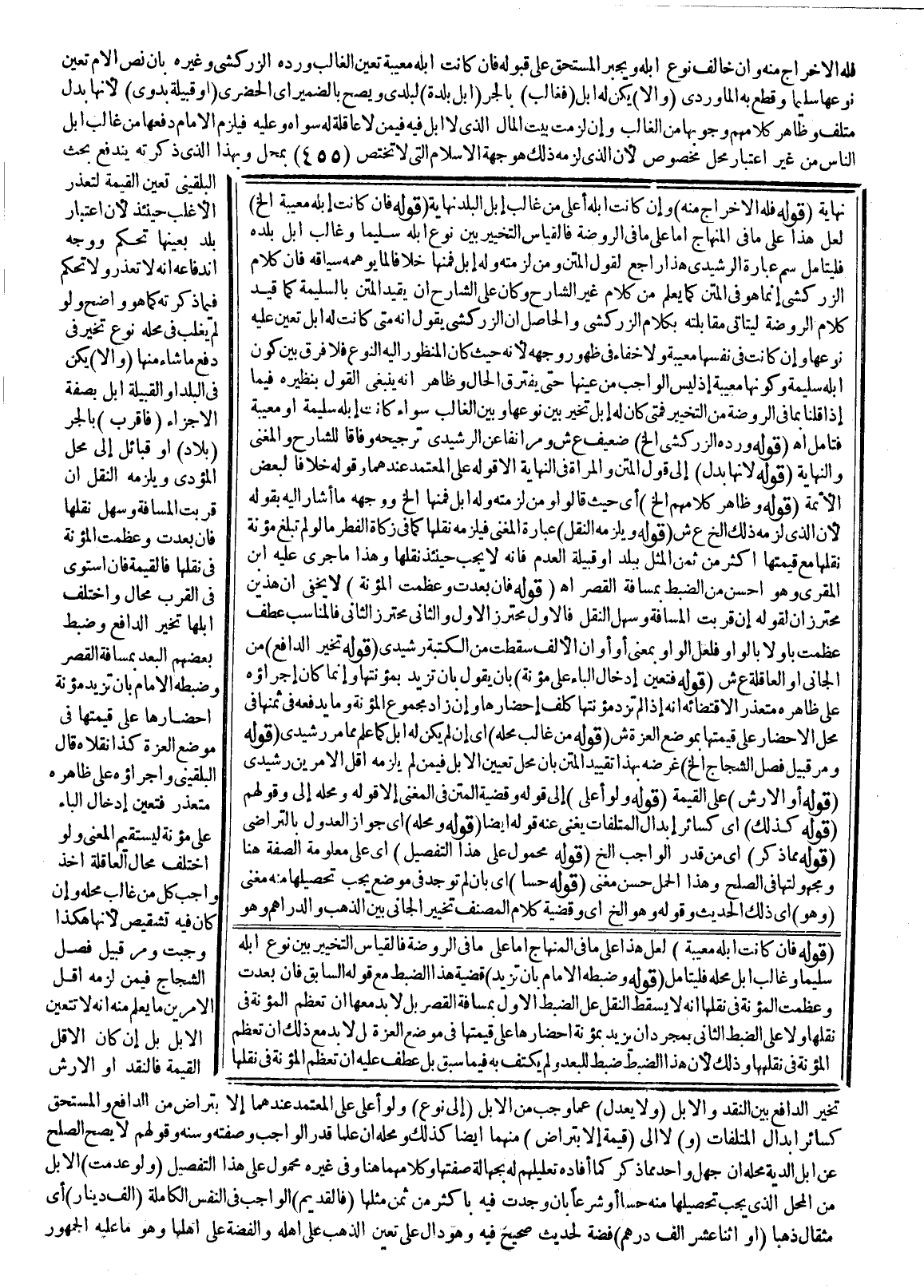 ـــــــــــــــــــــــــــــQنِهَايَةٌ (قَوْلُهُ فَلَهُ الْإِخْرَاجُ مِنْهُ) ، وَإِنْ كَانَتْ إبِلُهُ أَعْلَى مِنْ غَالِبِ إبِلِ الْبَلَدِ نِهَايَةٌ (قَوْلُهُ فَإِنْ كَانَتْ إبِلُهُ مَعِيبَةً إلَخْ) لَعَلَّ هَذَا عَلَى مَا فِي الْمِنْهَاجِ أَمَّا عَلَى مَا فِي الرَّوْضَةِ، فَالْقِيَاسُ التَّخْيِيرُ بَيْنَ نَوْعِ إبِلِهِ سَلِيمًا وَغَالِبِ إبِلِ بَلَدِهِ فَلْيُتَأَمَّلْ سم عِبَارَةُ الرَّشِيدِيِّ هَذَا رَاجِعٌ لِقَوْلِ الْمَتْنِ وَمَنْ لَزِمَتْهُ وَلَهُ إبِلٌ فَمِنْهَا خِلَافًا لِمَا يُوهِمُهُ سِيَاقُهُ فَإِنَّ كَلَامَ الزَّرْكَشِيّ إنَّمَا هُوَ فِي الْمَتْنِ كَمَا يُعْلَمُ مِنْ كَلَامِ غَيْرِ الشَّارِحِ وَكَانَ عَلَى الشَّارِحِ أَنْ يُقَيِّدَ الْمَتْنَ بِالسَّلِيمَةِ كَمَا قَيَّدَ كَلَامَ الرَّوْضَةِ وَلِيَتَأَتَّى مُقَابَلَتُهُ بِكَلَامِ الزَّرْكَشِيّ.