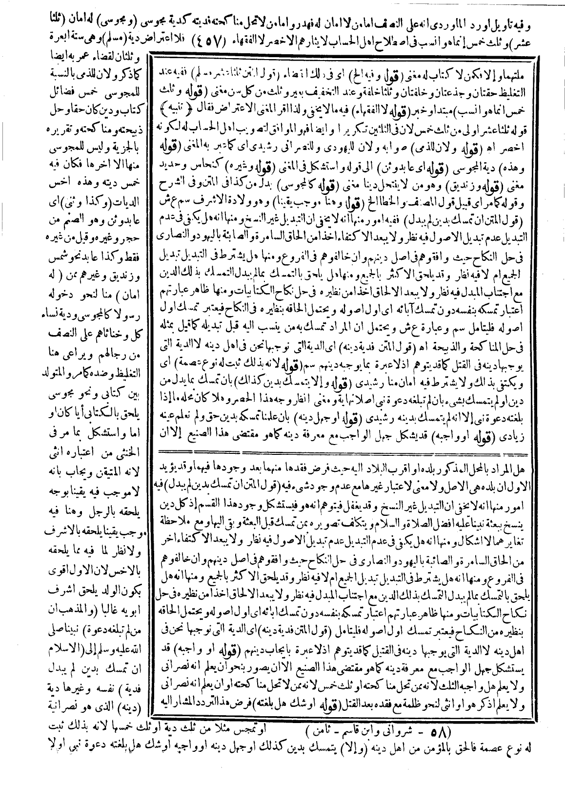 (قَوْلُهُ وَلِأَنَّ لِلذِّمِّيِّ) صَوَابُهُ وَلِأَنَّ لِلْيَهُودِيِّ وَلِلنَّصْرَانِيِّ رَشِيدِيٌّ أَيْ كَمَا عَبَّرَ بِهِ الْمُغْنِي (قَوْلُهُ وَهَذِهِ) دِيَةُ الْمَجُوسِيِّ (قَوْلُهُ أَيْ عَابِدِ وَثَنٍ) إلَى قَوْلِهِ وَاسْتُشْكِلَ فِي الْمُغْنِي (قَوْلُهُ وَغَيْرُهُ) كَنُحَاسٍ وَحَدِيدٍ مُغْنِي (قَوْلُهُ وَزِنْدِيقٌ) ، وَهُوَ مِنْ لَا يَنْتَحِلُ دِينًا مُغْنِي (قَوْلُهُ كَالْمَجُوسِيِّ) بَدَلٌ مِنْ كَذَا فِي الْمَتْنِ وَفِي الشَّرْحِ وَقَوْلُهُ كَمَا مَرَّ أَيْ قُبَيْلَ قَوْلِ الْمُصَنِّفِ وَالْخَطَأُ إلَخْ (قَوْلُهُ وَهُنَا مُوجِبٌ يَقِينًا) ، وَهُوَ وِلَادَةُ الْأَشْرَفِ سم ع ش (قَوْلُ الْمَتْنِ إنْ تَمَسَّكَ بِدِينٍ لَمْ يُبَدَّلْ) فَفِيهِ أُمُورٌ مِنْهَا أَنَّهُ لَا يَخْفَى أَنَّ التَّبْدِيلَ غَيْرُ النَّسْخِ، وَمِنْهَا أَنَّهُ هَلْ يَكْفِي فِي عَدَمِ التَّبْدِيلِ عَدَمُ تَبْدِيلِ الْأُصُولِ، فِيهِ نَظَرٌ وَلَا يَبْعُدُ الِاكْتِفَاءُ أَخْذًا مِنْ إلْحَاقِ السَّامِرَةِ وَالصَّابِئَةِ بِالْيَهُودِ وَالنَّصَارَى فِي حِلِّ النِّكَاحِ حَيْثُ وَافَقُوهُمْ فِي أَصْلِ دِينِهِمْ، وَإِنْ خَالَفُوهُمْ فِي الْفُرُوعِ وَمِنْهَا هَلْ يُشْتَرَطُ فِي التَّبْدِيلِ تَبْدِيلُ الْجَمِيعِ أَمْ لَا؟ فِيهِ نَظَرٌ وَقَدْ يُلْحَقُ الْأَكْثَرُ بِالْجَمِيعِ وَمِنْهَا هَلْ يُلْحَقُ بِالتَّمَسُّكِ بِمَا لَمْ يُبَدَّلْ التَّمَسُّكُ بِذَلِكَ الدِّينِ مَعَ اجْتِنَابِ الْمُبَدَّلِ فِيهِ نَظَرٌ وَلَا يَبْعُدُ الْإِلْحَاقُ أَخْذًا مِنْ نَظِيرِهِ فِي حِلِّ نِكَاحِ الْكِتَابِيَّاتِ وَمِنْهَا ظَاهِرُ عِبَارَتِهِمْ اعْتِبَارُ تَمَسُّكِهِ بِنَفْسِهِ دُونَ تَمَسُّكِ آبَائِهِ أَيْ أَوَّلَ أُصُولِهِ وَيُحْتَمَلُ إلْحَاقُهُ بِنَظِيرِهِ فِي النِّكَاحِ فَيُعْتَبَرُ تَمَسُّكُ أَوَّلِ أُصُولِهِ فَلْيُتَأَمَّلْ سم، وَعِبَارَةُ ع ش وَيُحْتَمَلُ أَنَّ الْمُرَادَ تَمَسَّكَ بِهِ مَنْ يُنْسَبُ إلَيْهِ قَبْلَ تَبْدِيلِهِ كَمَا قِيلَ بِمِثْلِهِ فِي حِلِّ الْمُنَاكَحَةِ وَالذَّبِيحَةِ. اهـ