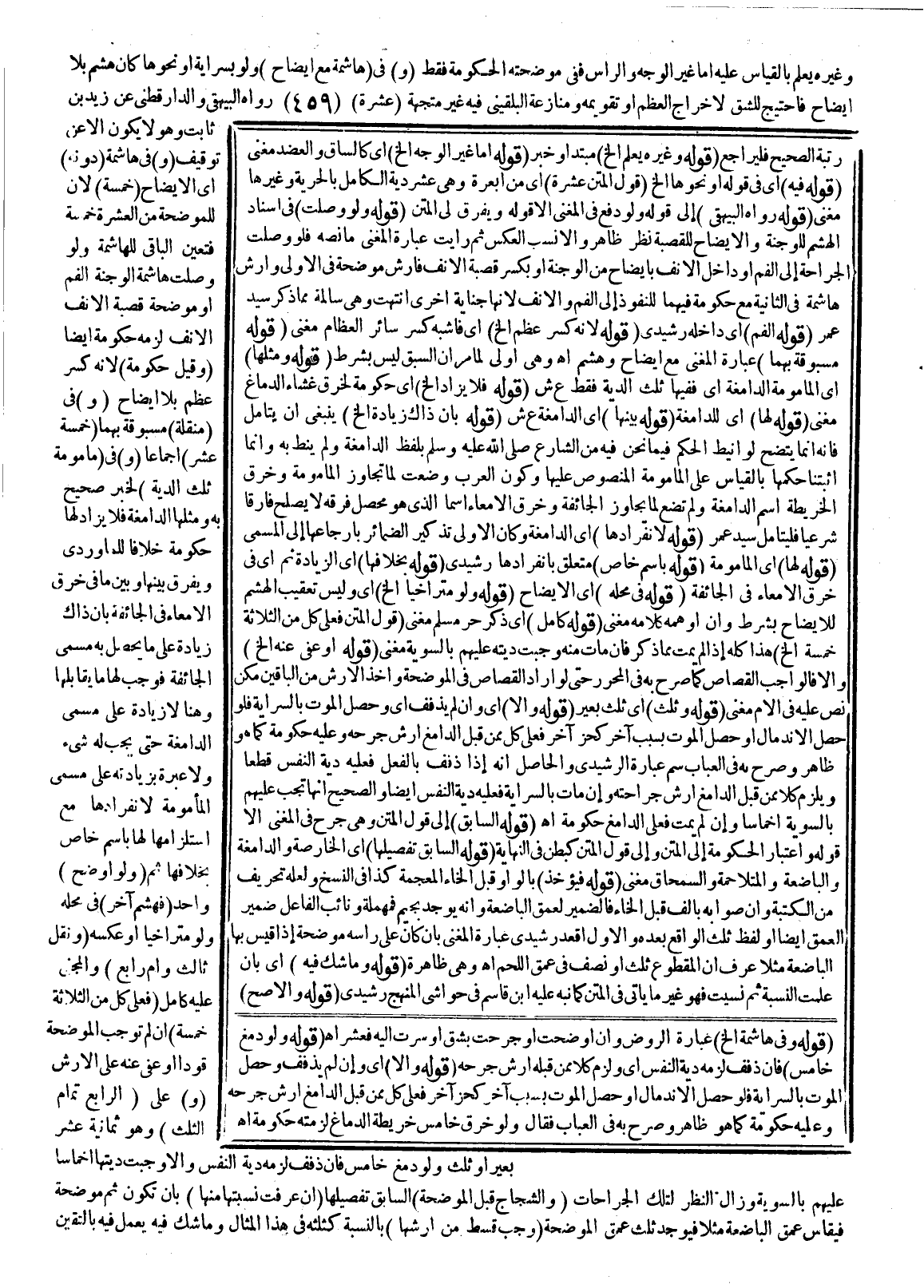 (قَوْلُهُ وَلَوْ وَصَلَتْ إلَخْ) فِي إسْنَادِ الْهَشْمِ لِلْوَجْنَةِ وَالْإِيضَاحِ لِلْقَصَبَةِ نَظَرٌ ظَاهِرٌ وَالْأَنْسَبُ الْعَكْسُ ثُمَّ رَأَيْت عِبَارَةَ الْمُغْنِي مَا نَصُّهُ فَلَوْ وَصَلَتْ الْجِرَاحَةُ إلَى الْفَمِ، أَوْ دَاخِلَ الْأَنْفِ بِإِيضَاحٍ مِنْ الْوَجْنَةِ، أَوْ بِكَسْرِ قَصَبَةِ الْأَنْفِ فَأَرْشُ مُوضِحَةٍ فِي الْأُولَى وَأَرْشُ هَاشِمَةٍ فِي الثَّانِيَةِ مَعَ حُكُومَةٍ فِيهِمَا لِلنُّفُوذِ إلَى الْفَمِ وَالْأَنْفِ؛ لِأَنَّهَا جِنَايَةٌ أُخْرَى انْتَهَتْ وَهِيَ سَالِمَةٌ مِمَّا ذُكِرَ سَيِّدْ عُمَرْ (قَوْلُهُ الْفَمِ) أَيْ دَاخِلَهُ رَشِيدِيٌّ (قَوْلُهُ لِأَنَّهُ كَسْرُ عَظْمٍ إلَخْ) أَيْ فَأَشْبَهَ كَسْرَ سَائِرِ الْعِظَامِ مُغْنِي (قَوْلُهُ مَسْبُوقَةٍ بِهِمَا) عِبَارَةُ الْمُغْنِي مَعَ إيضَاحٍ وَهَشْمٍ. اهـ وَهِيَ أَوْلَى لِمَا مَرَّ أَنَّ السَّبْقَ لَيْسَ بِشَرْطٍ (قَوْلُهُ وَمِثْلُهَا) أَيْ الْمَأْمُومَةِ الدَّامِغَةِ أَيْ فَفِيهَا ثُلُثُ الدِّيَةِ فَقَطْ ع ش (قَوْلُهُ فَلَا يُزَادُ إلَخْ) أَيْ حُكُومَةٌ لِخَرْقِ غِشَاءِ الدِّمَاغِ مُغْنِي (قَوْلُهُ لَهَا) أَيْ لِلدَّامِغَةِ (قَوْلُهُ بَيْنَهَا) أَيْ الدَّامِغَةِ ع ش (قَوْلُهُ بِأَنَّ ذَاكَ زِيَادَةٌ إلَخْ) يَنْبَغِي أَنْ يُتَأَمَّلَ فَإِنَّهُ إنَّمَا يَتَّضِحُ لَوْ أُنِيطَ الْحُكْمُ فِيمَا نَحْنُ فِيهِ مِنْ الشَّارِعِ - صَلَّى اللَّهُ عَلَيْهِ وَسَلَّمَ - بِلَفْظِ الدَّامِغَةِ، وَلَمْ يُنَطْ بِهِ وَإِنَّمَا أَثْبَتْنَا حُكْمَهَا بِالْقِيَاسِ عَلَى الْمَأْمُومَةِ الْمَنْصُوصِ عَلَيْهَا وَكَوْنُ الْعَرَبِ وَضَعَتْ لِمَا تَجَاوَزَ الْمَأْمُومَةَ وَخَرَقَ الْخَرِيطَةَ اسْمَ الدَّامِغَةِ وَلَمْ تَضَعْ لِمَا يُجَاوِزُ الْجَائِفَةَ وَخَرَقَ الْأَمْعَاءَ اسْمًا الَّذِي هُوَ مُحَصِّلُ فَرْقِهِ لَا يَصْلُحُ فَارِقًا شَرْعِيًّا فَلْيُتَأَمَّلْ سَيِّدْ عُمَرْ (قَوْلُهُ لِانْفِرَادِهَا) أَيْ الدَّامِغَةِ وَكَانَ الْأَوْلَى تَذْكِيرُ الضَّمَائِرِ بِإِرْجَاعِهَا إلَى الْمُسَمَّى (قَوْلُهُ لَهَا) أَيْ الْمَأْمُومَةِ (قَوْلُهُ بِاسْمٍ خَاصٍّ) مُتَعَلِّقٍ بِانْفِرَادِهَا رَشِيدِيٌّ (قَوْلُهُ بِخِلَافِهَا) أَيْ الزِّيَادَةِ ثُمَّ أَيْ فِي خَرْقِ الْأَمْعَاءِ فِي الْجَائِفَةِ (قَوْلُهُ فِي مَحَلِّهِ) أَيْ الْإِيضَاحِ (قَوْلُهُ وَلَوْ مُتَرَاخِيًا إلَخْ) أَيْ وَلَيْسَ تَعْقِيبُ الْهَشْمِ لِلْإِيضَاحِ بِشَرْطٍ، وَإِنْ أَوْهَمَهُ كَلَامُهُ مُغْنِي (قَوْلُهُ كَامِلٌ) أَيْ ذَكَرٌ حُرٌّ مُسْلِمٌ مُغْنِي (قَوْلُ الْمَتْنِ فَعَلَى كُلٍّ مِنْ الثَّلَاثَةِ خَمْسَةٌ إلَخْ) هَذَا كُلُّهُ إذَا لَمْ يَمُتْ مِمَّا ذُكِرَ فَإِنْ مَاتَ مِنْهُ وَجَبَتْ دِيَتُهُ عَلَيْهِمْ بِالسَّوِيَّةِ مُغْنِي (قَوْلُهُ أَوْ عَفَا عَنْهُ إلَخْ) وَإِلَّا فَالْوَاجِبُ الْقِصَاصُ كَمَا صَرَّحَ بِهِ فِي الْمُحَرَّرِ حَتَّى لَوْ أَرَادَ الْقِصَاصَ فِي الْمُوضِحَةِ وَأَخَذَ الْأَرْشَ مِنْ الْبَاقِينَ مُكِّنَ نَصَّ عَلَيْهِ فِي الْأُمِّ مُغْنِي (قَوْلُهُ وَثُلُثُ) أَيْ ثُلُثُ بَعِيرٍ (قَوْلُهُ وَإِلَّا) أَيْ وَإِنْ لَمْ يُذَفَّفْ أَيْ وَحَصَلَ الْمَوْتُ بِالسِّرَايَةِ فَلَوْ حَصَلَ الِانْدِمَالُ، أَوْ حَصَلَ الْمَوْتُ بِسَبَبٍ آخَرَ كَحَزٍّ آخَرَ فَعَلَى كُلٍّ مِمَّنْ قَبْلَ الدَّامِغِ أَرْشُ جُرْحِهِ وَعَلَيْهِ حُكُومَةٌ كَمَا هُوَ ظَاهِرٌ وَصَرَّحَ بِهِ فِي الْعُبَابِ سم عِبَارَةُ الرَّشِيدِيِّ وَالْحَاصِلُ أَنَّهُ إذَا ذَفَّفَ بِالْفِعْلِ فَعَلَيْهِ دِيَةُ النَّفْسِ قَطْعًا وَيَلْزَمُ كُلًّا مِمَّنْ قَبْلَ الدَّامِغِ أَرْشُ جِرَاحَتِهِ، وَإِنْ مَاتَ بِالسِّرَايَةِ فَعَلَيْهِ دِيَةُ النَّفْسِ أَيْضًا وَالصَّحِيحُ أَنَّهَا تَجِبُ ع