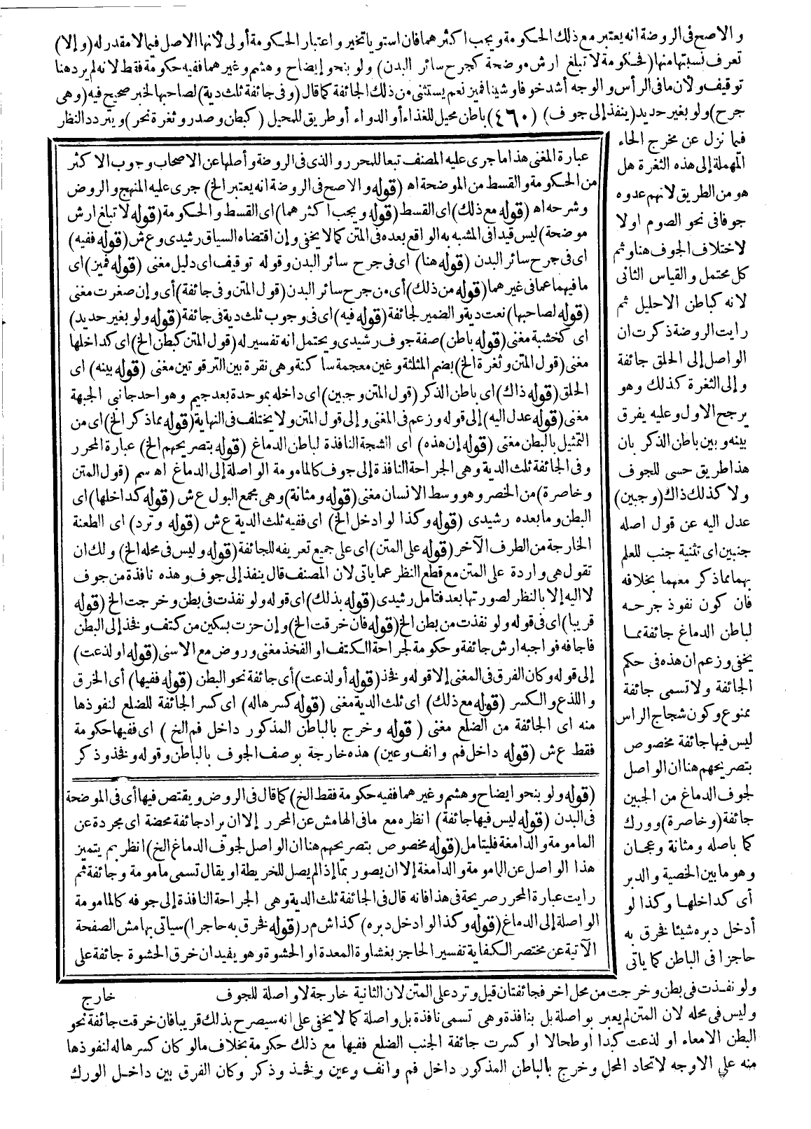 (قَوْلُهُ لَيْسَ فِيهَا جَائِفَةٌ) اُنْظُرْهُ مَعَ مَا فِي الْهَامِشِ عَنْ الْمُحَرَّرِ إلَّا أَنْ يُرَادَ جَائِفَةٌ مَحْضَةٌ أَيْ مُجَرَّدَةٌ عَنْ الْمَأْمُومَةِ وَالدَّامِغَةِ فَلْيُتَأَمَّلْ (قَوْلُهُ مَخْصُوصٌ بِتَصْرِيحِهِمْ هُنَا أَنَّ الْوَاصِلَ لِجَوْفِ الدِّمَاغِ إلَخْ) اُنْظُرْ بِمَ يَتَمَيَّزُ هَذَا الْوَاصِلُ عَنْ الْمَأْمُومَةِ وَالدَّامِغَةِ إلَّا أَنْ يُصَوَّرَ بِمَا إذَا لَمْ يَصِلْ لِلْخَرِيطَةِ، أَوْ يُقَالُ تُسَمَّى مَأْمُومَةً وَجَائِفَةً ثُمَّ رَأَيْت عِبَارَةَ الْمُحَرَّرِ صَرِيحَةً فِي هَذَا فَإِنَّهُ قَالَ فِي الْجَائِفَةِ ثُلُثُ الدِّيَةِ وَهِيَ الْجِرَاحَةُ النَّافِذَةُ إلَى جَوْفِهِ كَالْمَأْمُومَةِ الْوَاصِلَةِ إلَى الدِّمَاغِ. اهـ (قَوْلُهُ وَكَذَا لَوْ أَدْخَلَ دُبُرَهُ) كَذَا ش م ر (قَوْلُهُ فَخَرَقَ بِهِ حَاجِزًا) سَيَأْتِي بِهَامِشِ الصَّفْحَةِ الْآتِيَةِ عَنْ مُخْتَصَرِ الْكِفَايَةِ تَفْسِيرُ الْحَاجِزِ بِغِشَاوَةِ الْمَعِدَةِ أَوْ الْحَشْوَةِ، وَهُوَ يُفِيدُ أَنَّ خَرْقَ الْحَشْوَةِ جَائِفَةٌ عَلَى