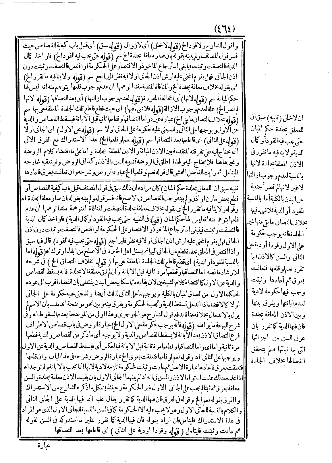 ـــــــــــــــــــــــــــــQوَلِقَوْلِ الشَّارِحِ وَلَا قَوَدَ إلَخْ (قَوْلُهُ لَا خَلَلَ) أَيْ لَا زَوَالَ (قَوْلُهُ سَبَقَ) أَيْ قُبَيْلَ بَابِ كَيْفِيَّةِ الْقِصَاصِ حَيْثُ فَسَّرَ قَوْلَ الْمُصَنِّفِ، وَلَمْ يُبَيِّنْهُ بِقَوْلِهِ بِأَنْ صَارَ مُعَلَّقًا بِجِلْدَةٍ إلَخْ سم (قَوْلُهُ حَتَّى يَجِبَ فِيهِ الْقَوَدُ إلَخْ) فَلَوْ أَخَذَ كَمَالَ الدِّيَةِ فَالْتَصَقَتْ وَثَبَتَتْ فَيَنْبَغِي اسْتِرْجَاعُ الْمَأْخُوذِ وَالِاقْتِصَارُ عَلَى الْحُكُومَةِ أَوْ اقْتَصَّ فَالْتَصَقَتْ وَثَبَتَتْ دُونَ أُذُنِ الْجَانِي فَهَلْ يَغْرَمُ الْمَجْنِيُّ عَلَيْهِ أَرْشَ أُذُنِ الْجَانِي، أَوْ لَا؟ فِيهِ نَظَرٌ فَلْيُرَاجَعْ سم (قَوْلُهُ وَلَا يُنَافِيهِ مَا تَقَرَّرَ إلَخْ) أَيْ بِقَوْلِهِ بِخِلَافِ مُعَلَّقَةٍ بِجِلْدَةٍ إلَخْ وَالْمُنَافَاةُ الْمَنْفِيَّةُ مَنْشَأُ تَوَهُّمِهَا أَنَّ عَدَمَ وُجُوبِ قَلْعِهَا يُتَوَهَّمُ مِنْهُ أَنَّهُ لَيْسَ لَهَا حُكْمُ الْمُبَانَةِ سم (قَوْلُهُ: لِأَنَّهَا) أَيْ الْمُخَالَفَةُ الْمُقَرَّرَةُ (قَوْلُهُ لِعَدَمِ وُجُوبِ إزَالَتِهَا) أَيْ بَعْدَ الْتِصَاقِهَا (قَوْلُهُ: لِأَنَّهَا لَمْ تَصِرْ إلَخْ) عِلَّةٌ لِعَدَمِ وُجُوبِ الْإِزَالَةِ (قَوْلُهُ فَلَا شَيْءَ فِيهَا) أَيْ حَيْثُ قَطَعَ قَاطِعٌ تِلْكَ الْجِلْدَةَ الْمُعَلَّقَةَ هِيَ بِهَا سم.