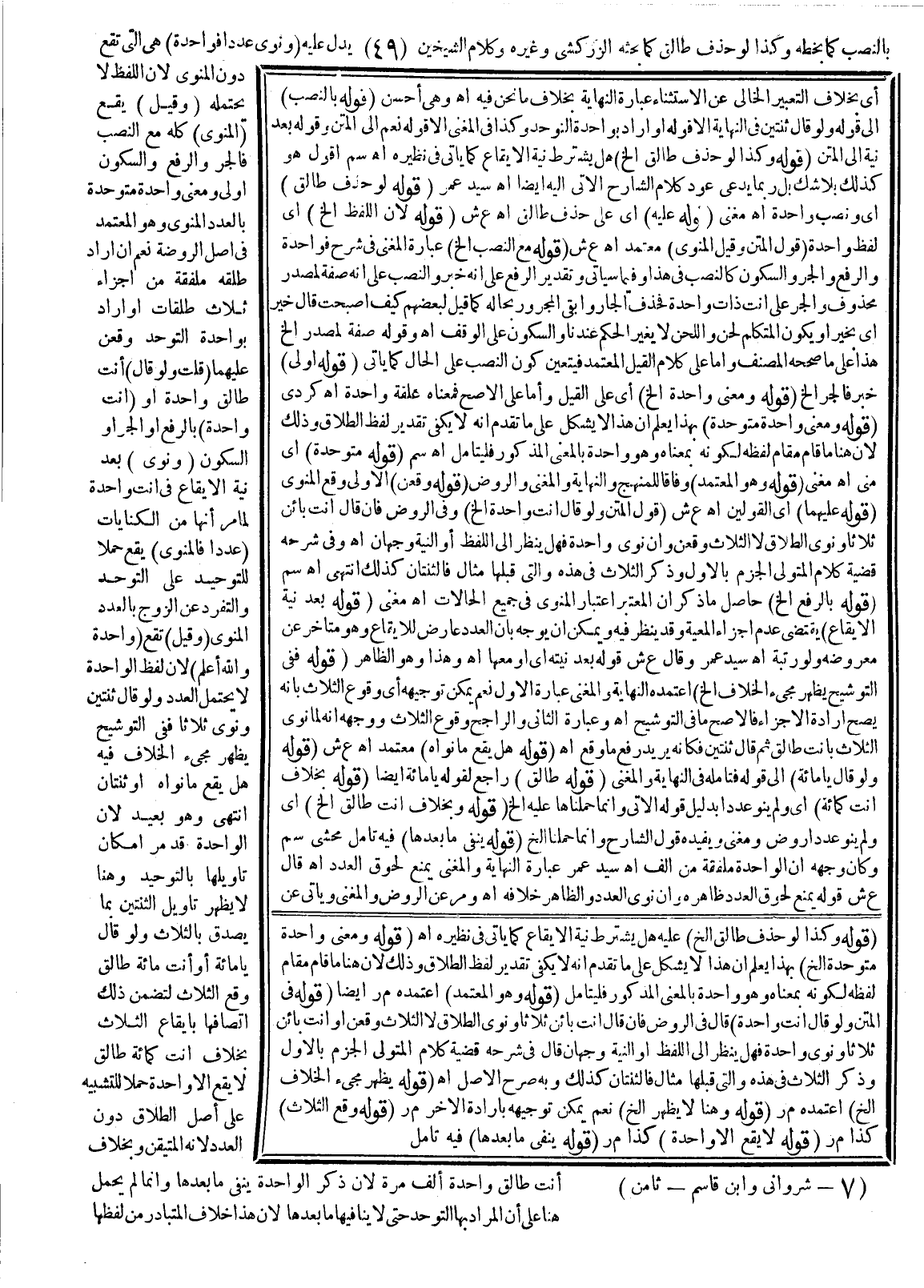 بِالنَّصْبِ كَمَا بِخَطِّهِ وَكَذَا لَوْ حَذَفَ طَالِقٌ كَمَا بَحَثَهُ الزَّرْكَشِيُّ وَغَيْرُهُ وَكَلَامُ الشَّيْخَيْنِ يَدُلُّ عَلَيْهِ (وَنَوَى عَدَدًا فَوَاحِدَةٌ) هِيَ الَّتِي تَقَعُ دُونَ الْمَنْوِيِّ؛ لِأَنَّ اللَّفْظَ لَا يَحْتَمِلُهُ (وَقِيلَ) يَقَعُ (الْمَنْوِيُّ) كُلُّهُ مَعَ النَّصْبِ فَالْجَرُّ وَالرَّفْعُ وَالسُّكُونُ أَوْلَى وَمَعْنَى وَاحِدَةٍ مُتَوَحِّدَةٌ بِالْعَدَدِ الْمَنْوِيِّ، وَهُوَ الْمُعْتَمَدُ فِي أَصْلِ الرَّوْضَةِ نَعَمْ إنْ أَرَادَ طَلْقَةً مُلَفَّقَةً مِنْ أَجْزَاءِ ثَلَاثِ طَلْقَاتٍ أَوْ أَرَادَ بِوَاحِدَةٍ التَّوَحُّدَ وَقَعْنَ عَلَيْهِمَا (قُلْت وَلَوْ قَالَ) أَنْتِ طَالِقٌ وَاحِدَةً أَوْ (أَنْتِ وَاحِدَةٌ) بِالرَّفْعِ أَوْ الْجَرِّ أَوْ السُّكُونِ (وَنَوَى) بَعْدَ نِيَّةِ الْإِيقَاعِ فِي أَنْتِ وَاحِدَةٌ لِمَا مَرَّ أَنَّهَا مِنْ الْكِنَايَاتِ (عَدَدًا فَالْمَنْوِيُّ) يَقَعُ حَمْلًا لِلتَّوْحِيدِ عَلَى التَّوَحُّدِ وَالتَّفَرُّدِ عَنْ الزَّوْجِ بِالْعَدَدِ الْمَنْوِيِّ (وَقِيلَ) تَقَعُ (وَاحِدَةٌ وَاَللَّهُ أَعْلَمُ) ؛ لِأَنَّ لَفْظَ الْوَاحِدَةِ لَا يَحْتَمِلُ الْعَدَدَ وَلَوْ قَالَ ثِنْتَيْنِ وَنَوَى ثَلَاثًا فَفِي التَّوْشِيحِ يَظْهَرُ مَجِيءُ الْخِلَافِ فِيهِ هَلْ يَقَعُ مَا نَوَاهُ أَوْ ثِنْتَانِ. انْتَهَى.