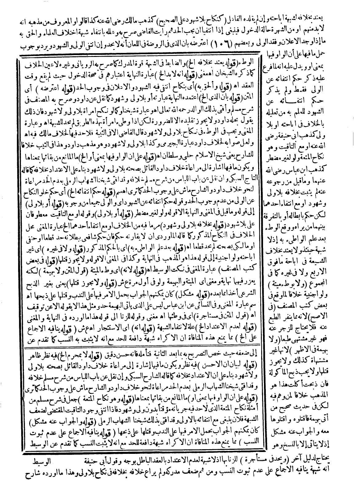 يُعْتَدُّ بِخِلَافِهِ لِشُبْهَةِ إبَاحَتِهِ، وَإِنْ لَمْ يُقَلِّدْهُ الْفَاعِلُ (كَنِكَاحٍ بِلَا شُهُودٍ عَلَى الصَّحِيحِ) كَمَذْهَبِ مَالِكٍ - رَضِيَ اللَّهُ عَنْهُ - كَذَا قَالُوا وَالْمَعْرُوفُ مِنْ مَذْهَبِهِ أَنَّهُ لَا بُدَّ مِنْهُمْ أَوْ مِنْ الشُّهْرَةِ حَالَةَ الدُّخُولِ فَيَنْبَغِي إذَا انْتَفَيَا أَنْ يَجِبَ الْحَدُّ ثُمَّ رَأَيْتُ الْقَاضِيَ صَرَّحَ بِهِ وَعَلَّلَهُ بِانْتِفَاءِ شُبْهَةِ اخْتِلَافِ الْعُلَمَاءِ وَأَلْحَقَ بِهِ مَا إذَا وُجِدَ الْإِعْلَانُ وَفُقِدَ الْوَلِيُّ وَبَعْضُهُمْ اعْتَرَضَهُ بِأَنَّ الَّذِي فِي الرَّوْضَةِ فِي اللِّعَانِ أَنَّهُ لَا يُحَدُّ، وَإِنْ انْتَفَى الْوَلِيُّ وَالشُّهُودُ