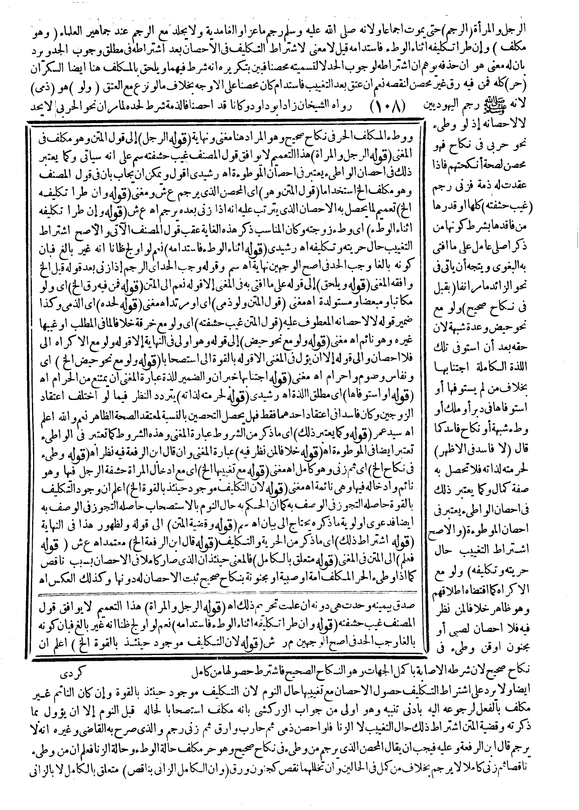 الرَّجُلِ وَالْمَرْأَةِ (الرَّجْمُ) حَتَّى يَمُوتَ إجْمَاعًا وَلِأَنَّهُ «- صَلَّى اللَّهُ عَلَيْهِ وَسَلَّمَ - رَجَمَ مَاعِزًا وَالْغَامِدِيَّةَ» وَلَا يُجْلَدُ مَعَ الرَّجْمِ عِنْدَ جَمَاهِيرِ الْعُلَمَاءِ (وَهُوَ مُكَلَّفٌ) ، وَإِنْ طَرَأَ تَكْلِيفُهُ أَثْنَاءَ الْوَطْءِ فَاسْتَدَامَهُ قِيلَ لَا مَعْنَى لِاشْتِرَاطِ التَّكْلِيفِ فِي الْإِحْصَانِ بَعْدَ اشْتِرَاطِهِ فِي مُطْلَقِ وُجُوبِ الْحَدِّ وَيُرَدُّ بِأَنَّ لَهُ مَعْنًى، هُوَ أَنَّ حَذْفَهُ يُوهِمُ أَنَّ اشْتِرَاطَهُ لِوُجُوبِ الْحَدِّ لَا لِتَسْمِيَتِهِ مُحْصَنًا فَبَيَّنَ بِتَكْرِيرِهِ أَنَّهُ شَرْطٌ فِيهِمَا وَيُلْحَقُ بِالْمُكَلَّفِ هُنَا أَيْضًا السَّكْرَانُ (حُرٌّ) كُلُّهُ فَمَنْ فِيهِ رِقٌّ غَيْرُ مُحْصَنٍ لِنَقْصِهِ نَعَمْ إنْ عَتَقَ بَعْدَ التَّغْيِيبِ فَاسْتَدَامَ كَانَ مُحْصَنًا عَلَى الْأَوْجَهِ بِخِلَافِ مَا لَوْ نَزَعَ مَعَ الْعِتْقِ