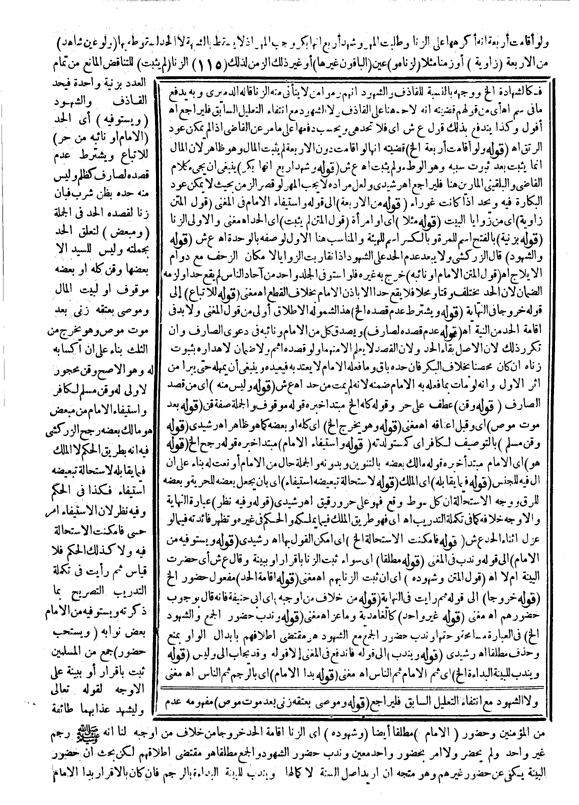 (وَيُسْتَحَبُّ حُضُورُ) جَمْعٍ مِنْ الْمُسْلِمِينَ ثَبَتَ بِإِقْرَارٍ أَوْ بِبَيِّنَةٍ عَلَى الْأَوْجَهِ لِقَوْلِهِ تَعَالَى {وَلْيَشْهَدْ عَذَابَهُمَا طَائِفَةٌ مِنَ الْمُؤْمِنِينَ} [النور: 2] وَحُضُورُ (الْإِمَامِ) مُطْلَقًا أَيْضًا (وَشُهُودُهُ) أَيْ الزِّنَا إقَامَةَ الْحَدِّ خُرُوجًا مِنْ خِلَافِ مَنْ أَوْجَبَهُ لَنَا أَنَّهُ «- صَلَّى اللَّهُ عَلَيْهِ وَسَلَّمَ - رَجَمَ غَيْرَ وَاحِدٍ وَلَمْ يَحْضُرْ وَلَا أَمَرَ بِحُضُورِ وَاحِدٍ مُعَيَّنٍ» وَنَدْبُ حُضُورِ الشُّهُودِ وَالْجَمْعِ مُطْلَقًا، هُوَ مُقْتَضَى إطْلَاقِهِمْ لَكِنْ بُحِثَ أَنَّ حُضُورَ الْبَيِّنَةِ يَكْفِي عَنْ حُضُورِ غَيْرِهِمْ، وَهُوَ مُتَّجِهٌ إنْ أُرِيدَ أَصْلُ السُّنَّةِ لَا كَمَالُهَا وَيُنْدَبُ لِلْبَيِّنَةِ الْبُدَاءَةُ بِالرَّجْمِ فَإِنْ كَانَ بِالْإِقْرَارِ بَدَأَ الْإِمَامُ