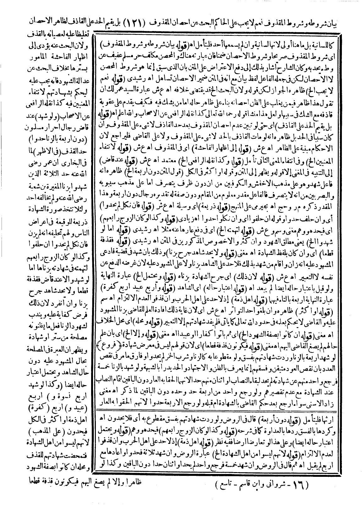 بَيَانُ شُرُوطِهِ وَشُرُوطِ الْمَقْذُوفِ نَعَمْ لَا يَجِبُ عَلَى الْحَاكِمِ الْبَحْثُ عَنْ إحْصَانِ الْمَقْذُوفِ بَلْ يُقِيمُ الْحَدَّ عَلَى الْقَاذِفِ لِظَاهِرِ الْإِحْصَانِ تَغْلِيظًا عَلَيْهِ لِعِصْيَانِهِ بِالْقَذْفِ؛ وَلِأَنَّ الْبَحْثَ عَنْهُ يُؤَدِّي إلَى إظْهَارِ الْفَاحِشَةِ الْمَأْمُورِ بِسِتْرِهَا بِخِلَافِ الْبَحْثِ عَنْ عَدَالَةِ الشُّهُودِ فَإِنَّهُ يَجِبُ عَلَيْهِ لِيَحْكُمَ بِشَهَادَتِهِمْ لِانْتِفَاءِ الْمَعْنَيَيْنِ فِيهِ كَذَا نَقَلَهُ الرَّافِعِيُّ عَنْ الْأَصْحَابِ