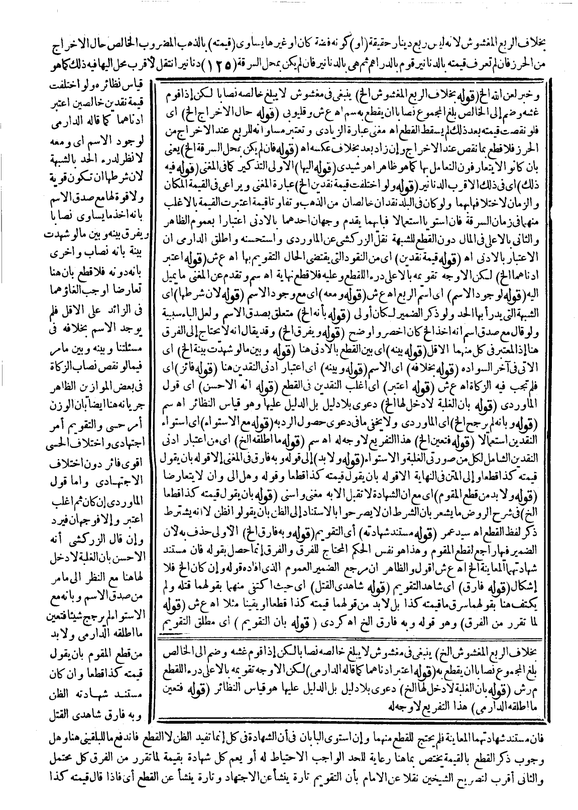 (قَوْلُهُ اُعْتُبِرَ أَدْنَاهُمَا إلَخْ) لَكِنَّ الْأَوْجَهَ تَقْوِيمُهُ بِالْأَعْلَى دَرْءًا لِلْقَطْعِ وَعَلَيْهِ فَلَا قَطْعَ نِهَايَةٌ اهـ سم وَتَقَدَّمَ عَنْ الْمُغْنِي مَا يَمِيلُ إلَيْهِ (قَوْلُهُ لِوُجُودِ الِاسْمِ) أَيْ اسْمِ الرُّبُعِ اهـ ع ش (قَوْلُهُ وَمَعَهُ) أَيْ: مَعَ وُجُودِ الِاسْمِ (قَوْلُهُ؛ لِأَنَّ شَرْطَهَا) أَيْ: الشُّبْهَةِ الَّتِي يُدْرَأُ بِهَا الْحَدُّ وَلَوْ ذَكَّرَ الضَّمِيرَ لَكَانَ أَوْلَى (قَوْلُهُ بِأَنَّهُ إلَخْ) مُتَعَلِّقٌ بِصِدْقِ الِاسْمِ وَلَعَلَّ الْبَاءَ سَبَبِيَّةٌ وَلَوْ قَالَ مَعَ صِدْقِ اسْمِ أَنَّهُ أَخَذَ إلَخْ كَانَ أَخْصَرَ وَأَوْضَحَ (قَوْلُهُ وَيُفَرَّقُ إلَخْ) وَقَدْ يُقَالُ إنَّهُ لَا يُحْتَاجُ إلَى الْفَرْقِ هُنَا إذْ الْمُعْتَبَرُ فِي كُلٍّ مِنْهُمَا الْأَقَلُّ (قَوْلُهُ بَيْنَهُ) أَيْ: بَيْنَ الْقَطْعِ بِالْأَدْنَى هُنَا (قَوْلُهُ وَبَيْنَ مَا لَوْ شَهِدَتْ بَيِّنَةً إلَخْ) أَيْ: الْآتِي فِي آخَرَ السِّوَادَةُ (قَوْلُهُ بِخِلَافِهِ) أَيْ: الِاسْم (قَوْلُهُ وَبَيْنَهُ) أَيْ: اعْتِبَارُ أَدْنَى النَّقْدَيْنِ هُنَا (قَوْلُهُ فَأَثَّرَ) أَيْ: فَلَمْ تَجِبْ فِيهِ الزَّكَاةُ اهـ ع ش (قَوْلُهُ اُعْتُبِرَ) أَيْ: أَغْلَبُ النَّقْدَيْنِ فِي الْقَطْعِ (قَوْلُهُ أَنَّهُ الْأَحْسَنُ) أَيْ: قَوْلُ الْمَاوَرْدِيِّ.