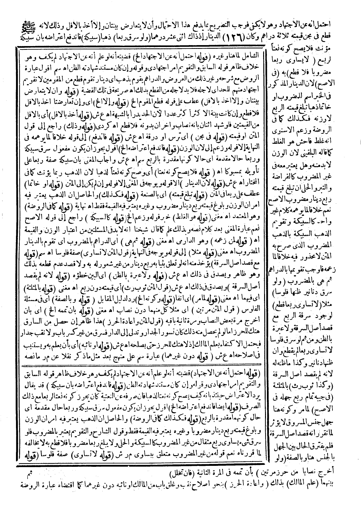 ـــــــــــــــــــــــــــــQالشَّامِلِ لِمَا هُنَا وَغَيْرِهِ (قَوْلُهُ احْتَمَلَ أَنَّهُ عَنْ الِاجْتِهَادِ إلَخْ) قَضِيَّتُهُ أَنَّهُ لَوْ عَلِمَ أَنَّهُ عَنْ الِاجْتِهَادِ لَمْ يَكْفِ وَهُوَ خِلَافُ ظَاهِرِ قَوْلِهِ السَّابِقِ وَالتَّقْوِيمُ أَمْرٌ اجْتِهَادِيٌّ وَقَوْلِهِ وَإِنْ كَانَ مُسْتَنَدُ شَهَادَتِهِ الظَّنَّ اهـ سم أَقُولُ عِبَارَةُ الرَّوْضِ مَعَ شَرْحِهِ وَغَيْرِ ذَلِكَ مِنْ الْعُرُوضِ وَالدَّرَاهِمِ يُقَوَّمُ بِذَهَبٍ أَيْ دِينَارٍ تَقَوُّمَ قَطْعٍ مِنْ الْمُقَوِّمَيْنِ لَا تَقْوِيمُ اجْتِهَادٍ مِنْهُمْ لِلْحَدِّ أَيْ لِأَجْلِهِ فَلَا بُدَّ لِأَجْلِهِ مِنْ الْقَطْعِ بِذَلِكَ اهـ صَرِيحَةٌ فِي تِلْكَ الْقَضِيَّةِ (قَوْلُهُ وَأَنْ لَا يَتَعَارَضَ بَيِّنَتَانِ وَإِلَّا أُخِذَ بِالْأَقَلِّ) عُطِفَ عَلَى قَوْلِهِ قَطْعِ الْمُقَوَّمُ إلَخْ (قَوْلُهُ وَإِلَّا إلَخْ) أَيْ: وَإِنْ تَعَارَضَتَا أُخِذَ بِالْأَقَلِّ فَلَا قَطْعَ وَإِنْ كَانَتْ بَيِّنَةُ الْأَكْثَرِ أَكْثَرَ عَدَدًا؛ لِأَنَّ الْحَدَّ يُدْرَأُ بِالشُّبْهَةِ اهـ ع ش (قَوْلُهُ أُخِذَ بِالْأَقَلِّ) أَيْ: بِالْأَقَلِّ مِنْ الْقِيمَتَيْنِ فَلَوْ شَهِدَ اثْنَانِ بِأَنَّهُ نِصَابٌ وَآخَرَانِ بِدُونِهِ فَلَا قَطْعَ اهـ كُرْدِيٌّ (قَوْلُهُ وَذَلِكَ إلَخْ) رَاجِعٌ إلَى قَوْلِ الْمَتْنِ أَوْ قِيمَتِهِ (قَوْلُهُ فِي مِجَنٍّ) أَيْ: تُرْسٍ أَوْ دَرَقَةٍ اهـ ع ش. .