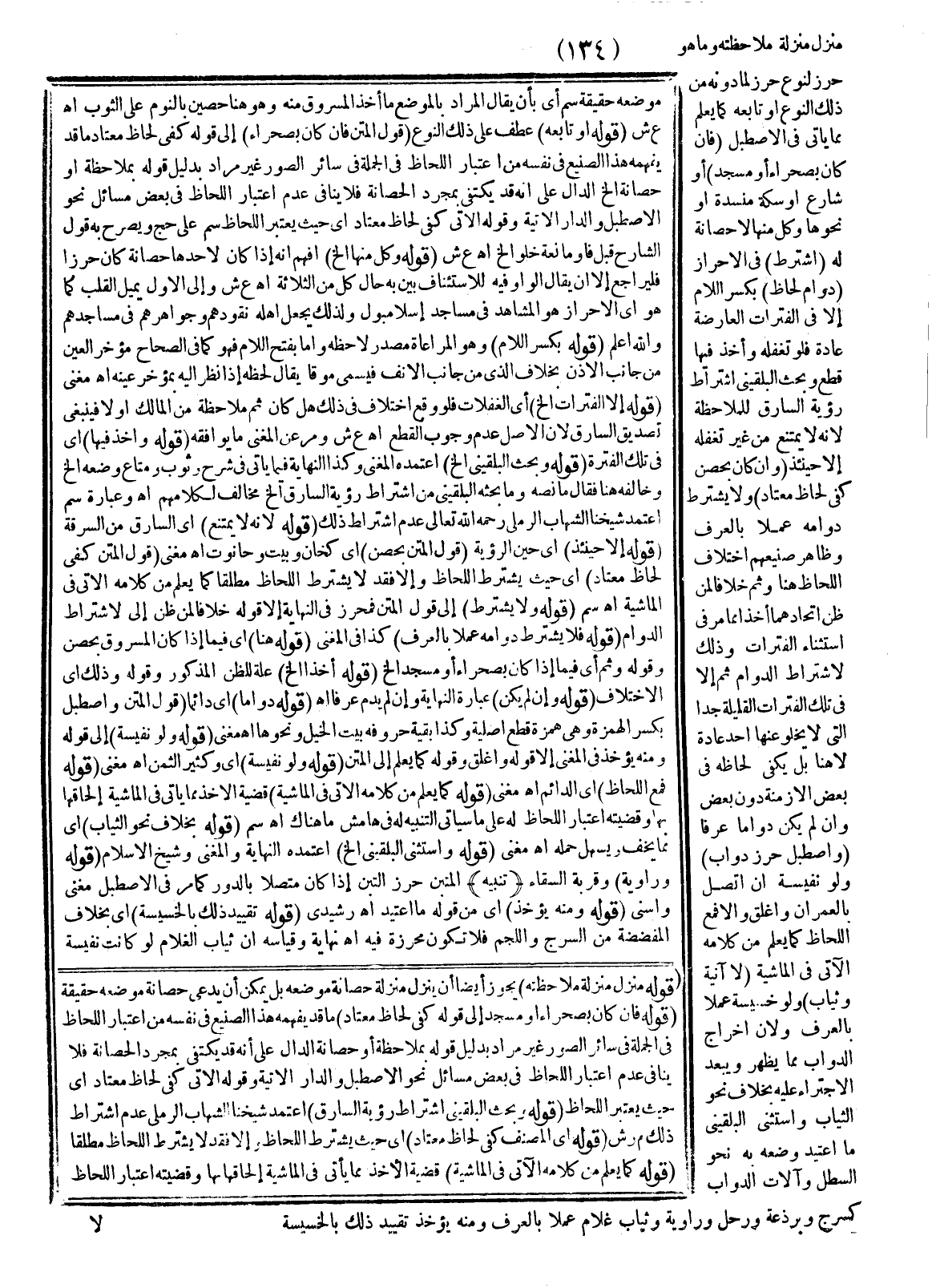 (فَإِنْ كَانَ بِصَحْرَاءَ أَوْ مَسْجِدٍ) أَوْ شَارِعٍ أَوْ سِكَّةٍ مُنْسَدَّةٍ أَوْ نَحْوِهَا وَكُلٌّ مِنْهَا لَا حَصَانَةَ لَهُ (اُشْتُرِطَ) فِي الْإِحْرَازِ (دَوَامَ لِحَاظٍ) بِكَسْرِ اللَّامِ إلَّا فِي الْفَتَرَاتِ الْعَارِضَةِ عَادَةً فَلَوْ تَغَفَّلَهُ وَأَخَذَ فِيهَا قُطِعَ وَبَحَثَ الْبُلْقِينِيُّ اشْتِرَاطَ رُؤْيَةِ السَّارِقِ لِلْمُلَاحِظِ لِأَنَّهُ لَا يَمْتَنِعُ مِنْ غَيْرِ تَغَفُّلِهِ إلَّا حِينَئِذٍ (وَإِنْ كَانَ بِحِصْنٍ كَفَى لِحَاظٌ مُعْتَادٌ) وَلَا يُشْتَرَطُ دَوَامُهُ عَمَلًا بِالْعُرْفِ وَظَاهِرُ صَنِيعِهِمْ اخْتِلَافُ اللِّحَاظِ هُنَا وَثَمَّ خِلَافًا لِمَنْ ظَنَّ اتِّحَادَهُمَا أَخْذًا مِمَّا مَرَّ فِي اسْتِثْنَاءِ الْفَتَرَاتِ وَذَلِكَ لِاشْتِرَاطِ الدَّوَامِ ثُمَّ إلَّا فِي تِلْكَ الْفَتَرَاتِ الْقَلِيلَةِ جِدًّا الَّتِي لَا يَخْلُو عَنْهَا أَحَدٌ عَادَةً لَا هُنَا بَلْ يَكْفِي لِحَاظُهُ فِي بَعْضِ الْأَزْمِنَةِ دُونَ بَعْضٍ وَإِنْ لَمْ يَكُنْ دَوَامًا عُرْفًا (وَإِصْطَبْلٌ حِرْزُ دَوَابَّ) وَلَوْ نَفِيسَةً إنْ اتَّصَلَ بِالْعِمْرَانِ وَأُغْلِقَ وَإِلَّا فَمَعَ اللِّحَاظِ كَمَا يُعْلَمُ مِنْ كَلَامِهِ الْآتِي فِي الْمَاشِيَةِ (لَا آنِيَةٍ وَثِيَابٍ) وَلَوْ خَسِيسَةٍ عَمَلًا بِالْعُرْفِ وَلِأَنَّ إخْرَاجَ الدَّوَابِّ مِمَّا يَظْهَرُ وَيَبْعُدُ الِاجْتِرَاءُ عَلَيْهِ بِخِلَافِ نَحْوِ الثِّيَابِ