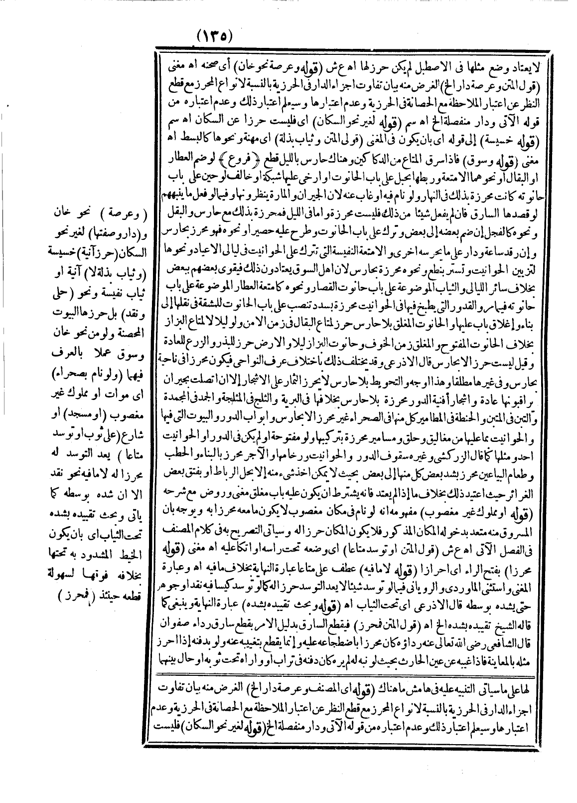 ـــــــــــــــــــــــــــــQلَا يُعْتَدُّ وَضْعُ مِثْلِهَا فِي الْإِصْطَبْلِ لَمْ يَكُنْ حِرْزًا لَهَا اهـ ع ش (قَوْلُهُ وَعَرْصَةُ نَحْوِ خَانٍ) أَيْ صَحْنُهُ اهـ مُغْنِي (قَوْلُ الْمَتْنِ وَعَرْصَةُ دَارٍ إلَخْ) الْغَرَضُ مِنْهُ بَيَانُ تَفَاوُتِ أَجْزَاءِ الدَّارِ فِي الْحِرْزِيَّةِ بِالنِّسْبَةِ لِأَنْوَاعِ الْمُحْرَزِ مَعَ قَطْعِ النَّظَرِ عَنْ اعْتِبَارِ الْمُلَاحَظَةِ مَعَ الْحَصَانَةِ فِي الْحِرْزِيَّةِ وَعَدَمِ اعْتِبَارِهَا وَسَيُعْلَمُ اعْتِبَارُ ذَلِكَ وَعَدَمُ اعْتِبَارِهِ مِنْ قَوْلِهِ الْآتِي وَدَارٌ مُنْفَصِلَةٌ إلَخْ اهـ سم (قَوْلُهُ لِغَيْرِ نَحْوِ السُّكَّانِ) أَيْ: فَلَيْسَتْ حِرْزًا عَنْ السُّكَّانِ اهـ سم (قَوْلُهُ خَسِيسَةً) إلَى قَوْلِهِ أَيْ: بِأَنْ يَكُونَ فِي الْمُغْنِي (قَوْلُ الْمَتْنِ وَثِيَابٌ بِذْلَةٍ) أَيْ مِهْنَةٍ وَنَحْوُهَا كَالْبُسُطِ اهـ مُغْنِي (قَوْلُهُ وَسُوقٌ) فَإِذَا سَرَقَ الْمَتَاعَ مِنْ الدَّكَاكِينِ وَهُنَاكَ حَارِسٌ بِاللَّيْلِ قُطِعَ.
