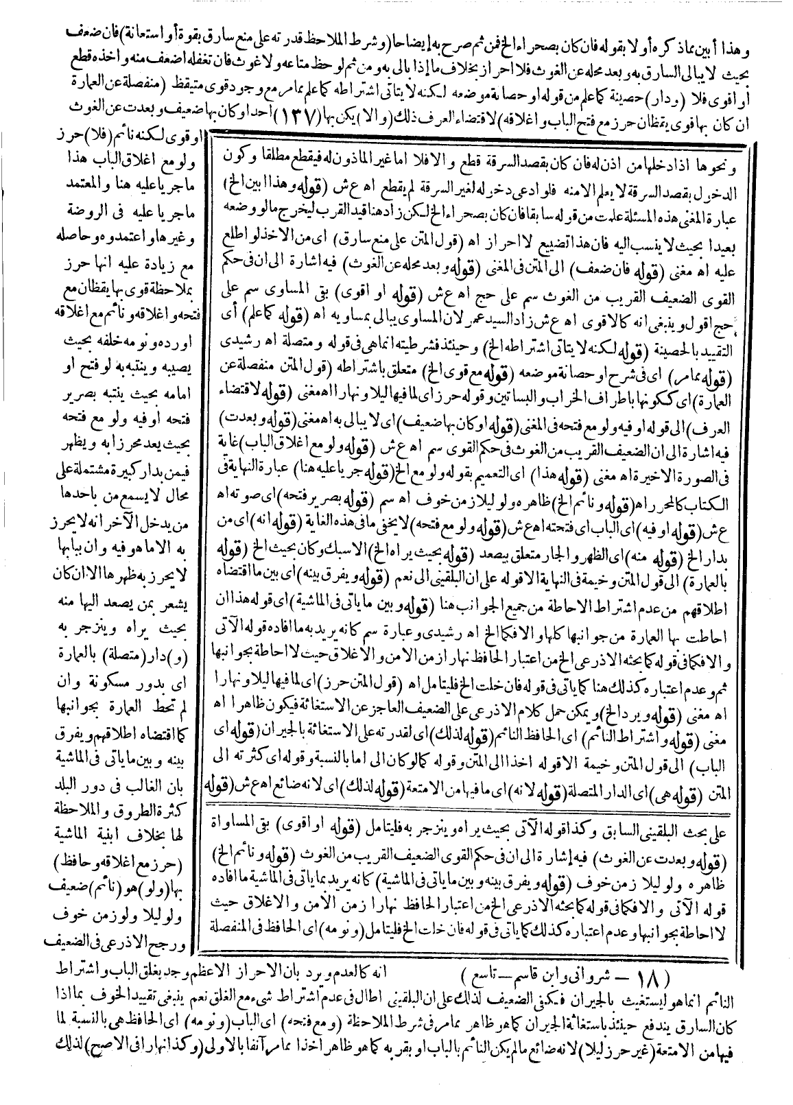 (وَشَرْطُ الْمُلَاحِظِ قُدْرَتُهُ عَلَى مَنْعِ سَارِقٍ بِقُوَّةٍ أَوْ اسْتِعَانَةٍ) فَإِنْ ضَعُفَ بِحَيْثُ لَا يُبَالِي السَّارِقُ بِهِ وَبَعُدَ مَحَلُّهُ عَنْ الْغَوْثِ فَلَا إحْرَازَ بِخِلَافِ مَا إذَا بَالَى بِهِ وَمِنْ ثَمَّ لَوْ لَاحَظَ مَتَاعَهُ وَلَا غَوْثَ فَإِنْ تَغَفَّلَهُ أَضْعَفُ مِنْهُ وَأَخَذَهُ قُطِعَ أَوْ أَقْوَى فَلَا (وَدَارٍ) حَصِينَةٍ كَمَا عُلِمَ مِنْ قَوْلِهِ أَوْ حَصَانَةِ مَوْضِعِهِ لَكِنَّهُ لَا يَتَأَتَّى اشْتِرَاطُهُ كَمَا عُلِمَ مِمَّا مَرَّ مَعَ وُجُودِ قَوِيٍّ مُتَيَقِّظٍ (مُنْفَصِلَةٍ عَنْ الْعِمَارَةِ إنْ كَانَ بِهَا قَوِيٌّ يَقْظَانُ حِرْزٌ مَعَ فَتْحِ الْبَابِ وَإِغْلَاقِهِ) لِاقْتِضَاءِ الْعُرْفِ ذَلِكَ (وَإِلَّا) يَكُنْ بِهَا أَحَدٌ أَوْ كَانَ بِهَا ضَعِيفٌ وَبَعُدَتْ عَنْ الْغَوْثِ أَوْ قَوِيٌّ لَكِنَّهُ نَائِمٌ (فَلَا) حِرْزَ وَلَوْ مَعَ إغْلَاقِ الْبَابِ هَذَا مَا جَرَيَا عَلَيْهِ هُنَا وَالْمُعْتَمَدُ مَا جَرَيَا عَلَيْهِ فِي الرَّوْضَةِ وَغَيْرِهَا وَاعْتَمَدُوهُ وَحَاصِلُهُ مَعَ زِيَادَةٍ عَلَيْهِ أَنَّهَا حِرْزٌ بِمُلَاحِظٍ قَوِيٍّ بِهَا يَقْظَانُ مَعَ فَتْحِهِ وَإِغْلَاقِهِ وَنَائِمٍ مَعَ إغْلَاقِهِ، أَوْ رَدِّهِ وَنَوْمِهِ خَلْفَهُ بِحَيْثُ يُصِيبُهُ وَيَنْتَبِهُ بِهِ لَوْ فُتِحَ أَوْ أَمَامَهُ بِحَيْثُ يَنْتَبِهُ بِصَرِيرِ فَتْحِهِ أَوْ فِيهِ وَلَوْ مَعَ فَتْحِهِ بِحَيْثُ يُعَدُّ مُحْرَزًا بِهِ وَيَظْهَرُ فِيمَنْ بِدَارٍ كَبِيرَةٍ مُشْتَمِلَةٍ عَلَى مَحَالٍّ لَا يَسْمَعُ مَنْ بِأَحَدِهَا مَنْ يَدْخُلُ الْآخَرَ أَنَّهُ لَا يَحْرُزُ بِهِ إلَّا مَا هُوَ فِيهِ وَأَنَّ مَنْ بِبَابِهَا لَا يَحْرُزُ بِهِ ظَهْرَهَا إلَّا إنْ كَانَ يَشْعُرُ بِمَنْ يَصْعَدُ إلَيْهَا مِنْهُ بِحَيْثُ يَرَاهُ وَيَنْزَجِرُ بِهِ (وَ) دَارٍ (مُتَّصِلَةٍ) بِالْعِمَارَةِ أَيْ بِدُورٍ مَسْكُونَةٍ وَإِنْ لَمْ تُحَطْ الْعِمَارَةُ بِجَوَانِبِهَا كَمَا اقْتَضَاهُ إطْلَاقُهُمْ وَيُفَرَّقُ بَيْنَهُ وَبَيْنَ مَا يَأْتِي فِي الْمَاشِيَةِ بِأَنَّ الْغَالِبَ فِي دُورِ الْبَلَدِ كَثْرَةُ الطُّرُوقِ وَالْمُلَاحَظَةِ لَهَا بِخِلَافِ أَبْنِيَةِ الْمَاشِيَةِ (حِرْزٌ مَعَ إغْلَاقِهِ وَحَافِظٌ) بِهَا (وَلَوْ) هُوَ (نَائِمٌ) ضَعِيفٌ وَلَوْ لَيْلًا وَلَوْ زَمَنَ خَوْفٍ وَرَجَّحَ الْأَذْرَعِيُّ فِي الضَّعِيفِ أَنَّهُ كَالْعَدَمِ وَيُرَدُّ بِأَنَّ الْإِحْرَازَ الْأَعْظَمَ وُجِدَ بِغَلْقِ الْبَابِ وَاشْتِرَاطِ النَّائِمِ إنَّمَا هُوَ لِيَسْتَغِيثَ بِالْجِيرَانِ فَكَفَى الضَّعِيفُ لِذَلِكَ عَلَى أَنَّ الْبُلْقِينِيَّ أَطَالَ فِي عَدَمِ اشْتِرَاطِ شَيْءٍ مَعَ الْغَلْقِ نَعَمْ يَنْبَغِي تَقْيِيدُ الْخَوْفِ بِمَا إذَا كَانَ السَّارِقُ يَنْدَفِعُ حِينَئِذٍ بِاسْتِغَاثَةِ الْجِيرَانِ كَمَا هُوَ ظَاهِرٌ مِمَّا مَرَّ فِي شَرْطِ الْمُلَاحِظِ (وَمَعَ فَتْحِهِ) أَيْ الْبَابِ (وَنَوْمِهِ) أَيْ الْحَافِظِ هِيَ بِالنِّسْبَةِ لِمَا فِيهَا مِنْ الْأَمْتِعَةِ (غَيْرُ حِرْزٍ لَيْلًا) لِأَنَّهُ ضَائِعٌ مَا لَمْ يَكُنْ النَّائِمُ بِالْبَابِ أَوْ بِقُرْبِهِ كَمَا هُوَ ظَاهِرٌ أَخْذًا مِمَّا مَرَّ آنِفًا بِالْأَوْلَى (وَكَذَا نَهَارًا فِي الْأَصَحِّ) لِذَلِكَ