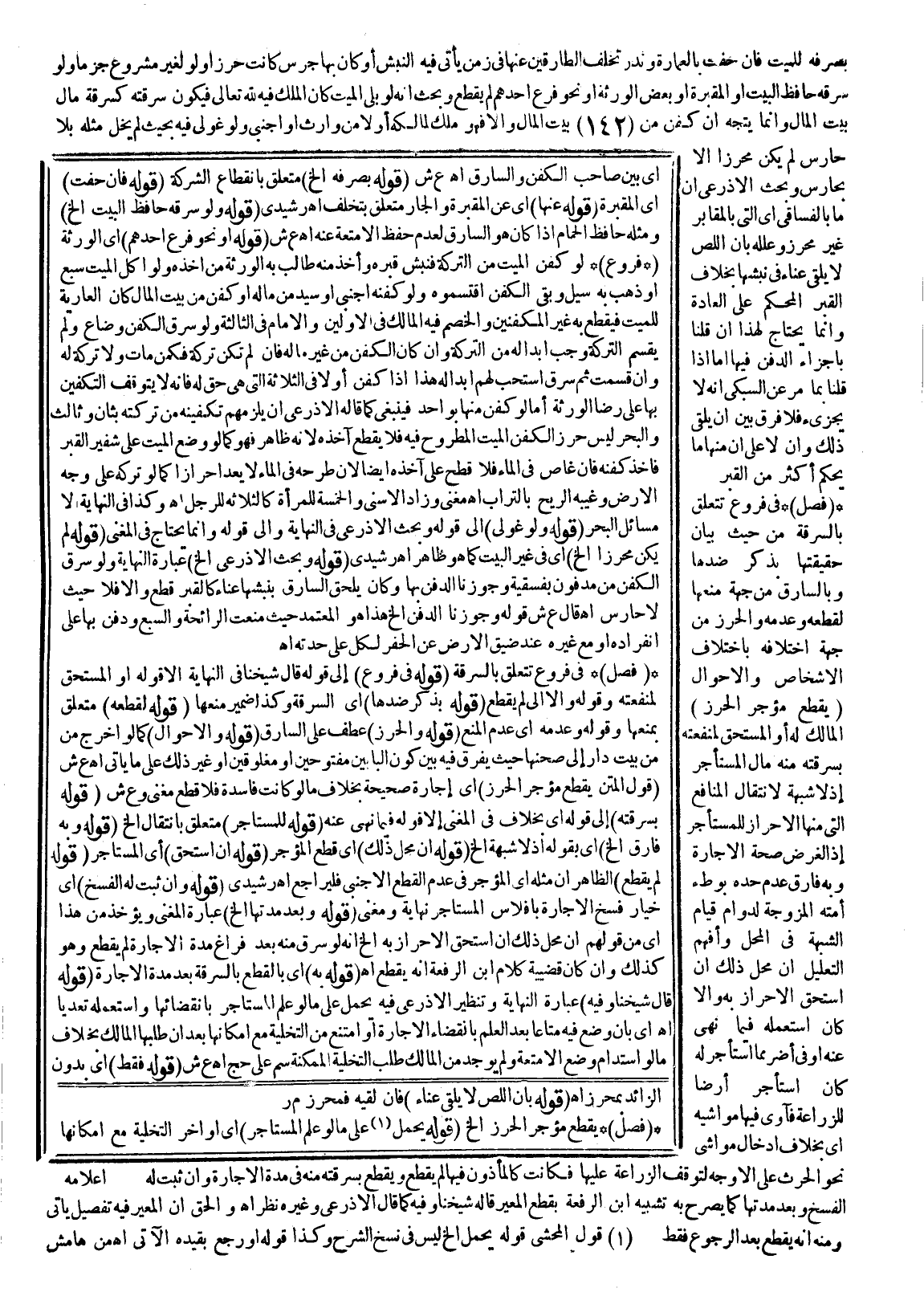 (فَصْلٌ) فِي فُرُوعٍ تَتَعَلَّقُ بِالسَّرِقَةِ مِنْ حَيْثُ بَيَانُ حَقِيقَتِهَا بِذِكْرِ ضِدِّهَا وَبِالسَّارِقِ مِنْ جِهَةِ مَنْعِهَا لِقَطْعِهِ وَعَدَمِهِ وَالْحِرْزِ مِنْ جِهَةِ اخْتِلَافِهِ بِاخْتِلَافِ الْأَشْخَاصِ وَالْأَحْوَالِ (يُقْطَعُ مُؤَجِّرُ الْحِرْزِ) الْمَالِكُ لَهُ أَوْ الْمُسْتَحِقُّ لِمَنْفَعَتِهِ بِسَرِقَتِهِ مِنْهُ مَالَ الْمُسْتَأْجِرِ إذْ لَا شُبْهَةَ لِانْتِقَالِ الْمَنَافِعِ الَّتِي مِنْهَا الْإِحْرَازُ لِلْمُسْتَأْجِرِ إذْ الْغَرَضُ صِحَّةُ الْإِجَارَةِ وَبِهِ فَارَقَ عَدَمَ حَدِّهِ بِوَطْءِ أَمَتِهِ الْمُزَوَّجَةِ لِدَوَامِ قِيَامِ الشُّبْهَةِ فِي الْمَحَلِّ وَأَفْهَمَ التَّعْلِيلُ أَنَّ مَحَلَّ ذَلِكَ إنْ اسْتَحَقَّ الْإِحْرَازَ بِهِ وَإِلَّا كَأَنْ اسْتَعْمَلَهُ فِيمَا نُهِيَ عَنْهُ أَوْ فِي أَضَرِّ مِمَّا اسْتَأْجَرَ لَهُ كَأَنْ اسْتَأْجَرَ أَرْضًا لِلزِّرَاعَةِ فَآوَى فِيهَا مَوَاشِيَهُ أَيْ بِخِلَافِ إدْخَالِ مَوَاشِي نَحْوِ الْحَرْثِ عَلَى الْأَوْجَهِ لِتَوَقُّفِ الزِّرَاعَةِ عَلَيْهَا فَكَانَتْ كَالْمَأْذُونِ فِيهَا لَمْ يُقْطَعْ، وَيُقْطَعُ بِسَرِقَتِهِ مِنْهُ فِي مُدَّةِ الْإِجَارَةِ وَإِنْ ثَبَتَ لَهُ الْفَسْخُ وَبَعْدَ مُدَّتِهَا كَمَا يُصَرِّحُ بِهِ تَشْبِيهُ ابْنِ الرِّفْعَةِ بِقَطْعِ الْمُعِيرِ قَالَهُ شَيْخُنَا وَفِيهِ كَمَا قَالَ الْأَذْرَعِيُّ وَغَيْرُهُ نَظَرٌ اهـ. وَالْحَقُّ أَنَّ الْمُعِيرَ فِيهِ تَفْصِيلٌ يَأْتِي وَمِنْهُ أَنَّهُ يُقْطَعُ بَعْدَ الرُّجُوعِ فَقَطْ قَوْلُ الْمُحَشِّي قَوْلُهُ يُحْمَلُ إلَخْ لَيْسَ فِي نُسَخِ الشَّرْحِ وَكَذَا قَوْلُهُ أَوْ رَجَعَ يُفِيدُهُ الْآتِي اهـ مِنْ هَامِشٍ