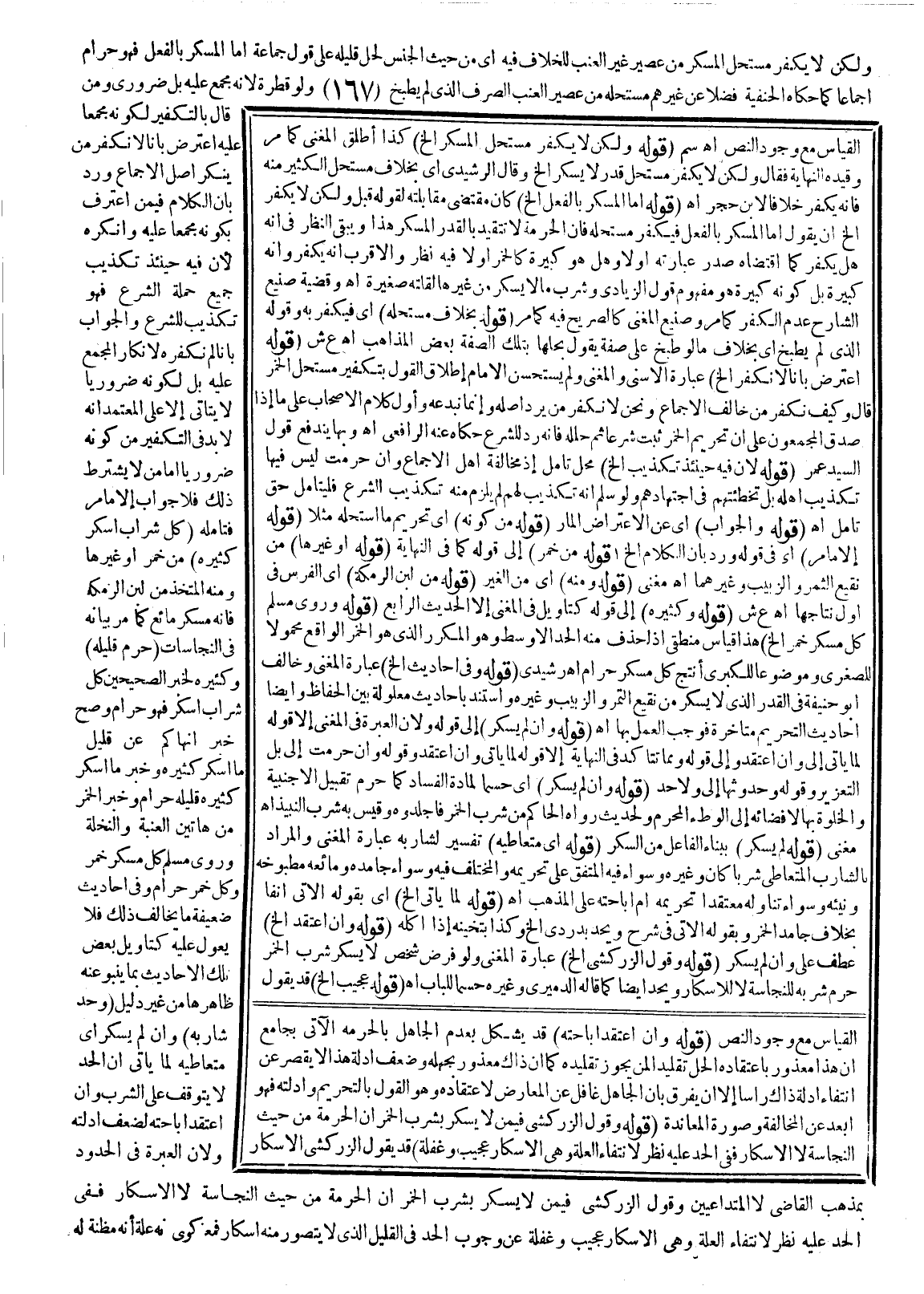 وَلَكِنْ لَا يَكْفُرُ مُسْتَحِلُّ الْمُسْكِرِ مِنْ عَصِيرِ غَيْرِ الْعِنَبِ لِلْخِلَافِ فِيهِ أَيْ مِنْ حَيْثُ الْجِنْسِ لِحِلِّ قَلِيلِهِ عَلَى قَوْلِ جَمَاعَةٍ، أَمَّا الْمُسْكِرُ بِالْفِعْلِ فَهُوَ حَرَامٌ إجْمَاعًا كَمَا حَكَاهُ الْحَنَفِيَّةُ فَضْلًا عَنْ غَيْرِهِمْ بِخِلَافِ مُسْتَحِلِّهِ مِنْ عَصِيرِ الْعِنَبِ الصِّرْفِ الَّذِي لَمْ يُطْبَخْ وَلَوْ قَطْرَةً؛ لِأَنَّهُ مُجْمَعٌ عَلَيْهِ بَلْ ضَرُورِيٌّ وَمَنْ قَالَ بِالتَّكْفِيرِ لِكَوْنِهِ مُجْمَعًا عَلَيْهِ اُعْتُرِضَ بِأَنَّا لَا نُكَفِّرُ مَنْ يُنْكِرُ أَصْلَ الْإِجْمَاعِ وَرُدَّ بِأَنَّ الْكَلَامَ فِيمَنْ اعْتَرَفَ بِكَوْنِهِ مُجْمَعًا عَلَيْهِ وَأَنْكَرَهُ؛ لِأَنَّ فِيهِ حِينَئِذٍ تَكْذِيبَ جَمِيعِ حَمَلَةِ الشَّرْعِ فَهُوَ تَكْذِيبٌ لِلشَّرْعِ وَالْجَوَابُ بِأَنَّا لَمْ نُكَفِّرْهُ لِإِنْكَارِ الْمُجْمَعِ عَلَيْهِ بَلْ لِكَوْنِهِ ضَرُورِيًّا لَا يَتَأَتَّى إلَّا عَلَى الْمُعْتَمَدِ أَنَّهُ لَا بُدَّ فِي التَّكْفِيرِ مِنْ كَوْنِهِ ضَرُورِيًّا أَمَّا مَنْ لَا يَشْتَرِطُ ذَلِكَ فَلَا جَوَابَ إلَّا مَا مَرَّ فَتَأَمَّلْهُ.