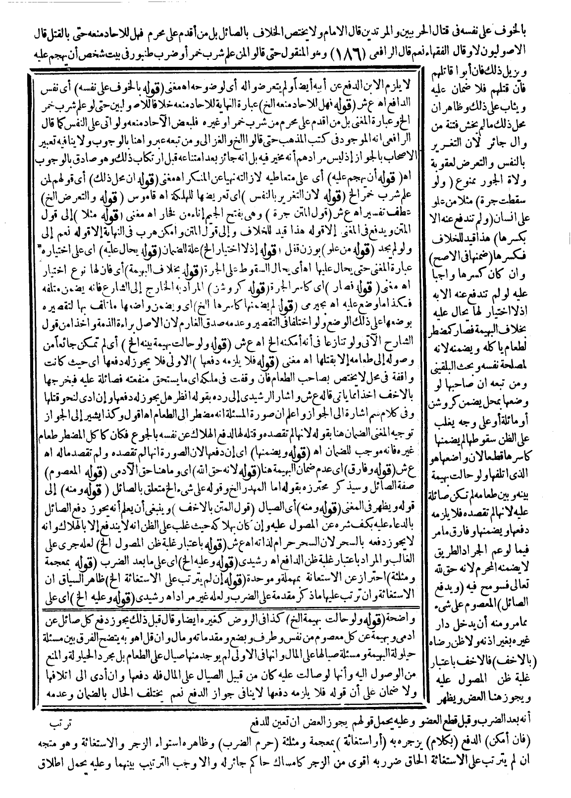 بِالْخَوْفِ عَلَى نَفْسِهِ فِي قِتَالِ الْحَرْبِيِّينَ وَالْمُرْتَدِّينَ، قَالَ الْإِمَامُ: وَلَا يَخْتَصُّ الْخِلَافُ بِالصَّائِلِ، بَلْ مَنْ أَقْدَمَ عَلَى مُحَرَّمٍ فَهَلْ لِلْآحَادِ مَنْعُهُ حَتَّى بِالْقَتْلِ؟ قَالَ الْأُصُولِيُّونَ: لَا. وَقَالَ الْفُقَهَاءُ: نَعَمْ. قَالَ الرَّافِعِيُّ: وَهُوَ الْمَنْقُولُ حَتَّى قَالُوا لِمَنْ عَلِمَ شُرْبَ خَمْرٍ أَوْ ضَرْبَ طُنْبُورٍ فِي بَيْتِ شَخْصٍ: أَنْ يَهْجُمَ عَلَيْهِ وَيُزِيلَ ذَلِكَ فَإِنْ أَبَوْا قَاتَلَهُمْ، فَإِنْ قَتَلَهُمْ فَلَا ضَمَانَ عَلَيْهِ وَيُثَابُ عَلَى ذَلِكَ. وَظَاهِرٌ أَنَّ مَحَلَّ ذَلِكَ مَا لَمْ يَخْشَ فِتْنَةً مِنْ وَالٍ جَائِرٍ؛ لِأَنَّ التَّغْرِيرَ بِالنَّفْسِ وَالتَّعَرُّضَ لِعُقُوبَةِ وُلَاةِ الْجَوْرِ مَمْنُوعٌ