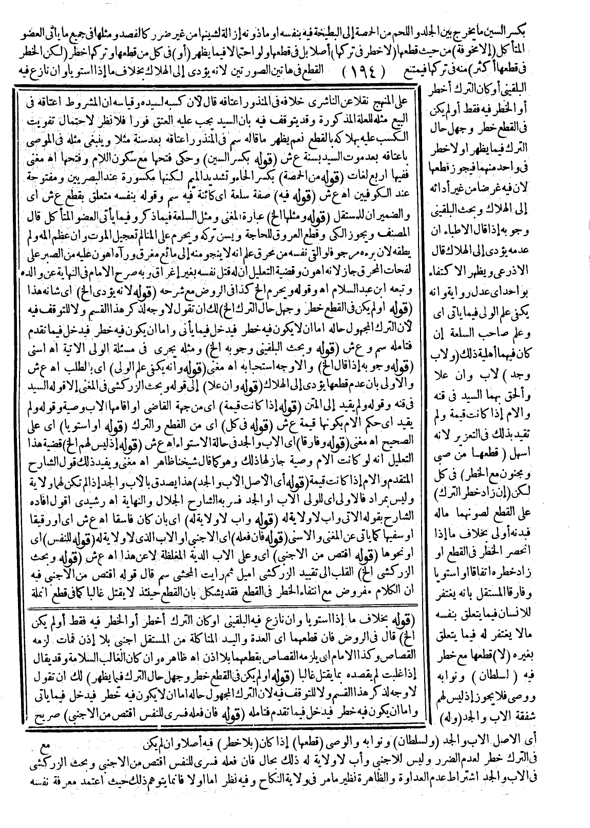 قَالَ الْأَذْرَعِيُّ: وَيَظْهَرُ الِاكْتِفَاءُ بِوَاحِدٍ أَيْ عَدْلٍ رِوَايَةً، وَأَنَّهُ يَكْفِي عِلْمُ الْوَلِيِّ فِيمَا يَأْتِي أَيْ: وَعِلْمُ صَاحِبِ السِّلْعَةِ إنْ كَانَ فِيهِمَا أَهْلِيَّةُ ذَلِكَ، (وَلِأَبٍ وَجَدٍّ) لِأَبٍ وَإِنْ عَلَا، وَأُلْحِقَ بِهِمَا السَّيِّدُ فِي قِنِّهِ وَالْأُمُّ إذَا كَانَتْ قَيِّمَةً وَلَمْ تُقَيَّدْ بِذَلِكَ فِي التَّعْزِيرِ؛ لِأَنَّهُ أَسْهَلُ (قَطْعُهَا مِنْ صَبِيٍّ وَمَجْنُونٍ مَعَ الْخَطَرِ) فِي كُلٍّ، لَكِنْ (إنْ زَادَ خَطَرُ التَّرْكِ) عَلَى الْقَطْعِ لِصَوْنِهِمَا مَالَهُ فَبَدَنُهُ أَوْلَى، بِخِلَافِ مَا إذَا انْحَصَرَ الْخَطَرُ فِي الْقَطْعِ أَوْ زَادَ خَطَرُهُ اتِّفَاقًا أَوْ اسْتَوَيَا، وَفَارَقَا الْمُسْتَقِلَّ بِأَنَّهُ يُغْتَفَرُ لِلْإِنْسَانِ فِيمَا يَتَعَلَّقُ بِنَفْسِهِ مَا لَا يُغْتَفَرُ لَهُ فِيمَا يَتَعَلَّقُ بِغَيْرِهِ، (لَا) قَطْعُهَا مَعَ خَطَرٍ فِيهِ (لِسُلْطَانٍ) وَنُوَّابِهِ وَوَصِيٍّ، فَلَا يَجُوزُ إذْ لَيْسَ لَهُمْ شَفَقَةُ الْأَبِ وَالْجَدِّ