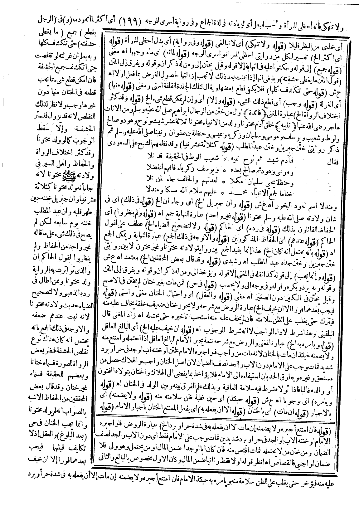 وَلَا تُنْهِكِي فَإِنَّهُ أَحْظَى لِلْمَرْأَةِ وَأَحَبُّ لِلْبَعْلِ.» أَيْ: لِزِيَادَتِهِ فِي لَذَّةِ الْجِمَاعِ. وَفِي رِوَايَةٍ: «أَسْرَى لِلْوَجْهِ» أَيْ أَكْثَرُ لِمَائِهِ وَدَمِهِ (وَ) فِي (الرَّجُلِ بِقَطْعِ) جَمِيعِ (مَا يُغَطِّي حَشَفَتَهُ) ؛ حَتَّى تَنْكَشِفَ كُلُّهَا وَبِهِ يُعْلَمُ أَنَّ غُرْلَتَهُ لَوْ تَقَلَّصَتْ حَتَّى انْكَشَفَ جَمِيعُ الْحَشَفَةِ فَإِنْ أَمْكَنَ قَطْعُ شَيْءٍ مِمَّا يَجِبُ قَطْعُهُ فِي الْخِتَانِ مِنْهَا دُونَ غَيْرِهَا وَجَبَ وَلَا نَظَرَ لِذَلِكَ التَّقَلُّصِ؛ لِأَنَّهُ قَدْ يَزُولُ فَتُسْتَرُ الْحَشَفَةُ وَإِلَّا سَقَطَ الْوُجُوبُ كَمَا لَوْ وُلِدَ مَخْتُونًا. وَقَدْ كَثُرَ اخْتِلَافُ الرُّوَاةِ وَالْحُفَّاظِ وَأَهْلِ السِّيَرِ فِي وِلَادَتِهِ - صَلَّى اللَّهُ عَلَيْهِ وَسَلَّمَ - مَخْتُونًا؛ لِأَنَّهُ جَاءَ أَنَّهُ وُلِدَ مَخْتُونًا كَثَلَاثَةَ عَشَرَ نَبِيًّا، وَأَنَّ جِبْرِيلَ خَتَنَهُ حِينَ طَهَّرَ قَلْبَهُ، وَأَنَّ عَبْدَ الْمُطَّلِبِ خَتَنَهُ يَوْمَ سَابِعِهِ، لَكِنْ لَمْ يَصِحَّ فِي ذَلِكَ شَيْءٌ عَلَى مَا قَالَهُ غَيْرُ وَاحِدٍ مِنْ الْحُفَّاظِ، وَلَمْ يَنْظُرُوا لِقَوْلِ الْحَاكِمِ أَنَّ الَّذِي تَوَاتَرَتْ بِهِ الرِّوَايَةُ «أَنَّهُ وُلِدَ مَخْتُونًا» ، وَمِمَّنْ أَطَالَ فِي رَدِّهِ الذَّهَبِيُّ وَلَا لِتَصْحِيحِ الضِّيَاءِ حَدِيثَ وِلَادَتِهِ مَخْتُونًا؛ لِأَنَّهُ ثَبَتَ عِنْدَهُمْ ضَعْفُهُ، وَالْأَوْجَهُ فِي ذَلِكَ الْجَمْعُ بِأَنَّهُ يُحْتَمَلُ أَنَّهُ كَانَ هُنَاكَ نَوْعُ تَقَلُّصٍ فِي الْحَشَفَةِ فَنَظَرَ بَعْضُ الرُّوَاةِ لِلصُّورَةِ فَسَمَّاهُ خِتَانًا وَبَعْضُهُمْ لِلْحَقِيقَةِ فَسَمَّاهُ غَيْرَ خِتَانٍ، وَقَدْ قَالَ بَعْضُ الْمُحَقِّقِينَ مِنْ الْحُفَّاظِ: الْأَشْبَهُ بِالصَّوَابِ أَنَّهُ لَمْ يُولَدْ مَخْتُونًا، وَإِنَّمَا يَجِبُ الْخِتَانُ فِي حَيٍّ (بَعْدَ الْبُلُوغِ) وَالْعَقْلِ؛ إذْ لَا تَكْلِيفَ قَبْلَهُمَا فَيَجِبُ بَعْدَهُمَا فَوْرًا إلَّا إنْ خِيفَ عَلَيْهِ مِنْهُ فَيُؤَخَّرُ حَتَّى يَغْلِبَ عَلَى الظَّنِّ سَلَامَتُهُ مِنْهُ، وَيَأْمُرُهُ بِهِ حِينَئِذٍ الْإِمَامُ، فَإِنْ امْتَنَعَ أَجْبَرَهُ وَلَا يَضْمَنُهُ إنْ مَاتَ إلَّا أَنْ يَفْعَلَهُ بِهِ فِي شِدَّةِ حَرٍّ أَوْ بَرْدٍ