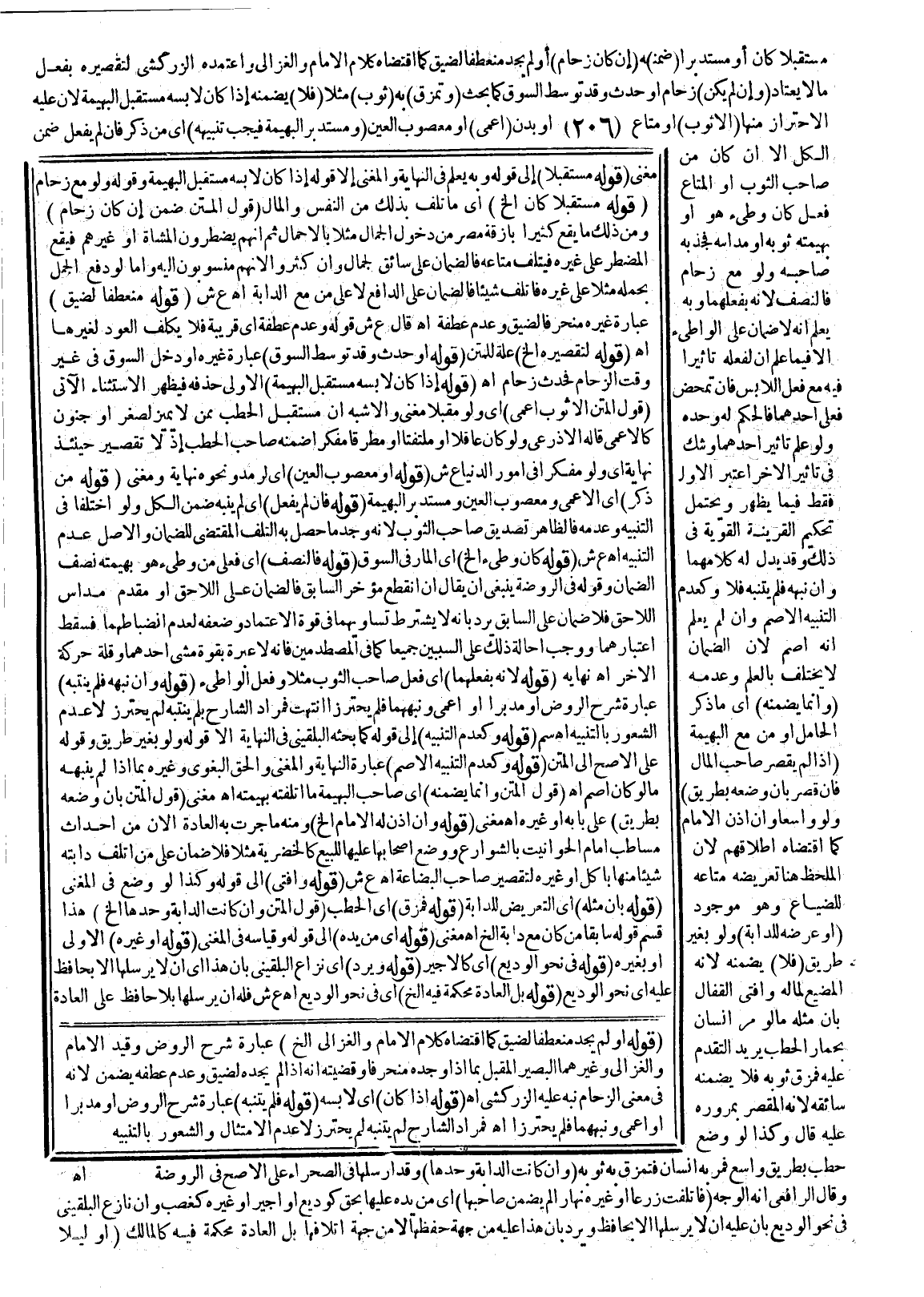 ـــــــــــــــــــــــــــــQمُغْنِي. (قَوْلُهُ: مُسْتَقْبِلًا) إلَى قَوْلِهِ: وَبِهِ يُعْلَمُ فِي النِّهَايَةِ وَالْمُغْنِي إلَّا قَوْلَهُ: إذَا كَانَ لَابِسُهُ مُسْتَقْبِلَ الْبَهِيمَةِ، وَقَوْلُهُ: وَلَوْ مَعَ زِحَامٍ. (قَوْلُهُ: مُسْتَقْبِلًا كَانَ إلَخْ) أَيْ: مَا تَلِفَ بِذَلِكَ مِنْ النَّفْسِ وَالْمَالِ. (قَوْلُ الْمَتْنِ: ضَمِنَ إنْ كَانَ زِحَامٌ) وَمِنْ ذَلِكَ مَا يَقَعُ كَثِيرًا بِأَزِقَّةِ مِصْرَ مِنْ دُخُولِ الْجِمَالِ مَثَلًا بِالْأَحْمَالِ ثُمَّ إنَّهُمْ يَضْطَرُّونَ الْمُشَاةَ أَوْ غَيْرَهُمْ فَيَقَعُ الْمُضْطَرُّ عَلَى غَيْرِهِ فَيُتْلِفُ مَتَاعَهُ، فَالضَّمَانُ عَلَى سَائِقِ الْجَمَلِ وَإِنْ كَثُرُوا؛ لِأَنَّهُمْ مَنْسُوبُونَ إلَيْهِ، وَأَمَّا لَوْ دَفَعَ الْجَمَلَ بِحَمْلِهِ مَثَلًا عَلَى غَيْرِهِ فَأَتْلَفَ شَيْئًا، فَالضَّمَانُ عَلَى الدَّافِعِ لَا عَلَى مَنْ مَعَ الدَّابَّةِ اهـ. ع ش. (قَوْلُهُ: مُنْعَطِفًا لِضَيِّقٍ) عِبَارَةُ غَيْرِهِ مُنْحَرِفًا لِضَيِّقٍ وَعَدَمِ عَطْفِهِ اهـ. قَالَ ع ش: قَوْلُهُ: وَعَدَمُ عَطْفِهِ أَيْ: قَرِيبَةٌ فَلَا يُكَلَّفُ الْعَوْدَ لِغَيْرِهَا اهـ. (قَوْلُهُ:؛ لِتَقْصِيرِهِ إلَخْ) عِلَّةٌ لِلْمَتْنِ. (قَوْلُهُ: أَوْ حَدَثَ وَقَدْ تَوَسَّطَ السُّوقَ) عِبَارَةُ غَيْرِهِ أَوْ دَخَلَ السُّوقَ فِي غَيْرِ وَقْتِ الزِّحَامِ فَحَدَثَ زِحَامٌ اهـ. (قَوْلُهُ: إذَا كَانَ لَابِسُهُ مُسْتَقْبِلَ الْبَهِيمَةِ) الْأَوْلَى حَذْفُهُ فَيَظْهَرُ الِاسْتِثْنَاءُ الْآتِي. (قَوْلُ الْمَتْنِ: إلَّا ثَوْبَ أَعْمَى) أَيْ: وَلَوْ مُقْبِلًا مُغْنِي، وَالْأَشْبَهُ أَنَّ مُسْتَقْبِلَ الْحَطَبِ مِمَّنْ لَا يُمَيِّزُ لِصِغَرٍ أَوْ جُنُونٍ كَالْأَعْمَى قَالَهُ الْأَذْرَعِيُّ، وَلَوْ كَانَ عَاقِلًا أَوْ مُلْتَفِتًا أَوْ مُطْرِقًا مُفَكِّرًا ضَمَّنَهُ صَاحِبُ الْحَطَبِ إذْ لَا تَقْصِيرَ حِينَئِذٍ نِهَايَةٌ أَيْ: وَلَوْ مُفَكِّرًا فِي أُمُورِ الدُّنْيَا ع ش. (قَوْلُهُ: أَوْ مَعْصُوبَ الْعَيْنِ) أَيْ: لِرَمَدٍ وَنَحْوِهِ نِهَايَةٌ وَمُغْنِي. (قَوْلُهُ: مَنْ ذُكِرَ) أَيْ: الْأَعْمَى وَمَعْصُوبُ الْعَيْنِ وَمُسْتَدْبِرُ الْبَهِيمَةِ.