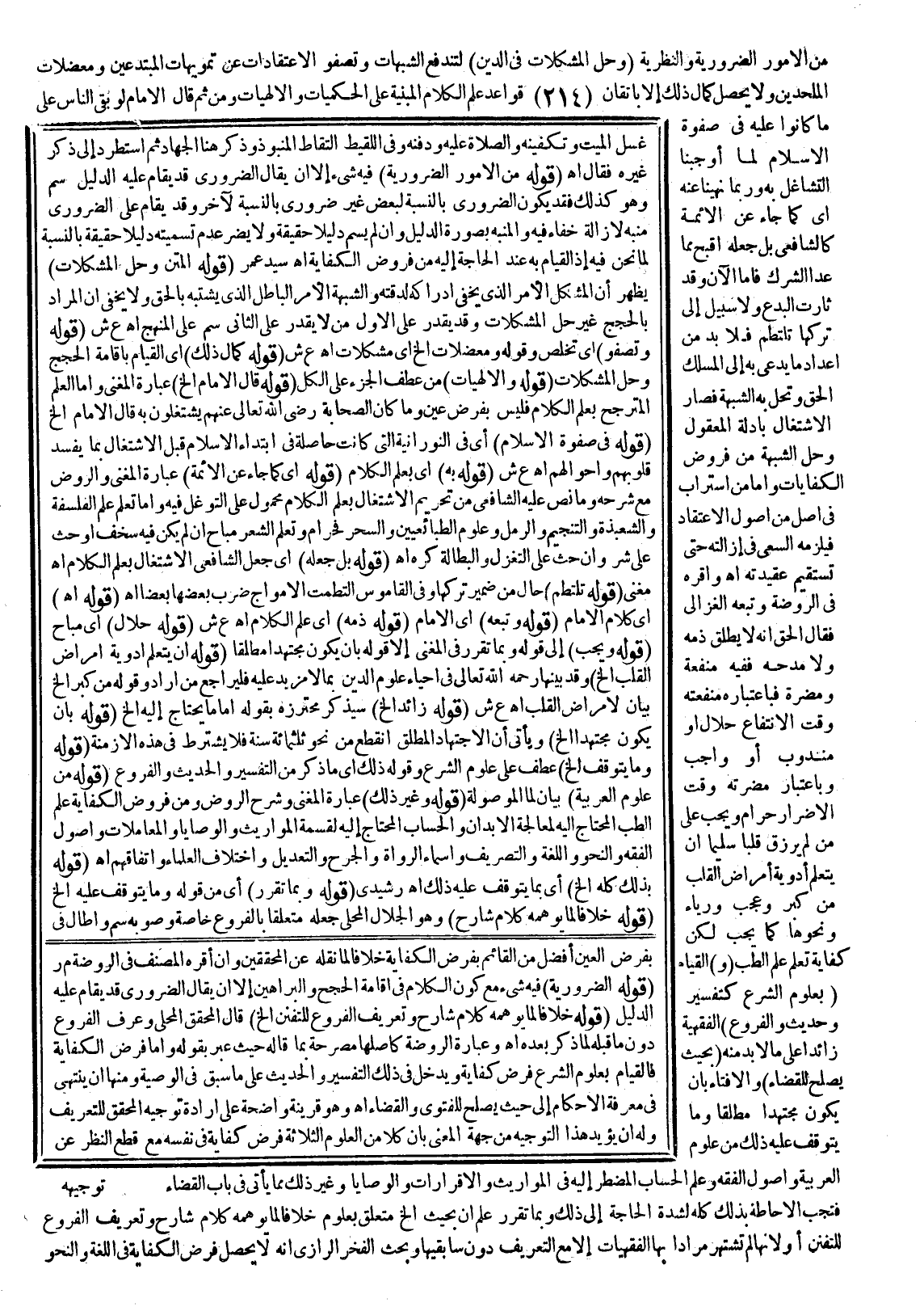 (وَ) الْقِيَامُ (بِعُلُومِ الشَّرْعِ كَتَفْسِيرٍ وَحَدِيثٍ وَالْفُرُوعِ) الْفِقْهِيَّةِ زَائِدًا عَلَى مَا لَا بُدَّ مِنْهُ، (بِحَيْثُ يَصْلُحُ لِلْقَضَاءِ) وَالْإِفْتَاءِ بِأَنْ يَكُونَ مُجْتَهِدًا مُطْلَقًا وَمَا يَتَوَقَّفُ عَلَيْهِ ذَلِكَ مِنْ عُلُومِ الْعَرَبِيَّةِ وَأُصُولِ الْفِقْهِ وَعِلْمِ الْحِسَابِ الْمُضْطَرِّ إلَيْهِ فِي الْمَوَارِيثِ وَالْإِقْرَارَاتِ وَالْوَصَايَا وَغَيْرِ ذَلِكَ مِمَّا يَأْتِي فِي بَابِ الْقَضَاءِ، فَتَجِبُ الْإِحَاطَةُ بِذَلِكَ كُلِّهِ لِشِدَّةِ الْحَاجَةِ إلَى ذَلِكَ، وَبِمَا تَقَرَّرَ عُلِمَ أَنَّ بِحَيْثُ إلَخْ مُتَعَلِّقٌ بِعُلُومٍ خِلَافًا لِمَا يُوهِمُهُ كَلَامُ شَارِحٍ، وَتَعْرِيفُ الْفُرُوعِ لِلتَّفَنُّنِ؛ أَوْ لِأَنَّهَا لَمْ تُشْتَهَرْ مُرَادًا بِهَا الْفِقْهِيَّاتُ لَا مَعَ التَّعْرِيفِ دُونَ سَابِقَيْهَا.