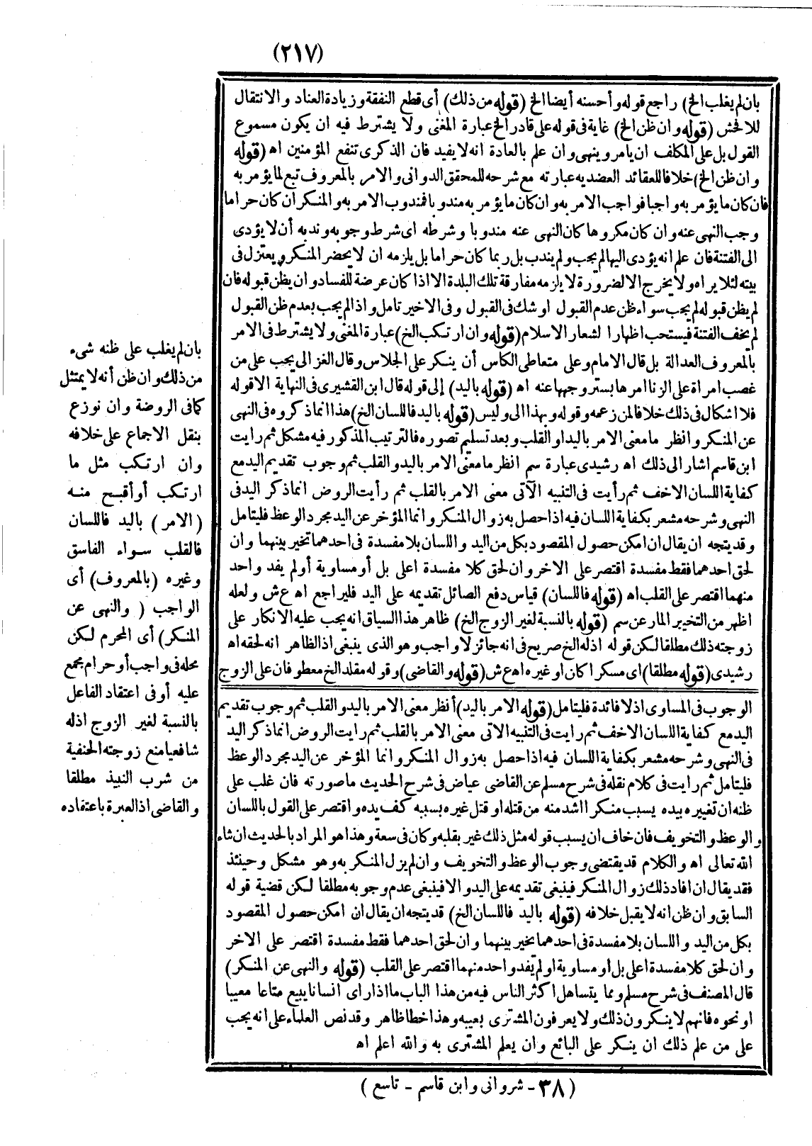 (قَوْلُهُ: الْأَمْرُ بِالْيَدِ) اُنْظُرْ مَعْنَى الْأَمْرِ بِالْيَدِ وَالْقَلْبِ ثُمَّ وُجُوبَ تَقْدِيمِ الْيَدِ مَعَ كِفَايَةِ اللِّسَانِ الْأَخَفَّ، ثُمَّ رَأَيْت فِي التَّنْبِيهِ الْآتِي مَعْنَى الْأَمْرِ بِالْقَلْبِ ثُمَّ رَأَيْت الرَّوْضَ إنَّمَا ذَكَرَ الْيَدَ فِي النَّهْيِ، وَشَرْحُهُ مُشْعِرٌ بِكِفَايَةِ اللِّسَانِ فِيهِ إذَا حَصَلَ بِهِ زَوَالُ الْمُنْكَرِ، وَإِنَّمَا الْمُؤَخَّرُ عَنْ الْيَدِ مُجَرَّدُ الْوَعْظِ فَلْيُتَأَمَّلْ. ثُمَّ رَأَيْت فِي كَلَامٍ نَقَلَهُ فِي شَرْحِ مُسْلِمٍ عَنْ الْقَاضِي عِيَاضٍ فِي شَرْحِ الْحَدِيثِ مَا صُورَتُهُ: فَإِنْ غَلَبَ عَلَى ظَنِّهِ أَنَّ تَغْيِيرَهُ بِيَدِهِ يُسَبِّبُ مُنْكَرًا أَشَدَّ مِنْهُ مِنْ قَتْلِهِ أَوْ قَتْلِ غَيْرِهِ بِسَبَبِهِ كَفَّ يَدَهُ وَاقْتَصَرَ عَلَى الْقَوْلِ بِاللِّسَانِ وَالْوَعْظِ وَالتَّخْوِيفِ، فَإِنْ خَافَ أَنْ يُسَبِّبَ قَوْلُهُ مِثْلَ ذَلِكَ غَيَّرَ بِقَلْبِهِ وَكَانَ فِي سَعَةٍ، وَهَذَا هُوَ الْمُرَادُ بِالْحَدِيثِ إنْ شَاءَ اللَّهُ تَعَالَى اهـ. وَالْكَلَامُ قَدْ يَقْتَضِي وُجُوبَ الْوَعْظِ وَالتَّخْوِيفِ وَإِنْ لَمْ يَزُلْ الْمُنْكَرُ بِهِ وَهُوَ مُشْكِلٌ، وَحِينَئِذٍ فَقَدْ يُقَالُ: إنْ أَفَادَ ذَلِكَ زَوَالَ الْمُنْكَرِ فَيَنْبَغِي تَقْدِيمُهُ عَلَى الْيَدِ وَإِلَّا فَيَنْبَغِي عَدَمُ وُجُوبِهِ مُطْلَقًا، لَكِنْ قَضِيَّةُ قَوْلِهِ السَّابِقِ وَإِنْ ظَنَّ أَنَّهُ لَا يَقْبَلُ خِلَافَهُ. (قَوْلُهُ: بِالْيَدِ فَاللِّسَانِ إلَخْ) قَدْ يُتَّجَهُ أَنْ يُقَالَ: إنْ أَمْكَنَ حُصُولُ الْمَقْصُودِ بِكُلٍّ مِنْ الْيَدِ وَاللِّسَانِ بِلَا مَفْسَدَةٍ فِي أَحَدِهِمَا يُخَيَّرُ بَيْنَهُمَا، وَإِنْ لَحِقَ أَحَدُهُمَا فَقَطْ مَفْسَدَةٌ اقْتَصَرَ عَلَى الْآخَرِ وَإِنْ لَحِقَ كُلًّا مَفْسَدَةٌ أَعْلَى، بَلْ أَوْ مُسَاوِيَةٌ أَوْ لَمْ يُفِدْ وَاحِدٌ مِنْهُمَا اقْتَصَرَ عَلَى الْقَلْبِ.