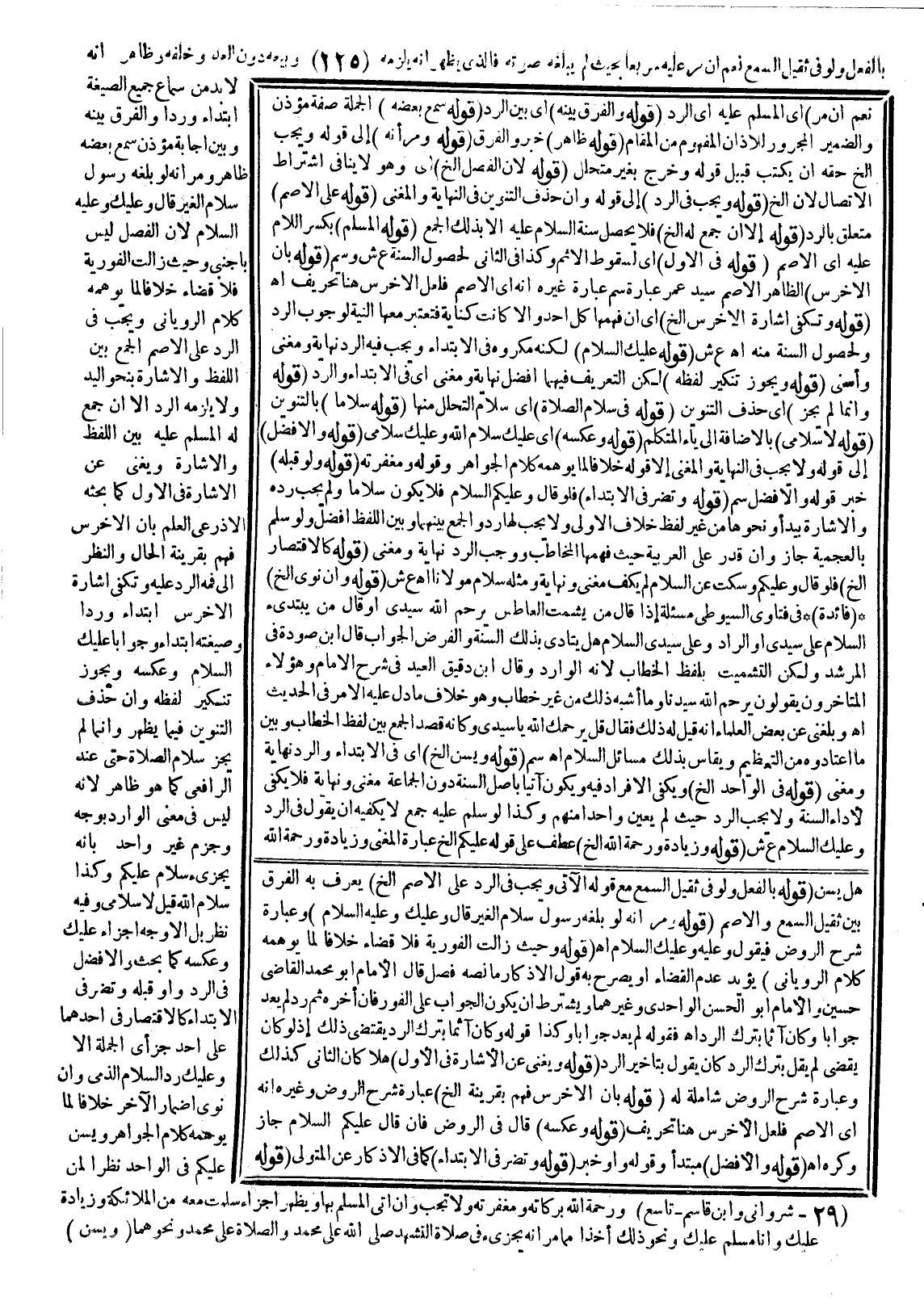 بِالْفِعْلِ وَلَوْ فِي ثَقِيلِ السَّمْعِ، نَعَمْ إنْ مَرَّ عَلَيْهِ سَرِيعًا بِحَيْثُ لَمْ يَبْلُغْهُ صَوْتُهُ فَاَلَّذِي يَظْهَرُ أَنَّهُ يَلْزَمُهُ الرَّفْعُ وَسِعَهُ دُونَ الْعَدْوِ خَلْفَهُ، وَظَاهِرٌ أَنَّهُ لَا بُدَّ مِنْ سَمَاعِ جَمِيعِ الصِّيغَةِ ابْتِدَاءً وَرَدًّا، وَالْفَرْقُ بَيْنَهُ وَبَيْنَ إجَابَةِ مُؤَذِّنٍ سَمِعَ بَعْضَهُ ظَاهِرٌ، وَمَرَّ أَنَّهُ لَوْ بَلَّغَهُ رَسُولٌ سَلَامَ الْغَيْرِ، قَالَ: وَعَلَيْك وَعَلَيْهِ السَّلَامُ؛ لِأَنَّ الْفَصْلَ لَيْسَ بِأَجْنَبِيٍّ وَحَيْثُ زَالَتْ الْفَوْرِيَّةُ فَلَا قَضَاءَ، خِلَافًا لِمَا يُوهِمُهُ كَلَامُ الرُّويَانِيِّ، وَيَجِبُ فِي الرَّدِّ عَلَى الْأَصَمِّ الْجَمْعُ بَيْنَ اللَّفْظِ وَالْإِشَارَةِ بِنَحْوِ الْيَدِ، وَلَا يَلْزَمُهُ الرَّدُّ إلَّا إنْ جَمَعَ لَهُ الْمُسَلِّمُ عَلَيْهِ بَيْنَ اللَّفْظِ وَالْإِشَارَةِ، وَيُغْنِي عَنْ الْإِشَارَةِ فِي الْأَوَّلِ كَمَا بَحَثَهُ الْأَذْرَعِيُّ الْعِلْمُ بِأَنَّ الْأَخْرَسَ فَهِمَ بِقَرِينَةِ الْحَالِ، وَالنَّظَرِ إلَى فَمِهِ الرَّدُّ عَلَيْهِ، وَتَكْفِي إشَارَةُ الْأَخْرَسِ ابْتِدَاءً وَرَدًّا، وَصِيغَتُهُ ابْتِدَاءً وَجَوَابًا: عَلَيْك السَّلَامُ وَعَكْسُهُ، وَيَجُوزُ تَنْكِيرُ لَفْظِهِ وَإِنْ حَذَفَ التَّنْوِينَ فِيمَا يَظْهَرُ، وَإِنَّمَا لَمْ يَجُزْ فِي سَلَامِ الصَّلَاةِ حَتَّى عِنْدَ الرَّافِعِيِّ كَمَا هُوَ ظَاهِرٌ؛ لِأَنَّهُ لَيْسَ فِي مَعْنَى الْوَارِدِ بِوَجْهٍ، وَجَزَمَ غَيْرُ وَاحِدٍ بِأَنَّهُ يُجْزِئُ سَلَامًا عَلَيْكُمْ، وَكَذَا سَلَامُ اللَّهِ، قِيلَ: لَا سَلَامِي وَفِيهِ نَظَرٌ، بَلْ الْأَوْجَهُ إجْزَاءُ عَلَيْك وَعَكْسُهُ كَمَا بَحَثَ. وَالْأَفْضَلُ فِي الرَّدِّ وَاوٌ قَبْلَهُ، وَتَضُرُّ فِي الِابْتِدَاءِ كَالِاقْتِصَارِ فِي أَحَدِهِمَا عَلَى أَحَدِ جُزْأَيْ الْجُمْلَةِ إلَّا وَعَلَيْك رَدُّ السَّلَامِ الذِّمِّيِّ، وَإِنْ نَوَى إضْمَارَ الْآخَرِ خِلَافًا لِمَا يُوهِمُهُ كَلَامُ الْجَوَاهِرِ وَيُسَنُّ عَلَيْكُمْ فِي الْوَاحِدِ نَظَرًا لِمَنْ مَعَهُ مِنْ الْمَلَائِكَةِ، وَزِيَادَةُ وَرَحْمَةُ اللَّهِ وَبَرَكَاتُهُ وَمَغْفِرَتُهُ، وَلَا تَجِبُ وَإِنْ أَتَى الْمُسَلِّمُ بِهَا، وَيَظْهَرُ إجْزَاءُ سَلَّمْت عَلَيْك وَأَنَا مُسَلِّمٌ عَلَيْك وَنَحْوُ ذَلِكَ أَخْذًا مِمَّا مَرَّ أَنَّهُ يُجْزِئُ فِي صَلَاةِ التَّشَهُّدِ: صَلَّى اللَّهُ عَلَى مُحَمَّدٍ، وَالصَّلَاةُ عَلَى مُحَمَّدٍ وَنَحْوُهُمَا