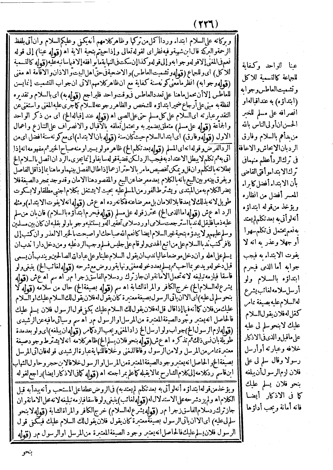 (قَوْلُهُ وَجَوَابِهِ) اُنْظُرْ مَا مَعْنَى كَوْنِهِ سُنَّةً كِفَايَةً مَعَ أَنَّ ظَاهِرَ كَلَامِهِمْ الْآتِي أَنَّ جَوَابَ التَّشْمِيتِ إنَّمَا يُسَنُّ لِلْعَاطِسِ إلَّا أَنْ يُحْمَلَ مَا هُنَا عَلَى تَعَدُّدِ الْعَاطِسِ فِي وَقْتٍ وَاحِدٍ فَلْيُرَاجَعْ (قَوْلُهُ بِهِ) أَيْ: بِالسَّلَامِ وَتَقْدِيرُهُ لَفْظَةَ " بِهِ " مَبْنِيٌّ عَلَى إرْجَاعِ ضَمِيرٍ ابْتِدَاؤُهُ لِلشَّخْصِ، وَالظَّاهِرُ رُجُوعُهُ لِلسَّلَامِ كَمَا جَرَى عَلَيْهِ الْمُغْنِي وَاسْتَغْنَى عَنْ التَّقْدِيرِ عِبَارَتُهُ أَيْ: السَّلَامُ عَلَى كُلِّ مُسَلِّمٍ حَتَّى عَلَى الصَّبِيِّ اهـ.