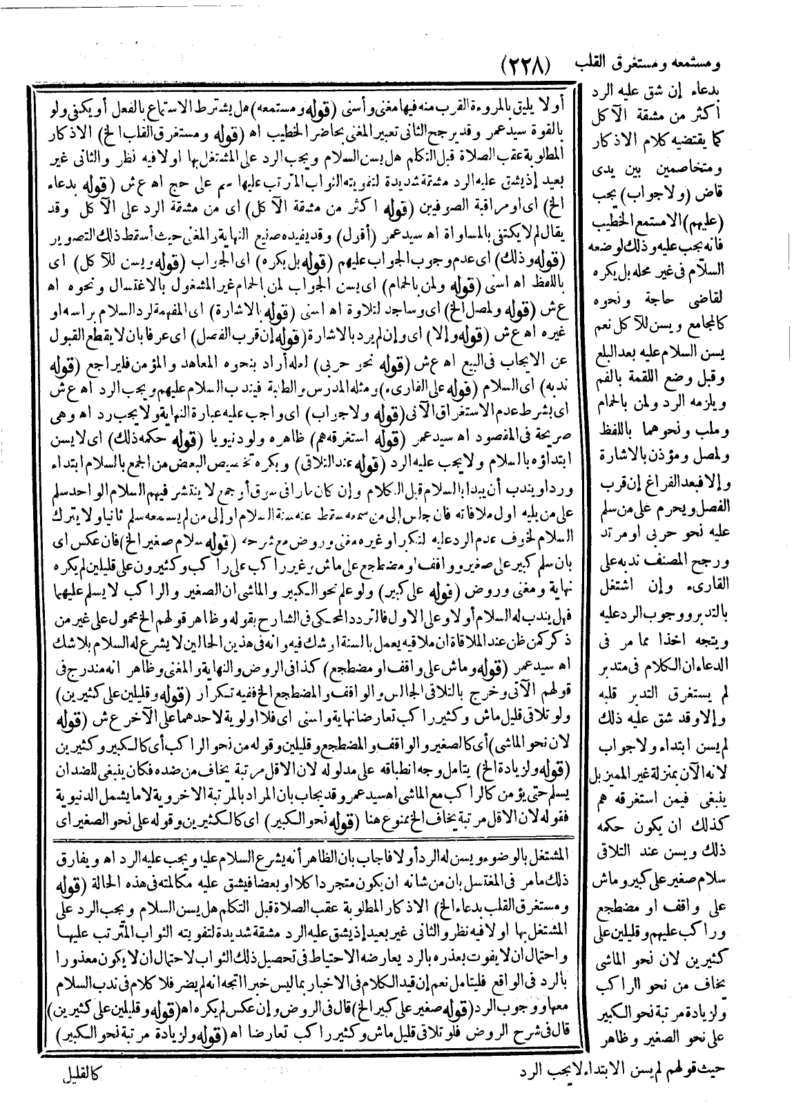 ـــــــــــــــــــــــــــــSالْمُشْتَغِلِ بِالْوُضُوءِ وَيُسَنُّ لَهُ الرَّدُّ أَوْ لَا؟ فَأَجَابَ بِأَنَّ الظَّاهِرَ أَنَّهُ يُشْرَعُ السَّلَامُ عَلَيْهِ وَيَجِبُ عَلَيْهِ الرَّدُّ. اهـ. وَيُفَارِقُ ذَلِكَ مَا مَرَّ فِي الْمُغْتَسِلِ بِأَنَّ مِنْ شَأْنِهِ أَنْ يَكُونَ مُتَجَرِّدًا كُلًّا أَوْ بَعْضًا فَيَشُقُّ عَلَيْهِ مُكَالَمَتُهُ فِي هَذِهِ الْحَالَةِ. (قَوْلُهُ: وَمُسْتَغْرِقِ الْقَلْبِ بِدُعَاءٍ إلَخْ) الْأَذْكَارُ الْمَطْلُوبَةُ عَقِبَ الصَّلَاةِ قَبْلَ التَّكَلُّمِ هَلْ يُسَنُّ السَّلَامُ وَيَجِبُ الرَّدُّ عَلَى الْمُشْتَغِلِ بِهَا أَوْ لَا؟ فِيهِ نَظَرٌ، وَالثَّانِي غَيْرُ بَعِيدٍ إذْ يَشُقُّ عَلَيْهِ الرَّدُّ مَشَقَّةٌ شَدِيدَةٌ لِتَفْوِيتِهِ الثَّوَابَ الْمُتَرَتِّبَ عَلَيْهَا، وَاحْتِمَالُ أَنْ لَا يَفُوتَ بِعُذْرِهِ بِالرَّدِّ يُعَارِضُهُ الِاحْتِيَاطُ فِي تَحْصِيلِ ذَلِكَ الثَّوَابِ لِاحْتِمَالِ أَنْ لَا يَكُونَ مَعْذُورًا بِالرَّدِّ فِي الْوَاقِعِ فَلْيُتَأَمَّلْ، نَعَمْ إنْ قَيَّدَ الْكَلَامَ فِي الْأَخْبَارِ بِمَا لَيْسَ خَبَرًا اتَّجَهَ أَنَّهُ لَمْ يَضُرَّ فَلَا كَلَامَ فِي نَدْبِ السَّلَامِ مَعَهَا وَوُجُوبِ الرَّدِّ. (قَوْلُهُ: صَغِيرٍ عَلَى كَبِيرٍ إلَخْ) قَالَ فِي الرَّوْضِ وَإِنْ عَكَسَ لَمْ يُكْرَهْ. اهـ. (قَوْلُهُ: وَقَلِيلِينَ عَلَى كَثِيرِينَ) قَالَ فِي شَرْحِ الرَّوْضِ فَلَوْ تَلَاقَى قَلِيلٌ مَاشٍ وَكَثِيرٌ رَاكِبٌ تَعَارَضَا. اهـ. (قَوْلُهُ: وَلِزِيَادَةِ مَرْتَبَةٍ نَحْوُ الْكَبِيرِ)