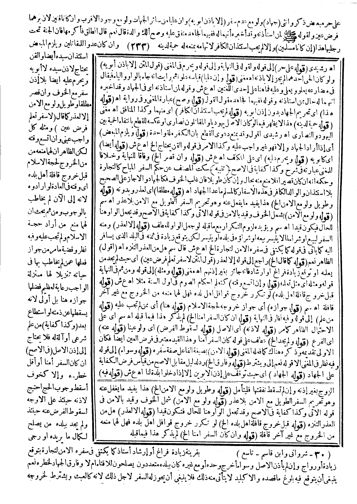 وَيَلْزَمُ الْمُبَعَّضَ اسْتِئْذَانُ سَيِّدِهِ أَيْضًا، وَالْقِنُّ يَحْتَاجُ لِإِذْنِ سَيِّدِهِ لَا أَبَوَيْهِ، وَيَحْرُمُ عَلَيْهِ أَيْضًا بِلَا إذْنٍ سَفَرٌ مَعَ الْخَوْفِ وَإِنْ قَصُرَ مُطْلَقًا وَطَوِيلٌ وَلَوْ مَعَ الْأَمْنِ.