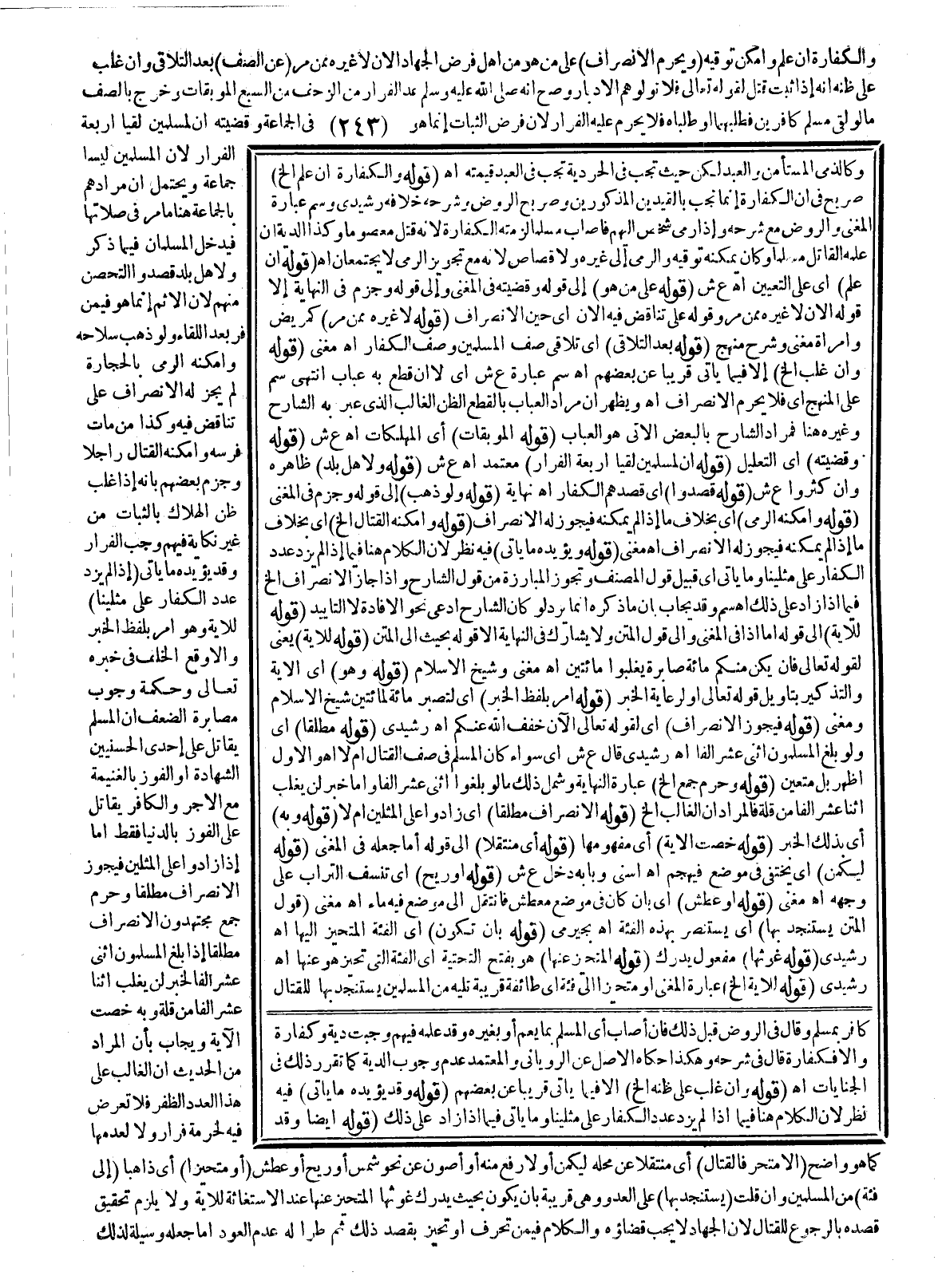 أَمَّا إذَا زَادُوا عَلَى الْمِثْلَيْنِ فَيَجُوزُ الِانْصِرَافُ مُطْلَقًا وَحَرَّمَ جَمْعٌ مُجْتَهِدُونَ الِانْصِرَافَ مُطْلَقًا إذَا بَلَغَ الْمُسْلِمُونَ اثْنَيْ عَشَرَ أَلْفًا لِلْخَبَرِ «لَنْ يُغْلَبَ اثْنَا عَشَر أَلْفًا مِنْ قِلَّةٍ» وَبِهِ خَصَّتْ الْآيَةُ وَيُجَابُ بِأَنَّ الْمُرَادَ مِنْ الْحَدِيثِ أَنَّ الْغَالِبَ عَلَى هَذَا الْعَدَدِ الظَّفَرُ فَلَا تَعَرُّضَ فِيهِ لِحُرْمَةِ فِرَارٍ وَلَا لِعَدَمِهَا كَمَا هُوَ وَاضِحٌ. {إِلا مُتَحَرِّفًا لِقِتَالٍ} [الأنفال: 16] أَيْ مُنْتَقِلًا عَنْ مَحَلِّهِ لِيَكْمُنَ أَوْ لِأَرْفَعَ مِنْهُ أَوْ أَصْوَنَ عَنْ نَحْوِ شَمْسٍ أَوْ رِيحٍ أَوْ عَطَشٍ. {أَوْ مُتَحَيِّزًا} [الأنفال: 16] أَيْ ذَاهِبًا. {إِلَى فِئَةٍ} [الأنفال: 16] مِنْ الْمُسْلِمِينَ وَإِنْ قَلَّتْ. (يَسْتَنْجِدُ بِهَا) عَلَى الْعَدُوِّ وَهِيَ قَرِيبَةٌ بِأَنْ يَكُونَ بِحَيْثُ يُدْرِكُ غَوْثُهَا الْمُتَحَيِّزَ عَنْهُمَا عِنْدَ الِاسْتِغَاثَةِ لِلْآيَةِ وَلَا يَلْزَمُ تَحْقِيقُ قَصْدِهِ بِالرُّجُوعِ لِلْقِتَالِ؛ لِأَنَّ الْجِهَادَ لَا يَجِبُ قَضَاؤُهُ وَالْكَلَامُ فِيمَنْ تَحَرَّفَ أَوْ تَحَيَّزَ بِقَصْدِ ذَلِكَ، ثُمَّ طَرَأَ لَهُ عَدَمُ الْعَوْدِ، أَمَّا جَعْلُهُ وَسِيلَةً لِذَلِكَ
