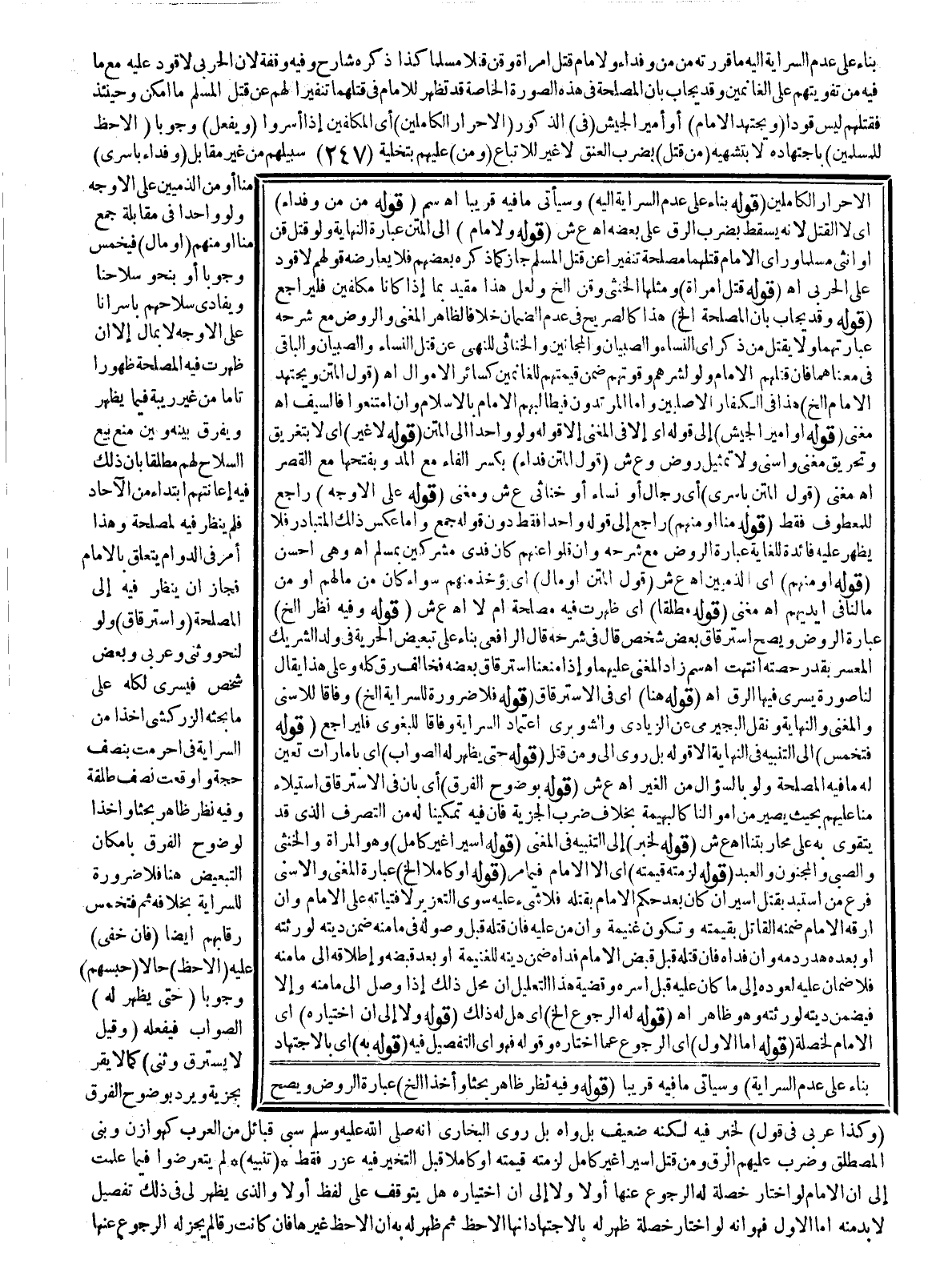 . (وَيَجْتَهِدُ الْإِمَامُ) أَوْ أَمِيرُ الْجَيْشِ. (فِي) الذُّكُورِ. (الْأَحْرَارِ الْكَامِلِينَ) أَيْ الْمُكَلَّفِينَ إذَا أُسِرُوا. (وَيَفْعَلُ) وُجُوبًا. (الْأَحَظَّ لِلْمُسْلِمِينَ) بِاجْتِهَادِهِ لَا بِتَشَهِّيهِ. (مِنْ قَتْلٍ) بِضَرْبِ الْعُنُقِ لَا غَيْرَ لِلِاتِّبَاعِ. (وَمَنٍّ) عَلَيْهِمْ بِتَخْلِيَةِ سَبِيلِهِمْ مِنْ غَيْرِ مُقَابِلٍ. (وَفِدَاءٍ بِأَسْرَى) مِنَّا أَوْ مِنْ الذِّمِّيِّينَ عَلَى الْأَوْجَهِ وَلَوْ وَاحِدًا فِي مُقَابَلَةِ جَمْعٍ مِنَّا أَوْ مِنْهُمْ. (أَوْ مَالٍ) فَيُخَمَّسُ وُجُوبًا أَوْ بِنَحْوِ سِلَاحِنَا وَيُفَادِي سِلَاحَهُمْ بِأَسْرَانَا عَلَى الْأَوْجَهِ لَا بِمَالٍ إلَّا إنْ ظَهَرَتْ فِيهِ الْمَصْلَحَةُ ظُهُورًا تَامًّا مِنْ غَيْرِ رِيبَةٍ فِيمَا يَظْهَرُ وَيُفَرَّقُ بَيْنَهُ وَبَيْنَ مَنْعِ بَيْعِ السِّلَاحِ لَهُمْ مُطْلَقًا بِأَنَّ ذَلِكَ فِيهِ إعَانَتُهُمْ ابْتِدَاءً مِنْ الْآحَادِ فَلَمْ يُنْظَرْ فِيهِ لِمَصْلَحَةٍ وَهَذَا أَمْرٌ فِي الدَّوَامِ يَتَعَلَّقُ بِالْإِمَامِ فَجَازَ أَنْ يُنْظَرَ فِيهِ إلَى الْمَصْلَحَةِ. (وَاسْتِرْقَاقٍ) وَلَوْ لِنَحْوِ وَثَنِيٍّ وَعَرَبِيٍّ وَبَعْضِ شَخْصٍ فَيَسْرِي لِكُلِّهِ عَلَى مَا بَحَثَهُ الزَّرْكَشِيُّ أَخْذًا مِنْ السِّرَايَةِ فِي أَحْرَمْت بِنِصْفِ حَجَّةٍ وَأَوْقَعْت نِصْفَ طَلْقَةٍ وَفِيهِ نَظَرٌ ظَاهِرٌ بَحْثًا وَأَخْذًا لِوُضُوحِ الْفَرْقِ بِإِمْكَانِ التَّبْعِيضِ هُنَا فَلَا ضَرُورَةَ لِلسِّرَايَةِ بِخِلَافِهِ ثَمَّ فَتُخَمَّسُ رِقَابُهُمْ أَيْضًا. (فَإِنْ خَفِيَ) عَلَيْهِ. (الْأَحَظُّ) حَالًا. (حَبَسَهُمْ) وُجُوبًا. (حَتَّى يَظْهَرَ لَهُ) الصَّوَابُ فَيَفْعَلَهُ. (وَقِيلَ لَا يُسْتَرَقُّ وَثَنِيٌّ) كَمَا لَا يُقِرُّ بِجِزْيَةٍ وَيُرَدُّ بِوُضُوحِ الْفَرْقِ. (وَكَذَا عَرَبِيٌّ فِي قَوْلٍ) لِخَبَرٍ فِيهِ لَكِنَّهُ ضَعِيفٌ بَلْ وَاهٍ بَلْ رَوَى الْبُخَارِيُّ «أَنَّهُ - صَلَّى اللَّهُ عَلَيْهِ وَسَلَّمَ - سَبَى قَبَائِلَ مِنْ الْعَرَبِ كَهَوَازِنَ وَبَنِي الْمُصْطَلِقِ وَضَرَبَ عَلَيْهِمْ الرِّقَّ» وَمَنْ قَتَلَ أَسِيرًا غَيْرَ كَامِلٍ لَزِمَتْهُ قِيمَتُهُ أَوْ كَامِلًا قَبْلَ التَّخَيُّرِ فِيهِ عُزِّرَ فَقَطْ. (تَنْبِيهٌ)