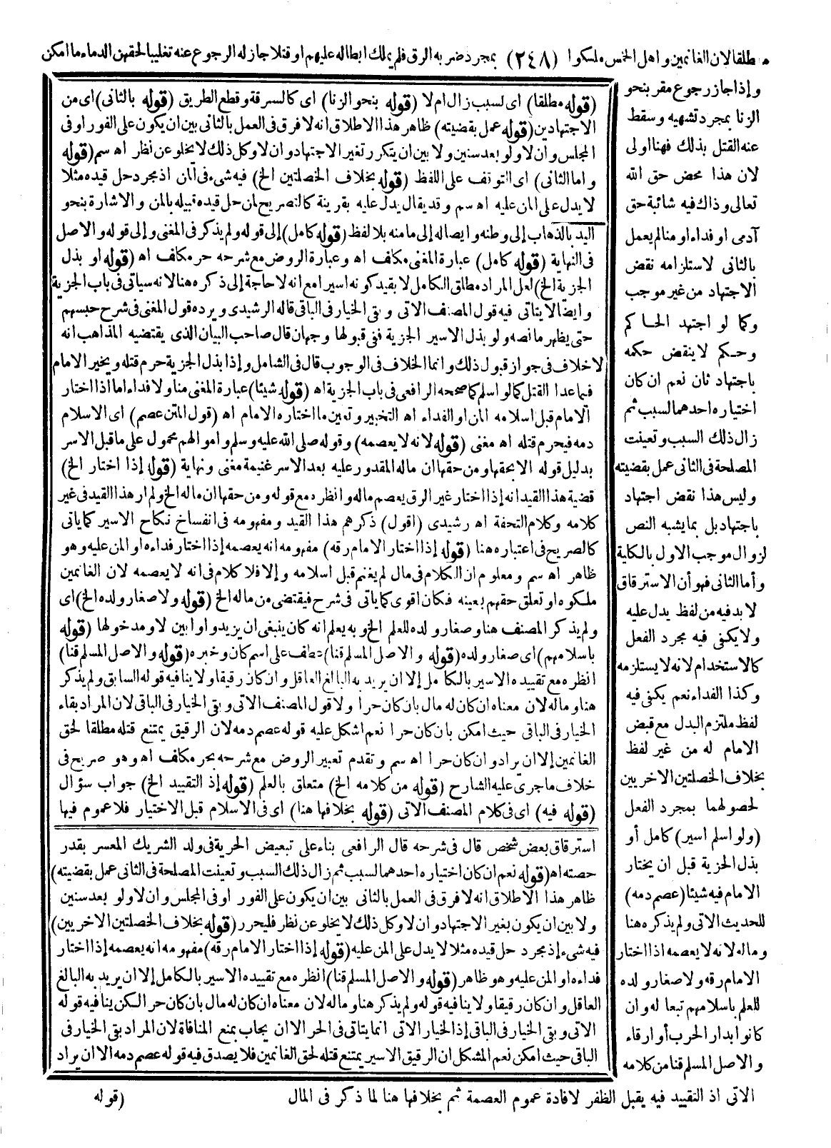 (قَوْلُهُ: إذَا اخْتَارَ الْإِمَامُ رِقَّهُ) مَفْهُومُهُ أَنَّهُ يَعْصِمُهُ إذَا اخْتَارَ فِدَاءَهُ أَوْ الْمَنَّ عَلَيْهِ وَهُوَ ظَاهِرٌ. (قَوْلُهُ: وَالْأَصْلُ الْمُسْلِمُ قِنًّا) اُنْظُرْهُ مَعَ تَقْيِيدِهِ الْأَسِيرَ بِالْكَامِلِ إلَّا أَنْ يُرِيدَ بِهِ الْبَالِغَ الْعَاقِلَ وَإِنْ كَانَ رَقِيقًا وَلَا يُنَافِيهِ قَوْلُهُ: وَلَمْ يُذْكَرْ هُنَا وَمَالُهُ؛ لِأَنَّ مَعْنَاهُ إنْ كَانَ لَهُ مَالٌ بِأَنْ كَانَ حُرًّا لَكِنْ يُنَافِيهِ قَوْلُهُ الْآتِي وَبَقِيَ الْخِيَارُ فِي الْبَاقِي إذْ الْخِيَارُ الْآتِي إنَّمَا يَتَأَتَّى فِي الْحَرِّ إلَّا أَنْ يُجَابَ بِمَنْعِ الْمُنَافَاةِ لِأَنَّ الْمُرَادَ بَقِيَ الْخِيَارُ فِي الْبَاقِي حَيْثُ أَمْكَنَ نَعَمْ الْمُشْكِلُ أَنَّ الرَّقِيقَ الْأَسِيرَ يَمْتَنِعُ قَتْلُهُ لِحَقِّ الْغَانِمِينَ فَلَا يَصْدُقُ فِيهِ قَوْلُهُ: عَصَمَ دَمَهُ إلَّا أَنْ يُرَادَ