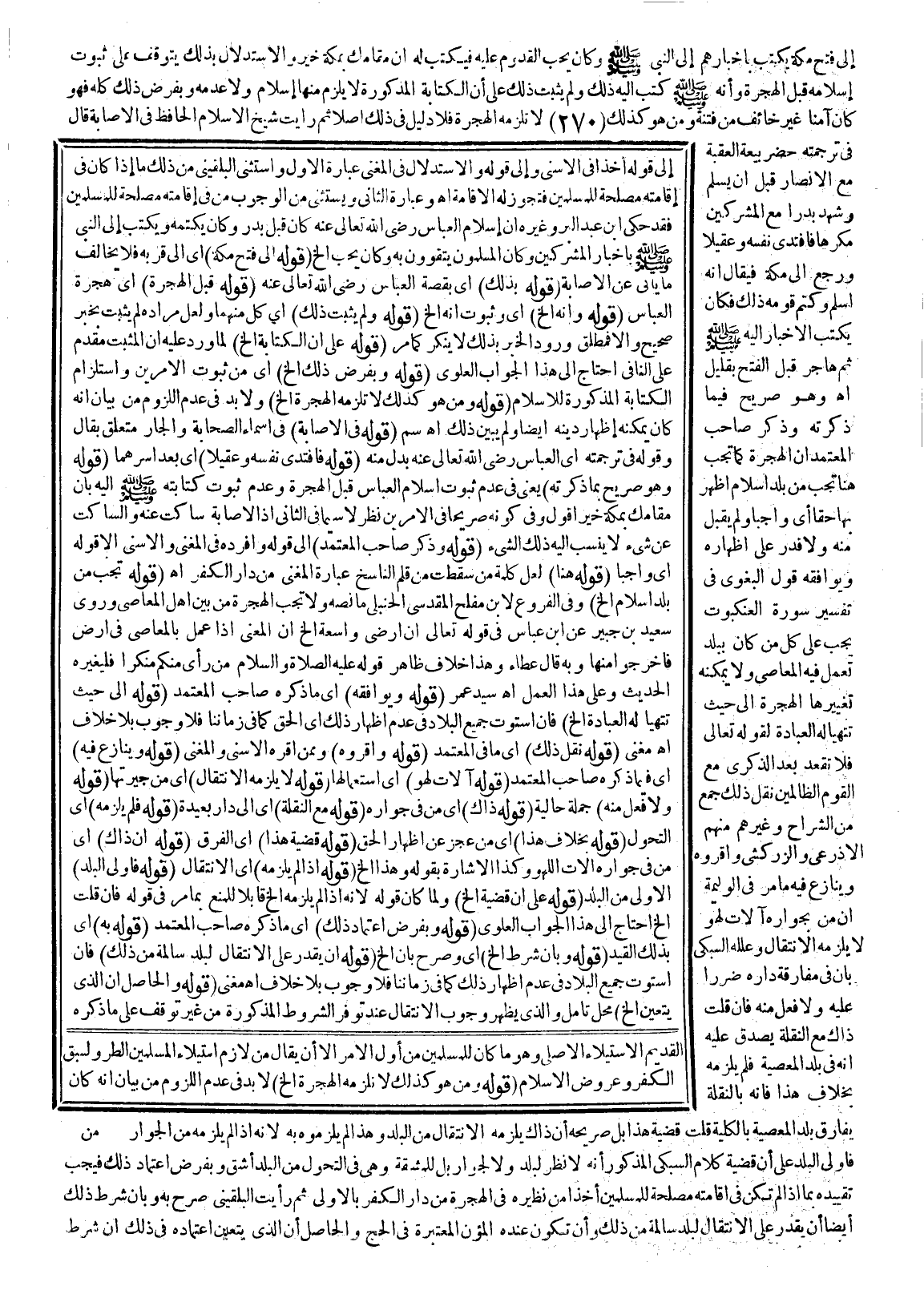 إلَى فَتْحِ مَكَّةَ يَكْتُبُ بِأَخْبَارِهِمْ إلَى النَّبِيِّ - صَلَّى اللَّهُ عَلَيْهِ وَسَلَّمَ - وَكَانَ يُحِبُّ الْقُدُومَ عَلَيْهِ فَيَكْتُبُ لَهُ إنَّ مُقَامَك بِمَكَّةَ خَيْرٌ وَالِاسْتِدْلَالُ بِذَلِكَ يَتَوَقَّفُ عَلَى ثُبُوتِ إسْلَامِهِ قَبْلَ الْهِجْرَةِ وَأَنَّهُ - صَلَّى اللَّهُ عَلَيْهِ وَسَلَّمَ - كَتَبَ إلَيْهِ ذَلِكَ وَلَمْ يَثْبُتْ ذَلِكَ عَلَى أَنَّ الْكِتَابَةَ الْمَذْكُورَةَ لَا يَلْزَمُ مِنْهَا إسْلَامٌ وَلَا عَدَمُهُ وَبِفَرْضِ ذَلِكَ كُلِّهِ فَهُوَ كَانَ آمِنًا غَيْرَ خَائِفٍ مِنْ فِتْنَةٍ وَمَنْ هُوَ كَذَلِكَ لَا تَلْزَمُهُ الْهِجْرَةُ فَلَا دَلِيلَ فِي ذَلِكَ أَصْلًا، ثُمَّ رَأَيْت شَيْخَ الْإِسْلَامِ الْحَافِظَ فِي الْإِصَابَةِ قَالَ فِي تَرْجَمَتِهِ: حَضَرَ بَيْعَةَ الْعَقَبَةِ مَعَ الْأَنْصَارِ قَبْلَ أَنْ يُسْلِمَ وَشَهِدَ بَدْرًا مَعَ الْمُشْرِكِينَ مُكْرَهًا فَافْتَدَى نَفْسَهُ وَعُقَيْلًا وَرَجَعَ إلَى مَكَّةَ فَيُقَالُ: إنَّهُ أَسْلَمَ وَكَتَمَ قَوْمَهُ ذَلِكَ فَكَانَ يَكْتُبُ الْأَخْبَارَ إلَيْهِ - صَلَّى اللَّهُ عَلَيْهِ وَسَلَّمَ -، ثُمَّ هَاجَرَ قَبْلَ الْفَتْحِ بِقَلِيلٍ انْتَهَى وَهُوَ صَرِيحٌ فِيمَا ذَكَرْته.