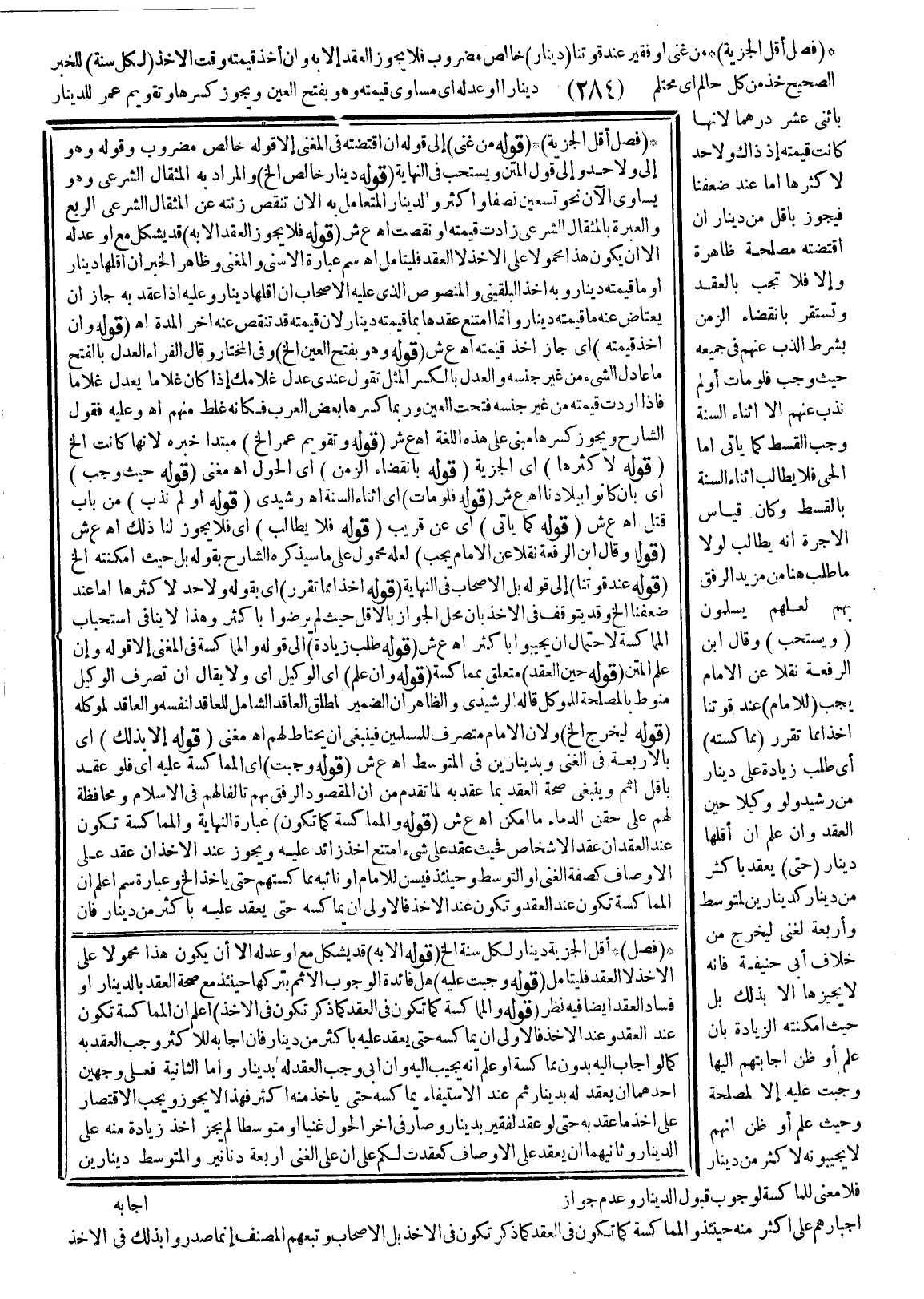 ظَاهِرَةٌ وَإِلَّا فَلَا تَجِبُ بِالْعَقْدِ وَتَسْتَقِرُّ بِانْقِضَاءِ الزَّمَنِ بِشَرْطِ الذَّبِّ عَنْهُمْ فِي جَمِيعِهِ حَيْثُ وَجَبَ فَلَوْ مَاتَ أَوْ لَمْ نَذُبَّ عَنْهُمْ إلَّا أَثْنَاءَ السَّنَةِ وَجَبَ الْقِسْطُ كَمَا يَأْتِي، أَمَّا الْحَيُّ فَلَا يُطَالَبُ أَثْنَاءَ السَّنَةِ بِالْقِسْطِ وَكَانَ قِيَاسُ الْأُجْرَةِ أَنَّهُ يُطَالَبُ لَوْلَا مَا طُلِبَ هُنَا مِنْ مَزِيدِ الرِّفْقِ بِهِمْ لَعَلَّهُمْ يُسْلِمُونَ. (وَيُسْتَحَبُّ) وَقَالَ ابْنُ الرِّفْعَةِ نَقْلًا عَنْ الْإِمَامِ يَجِبُ. (لِلْإِمَامِ) عِنْدَ قُوَّتِنَا أَخْذًا مِمَّا تَقَرَّرَ (مُمَاكَسَتُهُ) أَيْ طَلَبُ زِيَادَةٍ عَلَى دِينَارٍ مِنْ رَشِيدٍ وَلَوْ وَكِيلًا حِينَ الْعَقْدِ وَإِنْ عَلِمَ أَنَّ أَقَلَّهَا دِينَارٌ. (حَتَّى) يَعْقِدَ بِأَكْثَرَ مِنْ دِينَارٍ كَدِينَارَيْنِ لِمُتَوَسِّطٍ وَأَرْبَعَةٍ لِغَنِيٍّ لِيَخْرُجَ مِنْ خِلَافِ أَبِي حَنِيفَةَ فَإِنَّهُ لَا يُجِيزُهَا إلَّا بِذَلِكَ بَلْ حَيْثُ أَمْكَنَتْهُ الزِّيَادَةُ بِأَنْ عَلِمَ أَوْ ظَنَّ إجَابَتَهُمْ إلَيْهَا وَجَبَتْ عَلَيْهِ إلَّا لِمَصْلَحَةٍ وَحَيْثُ عَلِمَ أَوْ ظَنَّ أَنَّهُمْ لَا يُجِيبُونَهُ لِأَكْثَرَ مِنْ دِينَارٍ فَلَا مَعْنَى لِلْمُمَاكَسَةِ لِوُجُوبِ قَبُولِ الدِّينَارِ وَعَدَمِ جَوَازِ إجْبَارِهِمْ عَلَى أَكْثَرَ مِنْهُ حِينَئِذٍ وَالْمُمَاكَسَةُ كَمَا تَكُونُ فِي الْعَقْدِ كَمَا ذُكِرَ تَكُونُ فِي الْأَخْذِ بَلْ الْأَصْحَابُ وَتَبِعَهُمْ الْمُصَنِّفُ إنَّمَا صَدَّرُوا بِذَلِكَ فِي الْأَخْذِ