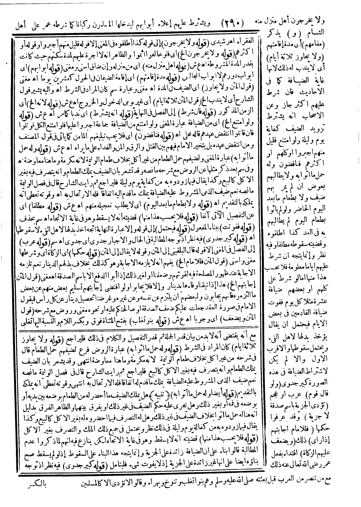 وَلَا يُخْرِجُونَ أَهْلَ مَنْزِلٍ مِنْهُ وَيُشْتَرَطُ عَلَيْهِمْ إعْلَاءُ أَبْوَابِهِمْ لِيَدْخُلَهَا الْمُسْلِمُونَ رُكْبَانًا كَمَا شَرَطَهُ عُمَرُ عَلَى أَهْلِ الشَّامِ. (وَ) يَذْكُرُ. (مُقَامَهُمْ) أَيْ مُدَّةَ إقَامَتِهِمْ. (وَلَا يُجَاوِزُ ثَلَاثَةَ أَيَّامٍ) أَيْ لَا يُنْدَبُ لَهُ ذَلِكَ؛ لِأَنَّهَا غَايَةُ الضِّيَافَةِ كَمَا فِي الْأَحَادِيثِ فَإِنْ شَرَطَ عَلَيْهِمْ أَكْثَرَ جَازَ وَعَنْ الْأَصْحَابِ أَنَّهُ يُشْتَرَطُ تَزْوِيدُ الضَّيْفِ كِفَايَةَ يَوْمٍ وَلَيْلَةٍ وَلَوْ امْتَنَعَ قَلِيلٌ مِنْهُمْ أُجْبِرُوا أَوْ كُلُّهُمْ أَوْ أَكْثَرُهُمْ فَنَاقِضُونَ وَلَهُ حَمْلُ مَا أَتَوْا بِهِ وَلَا يُطَالِبُهُمْ بِعِوَضٍ إنْ لَمْ يَمُرَّ بِهِمْ ضَيْفٌ وَلَا بِطَعَامِ مَا بَعْدَ الْيَوْمِ الْحَاضِرِ وَلَوْ لَمْ يَأْتُوا بِطَعَامِ الْيَوْمِ لَمْ يُطَالِبْهُمْ بِهِ فِي الْغَدِ كَذَا أَطْلَقُوهُ وَقَضِيَّتُهُ: سُقُوطُهُ مُطْلَقًا وَفِيهِ نَظَرٌ، وَإِنَّمَا يُتَّجَهُ إنْ شُرِطَ عَلَيْهِمْ أَيَّامٌ مَعْلُومَةٌ فَلَا يُحْسَبُ هَذَا مِنْهَا، أَمَّا لَوْ شُرِطَ عَلَى كُلِّهِمْ أَوْ بَعْضِهِمْ ضِيَافَةُ عَشْرَةٍ مَثَلًا كُلَّ يَوْمٍ فَفَوَّتَ ضِيَافَةَ الْقَادِمِينَ فِي بَعْضِ الْأَيَّامِ فَيُحْتَمَلُ أَنْ يُقَالَ يُؤْخَذُ بَدَلُهَا لِأَهْلِ الْفَيْءِ وَيُحْتَمَلُ سُقُوطُهَا وَالْأَقْرَبُ الْأَوَّلُ وَإِلَّا لَمْ يَكُنْ لِاشْتِرَاطِ الضِّيَافَةِ فِي هَذِهِ الصُّورَةِ كَبِيرُ جَدْوَى