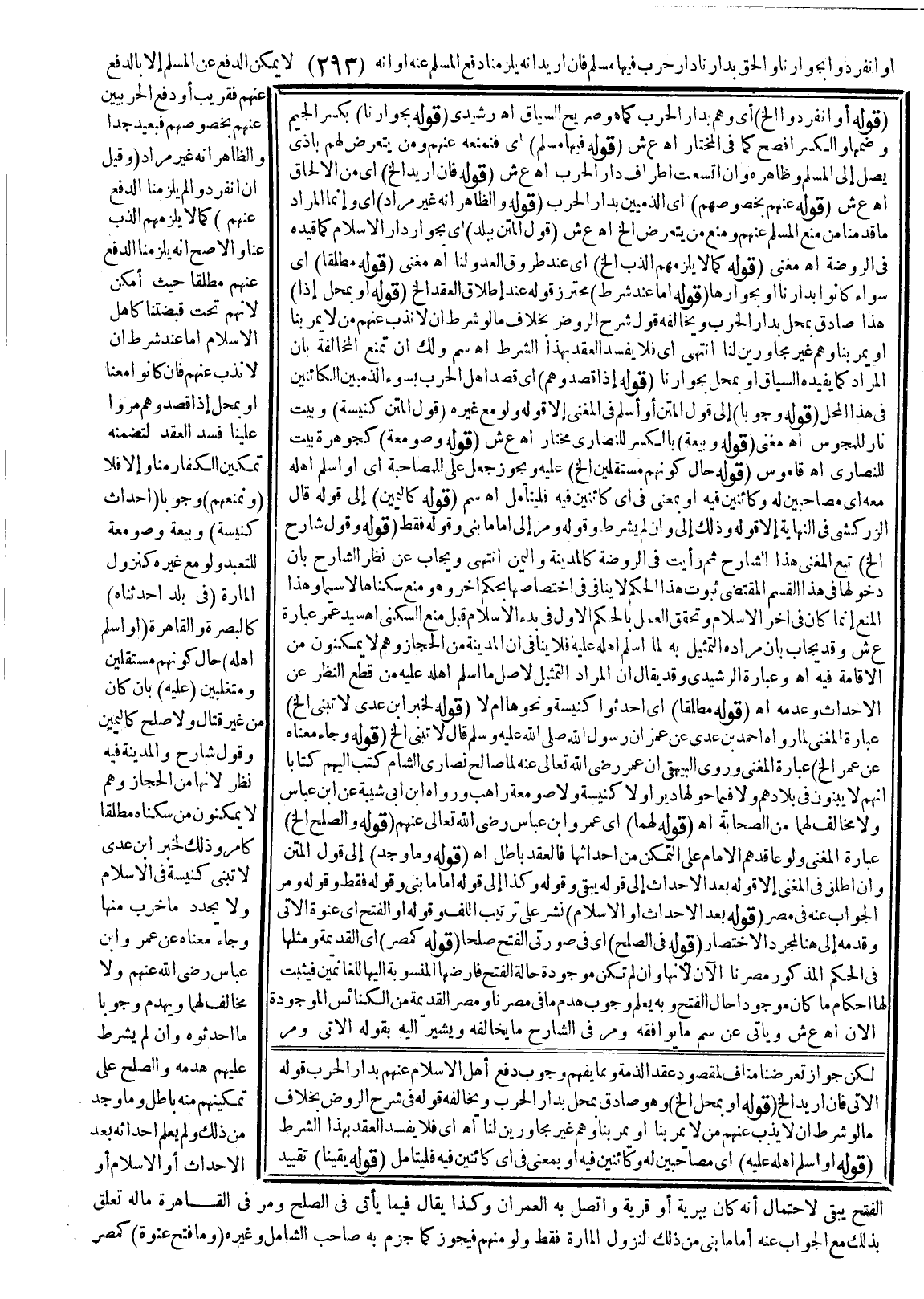 ـــــــــــــــــــــــــــــSلَكِنْ جَوَازُ تَعَرُّضِنَا مُنَافٍ لِمَقْصُودِ عَقْدِ الذِّمَّةِ، وَمِمَّا يُفْهِمُ وُجُوبَ دَفْعِ أَهْلِ الْإِسْلَامِ عَنْهُمْ بِدَارِ الْحَرْبِ قَوْلُهُ: الْآتِي فَإِنْ أُرِيدَ إلَخْ. (قَوْلُهُ: أَوْ بِمَحَلٍّ إلَخْ.) ، وَهُوَ صَادِقٌ بِمَحَلٍّ بِدَارِ الْحَرْبِ، وَيُخَالِفُهُ قَوْلُهُ: فِي شَرْحِ الرَّوْضِ بِخِلَافِ مَا لَوْ شُرِطَ أَنْ لَا يُنْدَبَ عَنْهُمْ مَنْ لَا يَمُرُّ بِنَا، أَوْ يَمُرُّ بِنَا، وَهُمْ غَيْرُ مُجَاوِرِينَ لَنَا. اهـ. أَيْ: فَلَا يَفْسُدُ الْعَقْدُ بِهَذَا الشَّرْطِ