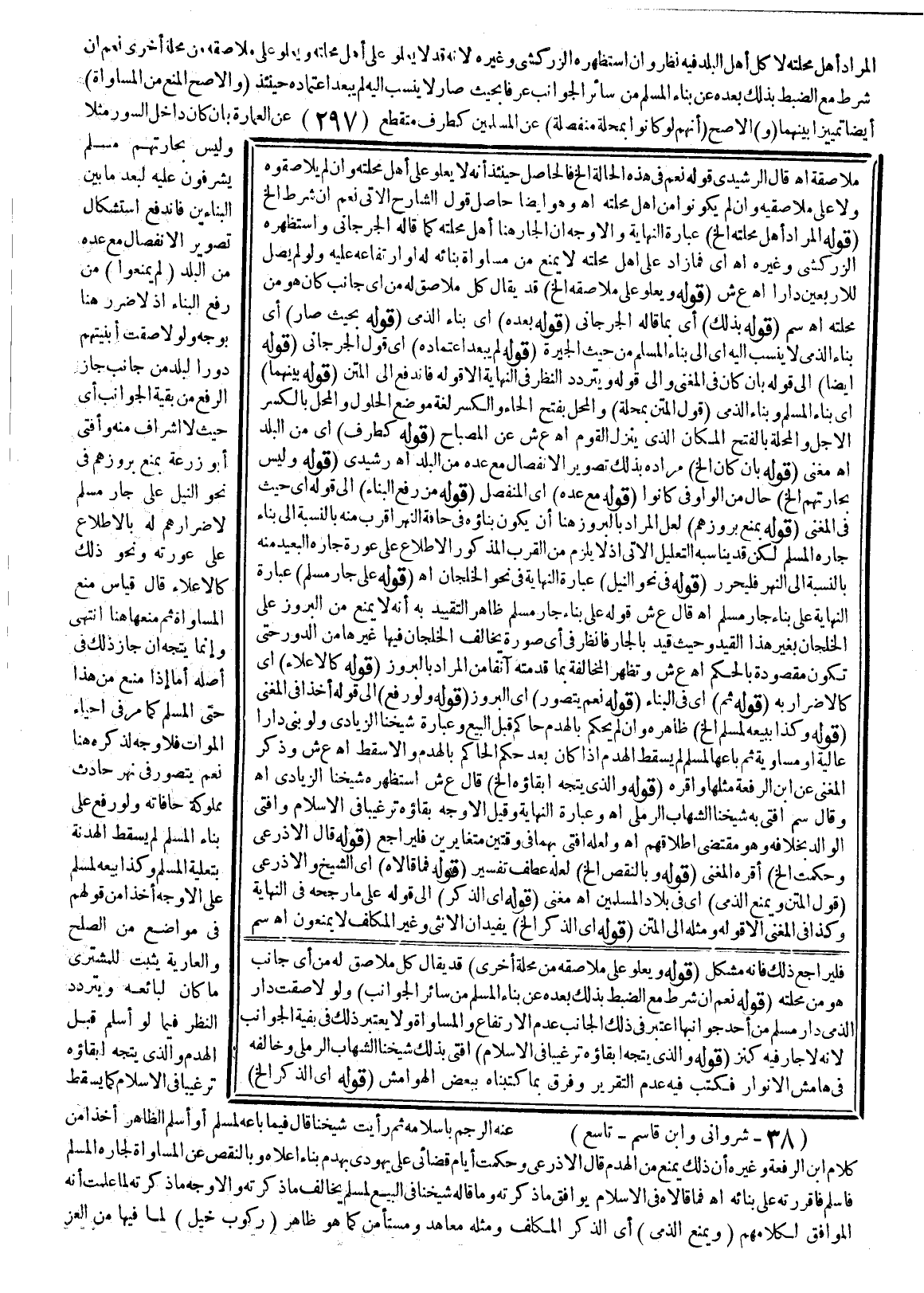 (قَوْلُهُ: وَيَعْلُو عَلَى مُلَاصِقِهِ مِنْ مَحَلَّةٍ أُخْرَى) قَدْ يُقَالُ: كُلُّ مُلَاصِقٍ لَهُ مِنْ أَيِّ جَانِبٍ هُوَ مِنْ مَحَلَّتِهِ (قَوْلُهُ: نَعَمْ إنْ شُرِطَ مَعَ الضَّبْطِ بِذَلِكَ بُعْدُهُ عَنْ بِنَاءِ الْمُسْلِمِ مِنْ سَائِرِ الْجَوَانِبِ إلَخْ.) ، وَلَوْ لَاصَقَتْ دَارُ الذِّمِّيِّ دَارَ مُسْلِمٍ مِنْ أَحَدِ جَوَانِبِهَا اُعْتُبِرَ فِي ذَلِكَ الْجَانِبِ عَدَمُ الِارْتِفَاعِ، وَالْمُسَاوَاةِ، وَلَا يُعْتَبَرُ ذَلِكَ فِي بَقِيَّةِ الْجَوَانِبِ؛ لِأَنَّهُ لَا جَارَ فِيهِ كَنْزٌ (قَوْلُهُ: وَاَلَّذِي يُتَّجَهُ إبْقَاؤُهُ تَرْغِيبًا فِي الْإِسْلَامِ إلَخْ.) أَفْتَى بِذَلِكَ شَيْخُنَا الشِّهَابُ الرَّمْلِيُّ، وَخَالَفَهُ فِي هَامِشِ الْأَنْوَارِ فَكَتَبَ فِيهِ عَدَمُ التَّقْرِيرِ، وَفَرَّقَ بِمَا كَتَبْنَاهُ بِبَعْضِ الْهَوَامِشِ