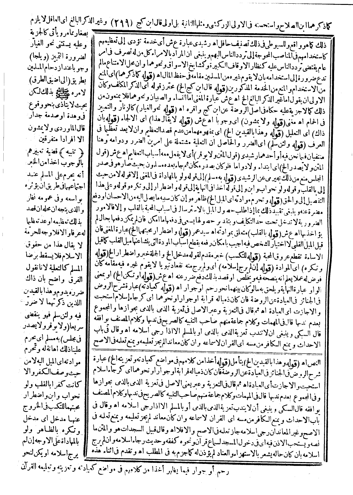 ثُمَّ قَالَ فِي التَّعْزِيَةِ: وَعَبَّرَ يَعْنِي: الْأَصْلَ فِي تَعْزِيَةِ الذِّمِّيِّ بِالذِّمِّيِّ بِجَوَازِهَا، وَفِي الْمَجْمُوعِ بِعَدَمِ نَدْبِهَا قَالَ فِي الْمُهِمَّاتِ: وَكَلَامُ جَمَاعَةٍ مِنْهُمْ صَاحِبُ التَّنْبِيهِ كَالصَّرِيحِ فِي نَدْبِهَا، وَكَلَامُ الْمُصَنِّفِ يُوَافِقُهُ قَالَ السُّبْكِيُّ وَيَنْبَغِي أَنْ لَا يُنْدَبَ تَعْزِيَةُ الذِّمِّيِّ بِالذِّمِّيِّ، أَوْ بِالْمُسْلِمِ إلَّا إذَا رُجِيَ إسْلَامُهُ. اهـ. وَقَالَ فِي بَابِ الْأَحْدَاثِ: وَيُمْنَعُ الْكَافِرُ مِنْ مَسِّهِ أَيْ: الْقُرْآنِ لَا سَمَاعِهِ، وَإِنْ كَانَ مُعَانِدًا لَمْ يَجُزْ تَعْلِيمُهُ، وَيُمْنَعُ تَعَلُّمُهُ فِي الْأَصَحِّ، وَغَيْرُ الْمُعَانِدِ إنْ رُجِيَ إسْلَامُهُ جَازَ تَعَلُّمُهُ فِي الْأَصَحِّ، وَإِلَّا فَلَا. اهـ. وَقَالَ قُبَيْلَ السَّجَدَاتِ هُوَ وَالْمَتْنُ مَا نَصُّهُ، وَيُسْتَحَبُّ الْإِذْنُ فِيهِ أَيْ: فِي دُخُولِ الْمَسْجِدِ لِسَمَاعِ قُرْآنٍ، وَنَحْوِهِ كَفِقْهٍ، وَحَدِيثٍ رَجَاءَ إسْلَامِهِ، وَإِنْ لَمْ يُرْجَ إسْلَامُهُ بِأَنْ كَانَ حَالُهُ يُشْعِرُ بِالِاسْتِهْزَاءِ، وَالْعِنَادِ لَمْ يُؤْذَنْ لَهُ كَمَا جَزَمَ بِهِ فِي الْمَطْلَبِ. اهـ. وَتَقَدَّمَ فِي أَثْنَاءِ هَذِهِ