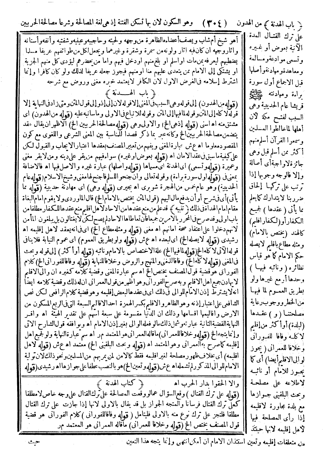 مِنْ الْهُدُونِ، وَهُوَ السُّكُونُ؛ لِأَنَّ بِهَا تَسْكُنُ الْفِتْنَةُ؛ إذْ هِيَ لُغَةً الْمُصَالَحَةُ، وَشَرْعًا مُصَالَحَةُ الْحَرْبِيِّينَ عَلَى تَرْكِ الْقِتَالِ الْمُدَّةَ الْآتِيَةَ بِعِوَضٍ، أَوْ غَيْرِهِ، وَتُسَمَّى مُوَادَعَةً، وَمُسَالَمَةً، وَمُعَاهَدَةً، وَمُهَادَنَةً، وَأَصْلُهَا قَبْلَ الْإِجْمَاعِ أَوَّلُ سُورَةِ بَرَاءَةٍ، وَمُهَادَنَتُهُ - صَلَّى اللَّهُ عَلَيْهِ وَسَلَّمَ - قُرَيْشًا عَامَ الْحُدَيْبِيَةِ، وَهِيَ السَّبَبُ لِفَتْحِ مَكَّةَ؛ لِأَنَّ أَهْلَهَا لَمَّا خَالَطُوا الْمُسْلِمِينَ، وَسَمِعُوا الْقُرْآنَ أَسْلَمَ مِنْهُمْ أَكْثَرُ مِمَّنْ أَسْلَمَ قَبْلُ، وَهِيَ جَائِزَةٌ لَا وَاجِبَةٌ أَيْ: أَصَالَةً، وَإِلَّا فَالْوَجْهُ وُجُوبُهَا إذَا تَرَتَّبَ عَلَى تَرْكِهَا إلْحَاقُ ضَرَرٍ بِنَا لَا يُتَدَارَكُ كَمَا يُعْلَمُ مِمَّا يَأْتِي (عَقْدُهَا) لِجَمِيعِ الْكُفَّارِ، أَوْ (لِكُفَّارِ إقْلِيمٍ) كَالْهِنْدِ (يَخْتَصُّ بِالْإِمَامِ)