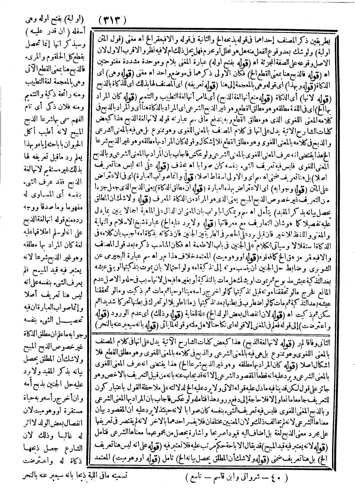 فَالذَّبْحُ هُنَا بِمَعْنَى الْقَطْعِ الْآتِي، وَهِيَ بِالْمُعْجَمَةِ لُغَةً التَّطْيِيبُ، وَمِنْهُ رَائِحَةٌ ذَكِيَّةٌ، وَالتَّتْمِيمُ، وَمِنْهُ فُلَانٌ ذَكِيٌّ أَيْ: تَامُّ الْفَهْمِ سُمِّيَ بِهَا شَرْعًا الذَّبْحُ الْمُبِيحُ؛ لِأَنَّهُ يُطَيِّبُ أَكْلَ الْحَيَوَانِ بِإِبَاحَتِهِ إيَّاهُ، وَبِهَذَا يُعْلَمُ رَدُّ مَا قِيلَ تَعْرِيفُهُ لَهَا بِذَلِكَ غَيْرُ مُسْتَقِيمٍ؛ لِأَنَّهَا لُغَةً الذَّبْحُ فَقَدْ عَرَّفَ الشَّيْءَ بِنَفْسِهِ أَيْ: الْمُسَاوِي لَهُ مَفْهُومًا، وَمَاصَدَقًا، وَوَجْهُ رَدِّهِ مَنْعُ قَوْلِهِ: أَنَّهَا لُغَةً الذَّبْحُ عَلَى أَنَّهُ لَوْ سَلِمَ إطْلَاقُهَا عَلَيْهِ لُغَةً كَانَ الْمُرَادُ بِهَا مُطْلَقُهُ، وَهُوَ غَيْرُ الذَّبْحِ شَرْعًا؛ لِأَنَّهُ يُعْتَبَرُ فِيهِ قَيْدُ الْمُبِيحِ فَلَمْ يُعَرِّفْ الشَّيْءَ بِنَفْسِهِ عَلَى أَنَّهُ لَيْسَ هُنَا تَعْرِيفٌ أَصْلًا، وَإِنَّمَا صَوَابُ الْعِبَارَةِ أَنَّ فِيهِ تَحْصِيلَ الشَّيْءِ بِنَفْسِهِ
