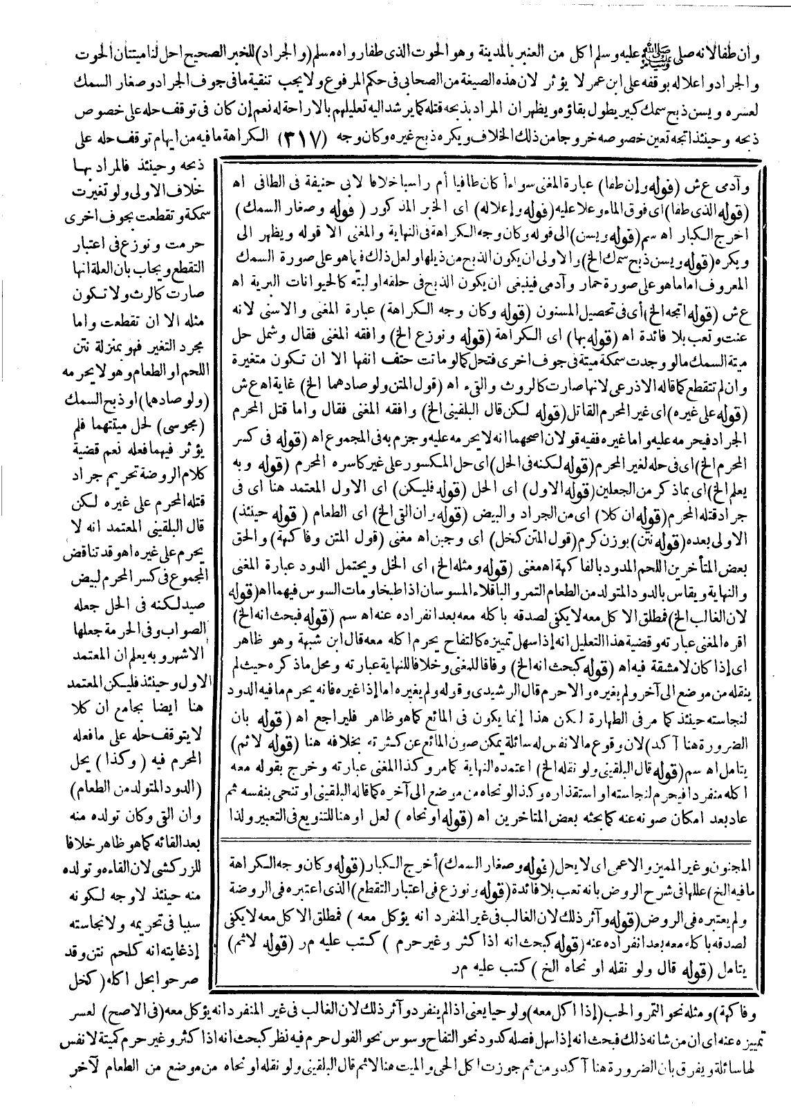 وَإِعْلَالُهُ بِوَقْفِهِ عَلَى ابْنِ عُمَرَ لَا يُؤَثِّرُ؛ لِأَنَّ هَذِهِ الصِّيغَةَ مِنْ الصَّحَابِيِّ فِي حُكْمِ الْمَرْفُوعِ، وَلَا يَجِبُ تَنْقِيَةُ مَا فِي جَوْفِ الْجَرَادِ، وَصِغَارِ السَّمَكِ لِعُسْرِهِ، وَيُسَنُّ ذَبْحُ سَمَكٍ كَبِيرٍ يَطُولُ بَقَاؤُهُ، وَيَظْهَرُ أَنَّ الْمُرَادَ بِذَبْحِهِ قَتْلُهُ كَمَا يُرْشِدُ إلَيْهِ تَعْلِيلُهُمْ بِالْإِرَاحَةِ لَهُ نَعَمْ إنْ كَانَ فِي تَوَقُّفِ حِلِّهِ عَلَى خُصُوصِ ذَبْحِهِ خِلَافٌ اتَّجَهَ تَعَيُّنُ خُصُوصِهِ خُرُوجًا مِنْ ذَلِكَ الْخِلَافِ، وَيُكْرَهُ ذَبْحُ غَيْرِهِ، وَكَأَنَّ وَجْهَ الْكَرَاهَةِ مَا فِيهِ مِنْ إيهَامِ تَوَقُّفِ حِلِّهِ عَلَى ذَبْحِهِ، وَحِينَئِذٍ فَالْمُرَادُ بِهَا خِلَافُ الْأَوْلَى، وَلَوْ تَغَيَّرَتْ سَمَكَةٌ، وَتَقَطَّعَتْ بِجَوْفِ أُخْرَى حَرُمَتْ