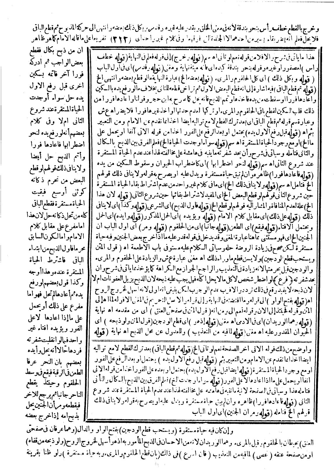 وَكَذَا قَوْلُ بَعْضِهِمْ لَوْ رَفَعَ يَدَهُ ثُمَّ أَعَادَهَا لَمْ تَحِلَّ فَهُوَ إمَّا مُفَرَّعٌ عَلَى ذَلِكَ، أَوْ يُحْمَلُ عَلَى مَا إذَا أَعَادَهَا لَا عَلَى الْفَوْرِ، وَيُؤَيِّدُهُ إفْتَاءُ غَيْرِ وَاحِدٍ فِيمَا لَوْ انْقَلَبَتْ شَفْرَتُهُ فَرَدَّهَا حَالًا أَنَّهُ يَحِلُّ، وَأَيَّدَهُ بَعْضُهُمْ بِأَنَّ النَّحْرَ عُرْفًا الطَّعْنُ فِي الرَّقَبَةِ فَيَقَعُ فِي وَسَطِ الْحُلْقُومِ، وَحِينَئِذٍ يَقْطَعُ النَّاحِرَ جَانِبًا، ثُمَّ يَرْجِعُ لِلْآخَرِ فَيَقْطَعُهُ، وَمَرَّ أَنَّ الْجَنِينَ يَحِلُّ بِذَبْحِ أُمِّهِ إذَا خَرَجَ بَعْضُهُ، وَإِنْ كَانَ فِيهِ حَيَاةً مُسْتَقِرَّةً.