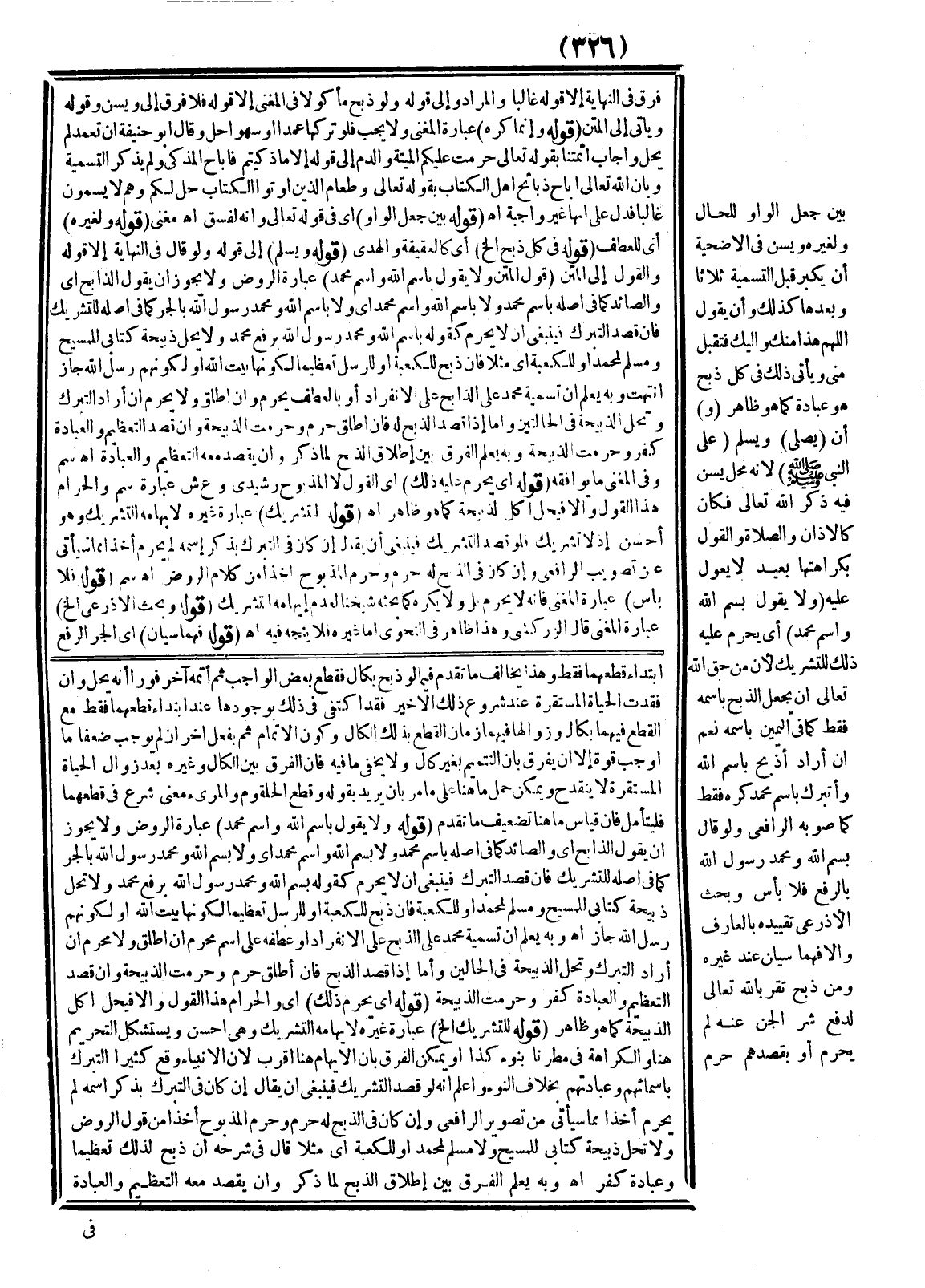 (قَوْلُهُ: بَيْنَ جَعْلِ الْوَاوِ) أَيْ: فِي قَوْله تَعَالَى {وَإِنَّهُ لَفِسْقٌ} [الأنعام: 121] اهـ. مُغْنِي (قَوْلُهُ: وَلِغَيْرِهِ) أَيْ: لِلْعَطْفِ (قَوْلُهُ: فِي كُلِّ ذَبْحٍ إلَخْ) أَيْ: كَالْعَقِيقَةِ، وَالْهَدْيِ (قَوْلُهُ: وَيُسَلِّمُ) إلَى قَوْلِهِ: وَلَوْ قَالَ فِي النِّهَايَةِ إلَّا قَوْلَهُ: وَالْقَوْلُ إلَى الْمَتْنِ (قَوْلُ الْمَتْنِ، وَلَا يَقُولُ بِاسْمِ اللَّهِ، وَاسْمِ مُحَمَّدٍ) عِبَارَةُ الرَّوْضِ، وَلَا يَجُوزُ أَنْ يَقُولَ الذَّابِحُ أَيْ: وَالصَّائِدُ كَمَا فِي أَصْلِهِ بِاسْمِ مُحَمَّدٍ، وَلَا بِاسْمِ اللَّهِ، وَاسْمِ مُحَمَّدٍ أَيْ: وَلَا بِاسْمِ اللَّهِ، وَمُحَمَّدٍ رَسُولِ اللَّهِ بِالْجَرِّ كَمَا فِي أَصْلِهِ لِلتَّشْرِيكِ، فَإِنْ قَصَدَ التَّبَرُّكَ، فَيَنْبَغِي أَنْ لَا يَحْرُمَ كَقَوْلِهِ: بِاسْمِ اللَّهِ، وَمُحَمَّدٌ رَسُولُ اللَّهِ بِرَفْعِ مُحَمَّدٍ، وَلَا يَحِلُّ ذَبِيحَةُ كِتَابِيٍّ لِلْمَسِيحِ، وَمُسْلِمٍ لِمُحَمَّدٍ، أَوْ لِلْكَعْبَةِ أَيْ: مَثَلًا، فَإِنْ ذَبَحَ لِلْكَعْبَةِ، أَوْ لِلرُّسُلِ تَعْظِيمًا لِكَوْنِهَا بَيْتَ اللَّهِ، أَوْ لِكَوْنِهِمْ رُسُلَ اللَّهِ جَازَ انْتَهَتْ، وَبِهِ يُعْلَمُ أَنَّ تَسْمِيَةَ مُحَمَّدٍ عَلَى الذَّبْحِ عَلَى الِانْفِرَادِ، أَوْ بِالْعَطْفِ يَحْرُمُ، وَإِنْ أَطْلَقَ، وَلَا يَحْرُمُ إنْ أَرَادَ التَّبَرُّكَ، وَتَحِلُّ الذَّبِيحَةُ فِي الْحَالَتَيْنِ، وَأَمَّا إذَا قَصَدَ الذَّبْحَ لَهُ، فَإِنْ أَطْلَقَ حَرُمَ، وَحَرُمَتْ الذَّبِيحَةُ، وَإِنْ قَصَدَ التَّعْظِيمَ، وَالْعِبَادَةَ كَفَرَ، وَحَرُمَتْ الذَّبِيحَةُ، وَبِهِ يُعْلَمُ الْفَرْقُ بَيْنَ إطْلَاقِ الذَّبْحِ لِمَا ذُكِرَ، وَأَنْ يُقَيَّدَ مَعَهُ التَّعْظِيمُ، وَالْعِبَادَةُ اهـ. سم، وَفِي الْمُغْنِي مَا يُوَافِقُهُ