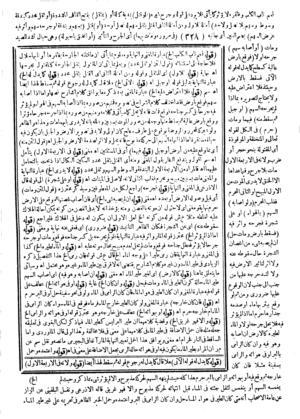 (وَلَوْ أَصَابَهُ) السَّهْمُ (بِالْهَوَاءِ) ، أَوْ عَلَى شَجَرَةٍ فَجَرَحَهُ، وَأَثَّرَ فِيهِ (فَسَقَطَ بِأَرْضٍ، وَمَاتَ حَلَّ) إنْ لَمْ يُصِبْهُ شَيْءٌ مِنْ أَغْصَانِ الشَّجَرَةِ حَالَ سُقُوطِهِ عَنْهُ، وَلَا أَثَرَ لِتَأْثِيرِ الْأَرْضِ فِيهِ، وَلَا لِتَدَحْرُجِهِ عَلَيْهَا مِنْ جَنْبٍ إلَى جَنْبٍ؛ لِأَنَّ الْوُقُوعَ عَلَيْهَا ضَرُورِيٌّ، وَمِنْ ثَمَّ لَوْ وَقَعَ بِبِئْرٍ بِهَا مَاءٌ، أَوْ صَدَمَهُ جِدَارُهَا حَرُمَ، أَمَّا إذَا لَمْ يُؤَثِّرْ فِيهِ فَلَا يَحِلُّ جَرْحُهُ أَوَّلًا، وَالْمَاءُ لِطَيْرِهِ كَالْأَرْضِ إنْ أَصَابَهُ، وَهُوَ فِيهِ، وَإِنْ كَانَ الرَّامِي بِالْبَرِّ، أَوْ فِي هَوَائِهِ، وَالرَّامِي بِسَفِينَةٍ مَثَلًا، فَإِنْ كَانَ خَارِجَهُ ثُمَّ وَقَعَ فِيهِ، أَوْ بِهَوَائِهِ